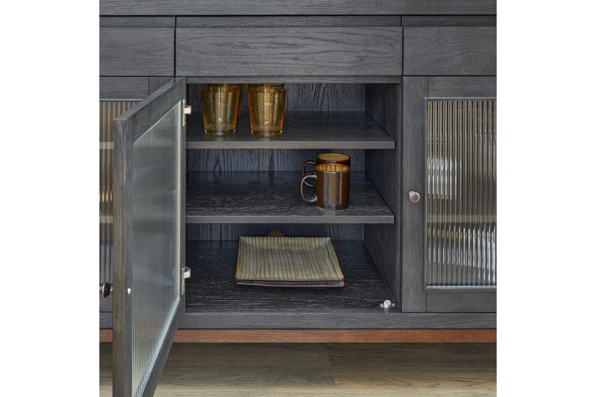 - Three reeded glass front cabinets, each with soft-close hinges, adjustable shelves, and a cutout to pass cords through