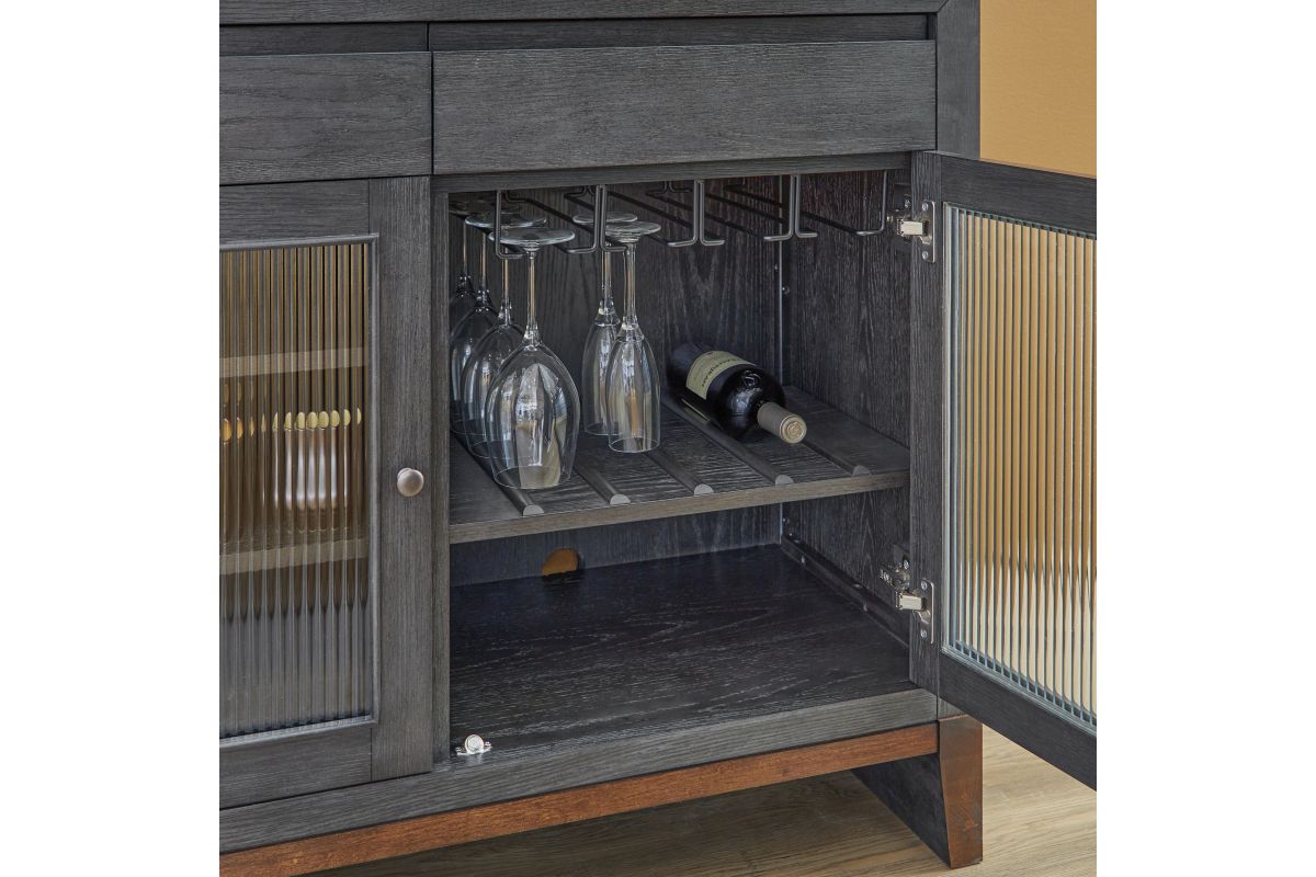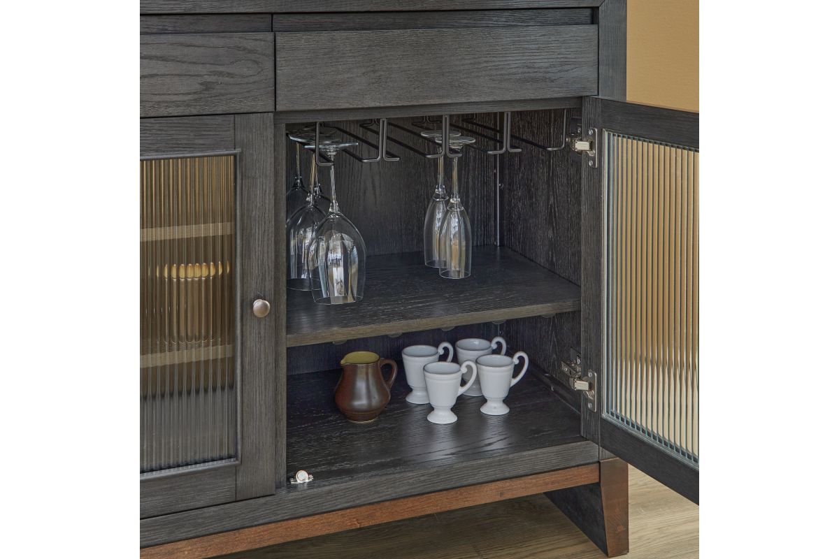 - The right side cabinet includes three wine glass hanging racks, accommodating up to nine glasses