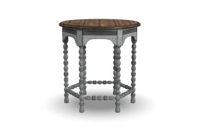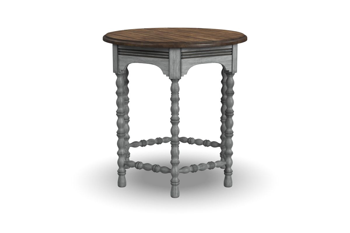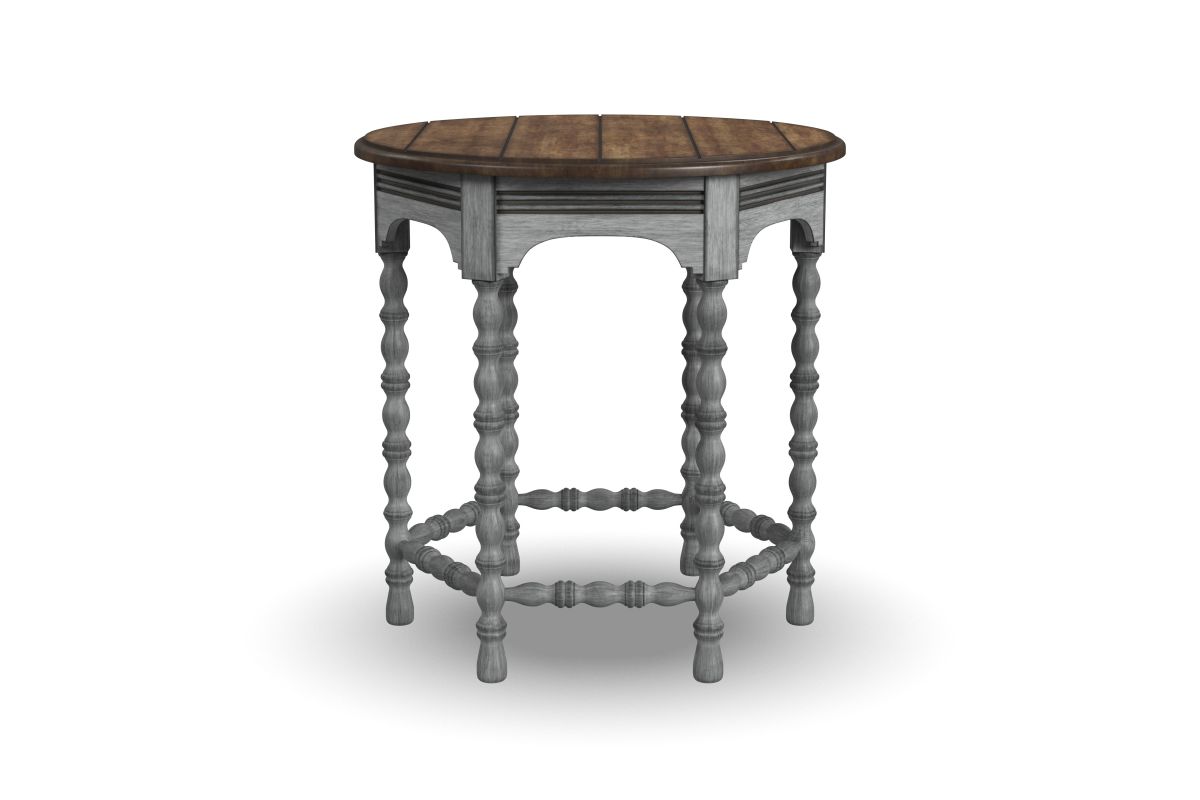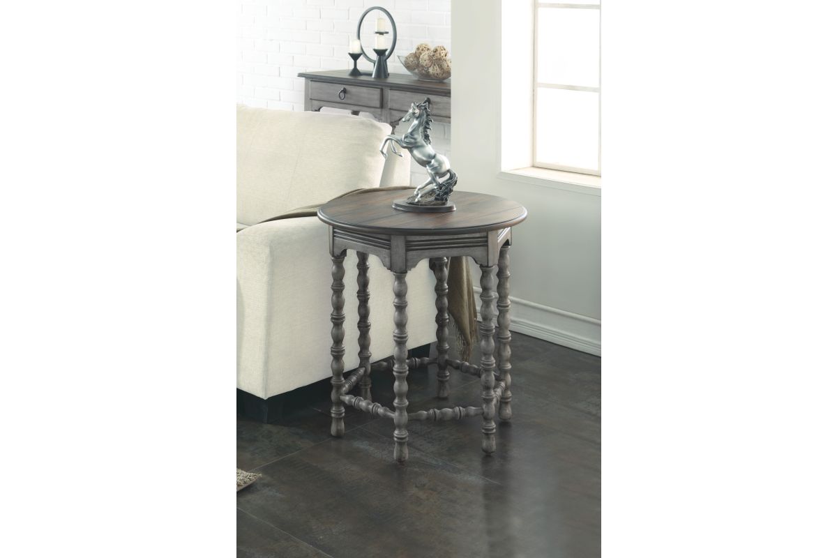 Bring the inviting look of vintage charm to your living spaces with the Plymouth lamp table. Featuring intricately spool-turned legs and trestles, carved accents and a distressed graywash finish with contrasting medium brown top, this table is sure to add warmth and character to your living space.
