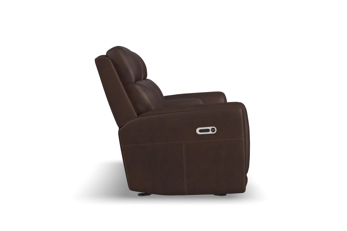 Bring your living room to the next level with the sleek, innovative Alister power gliding loveseat. This transitional style sports sleek curves upholstered in your choice of luxurious top-grain leather. A step above typical reclining, these gliding seats provide a smooth, versatile, and unique experience. The ultimate in futuristic comfort, this loveseat includes a center console with two cupholders, a wireless charging pad, and storage to keep your devices charged and within reach. Customize your comfort with a power control that adjusts recline, headrest, and lumbar support. Kick back in the Alister, the future of relaxation.