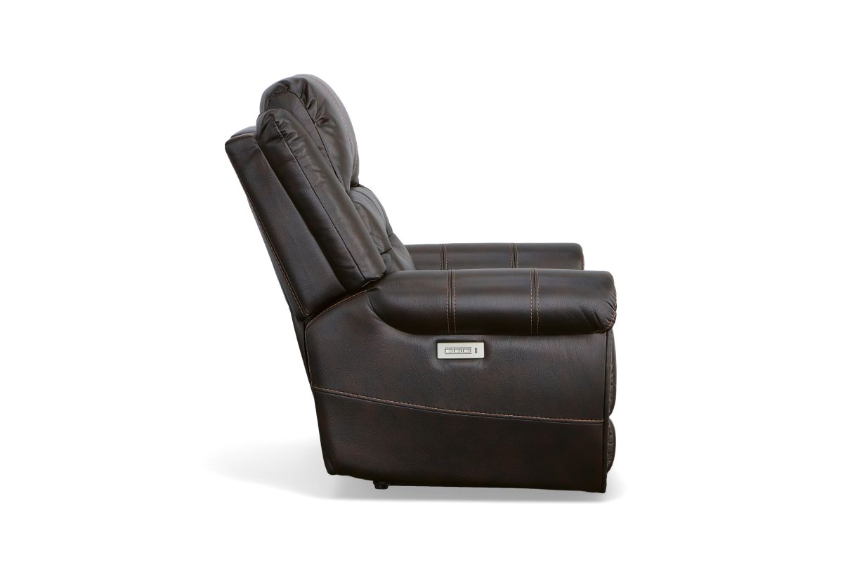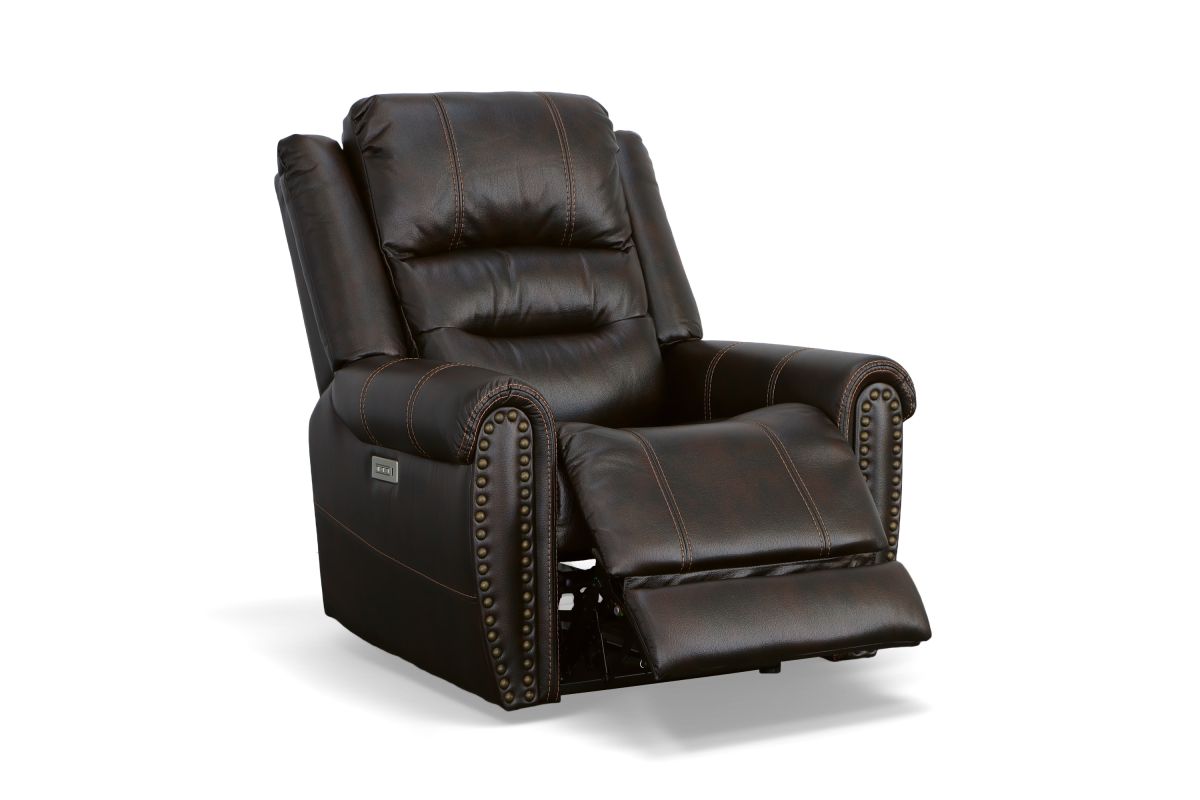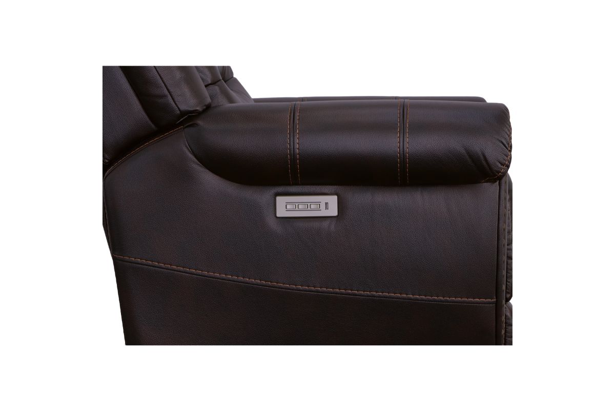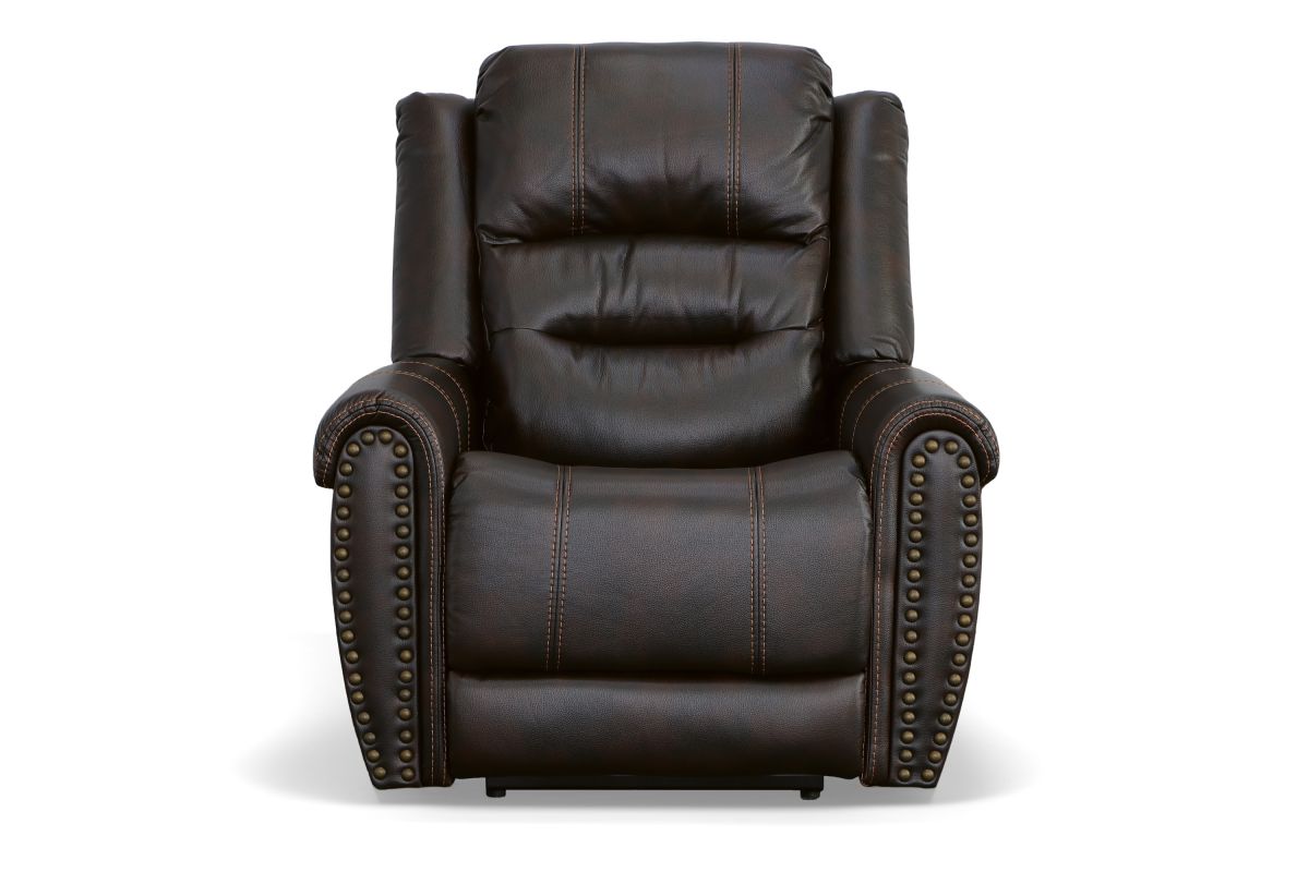 The generous padding and heavy-thread stitching detail of the Oscar power recliner with power headrest instantly grabs your attention and welcomes you to take a seat. Nailhead trim traces the edges of the arm fronts to highlight the welcoming silhouette, while an extended footrest provides additional leg rest space for taller users. Customize your sit with power recline and headrest that can be adjusted at the touch of a button. Outfitted in a dark, molasses brown fabric, this recliner brings a leather look to your room with the softness and comfort of fabric.