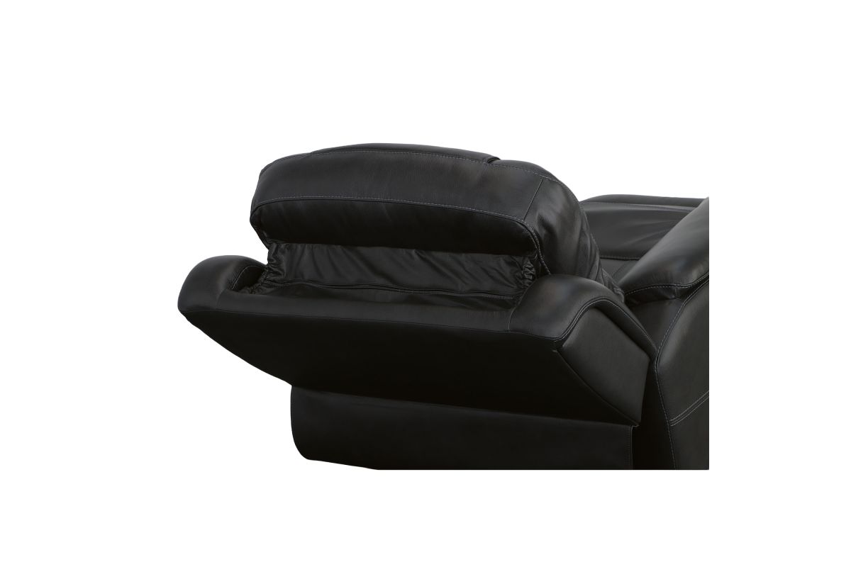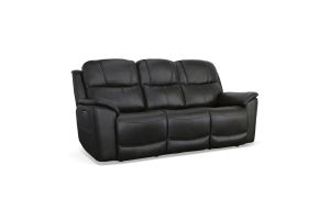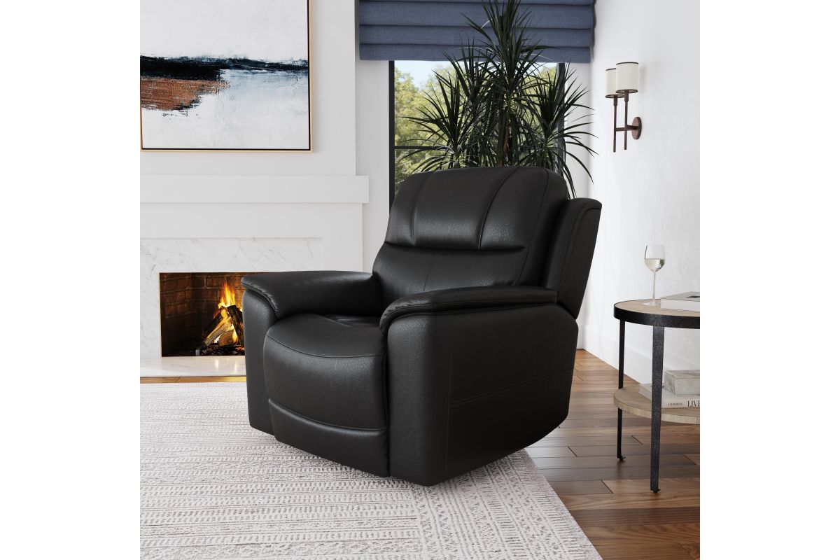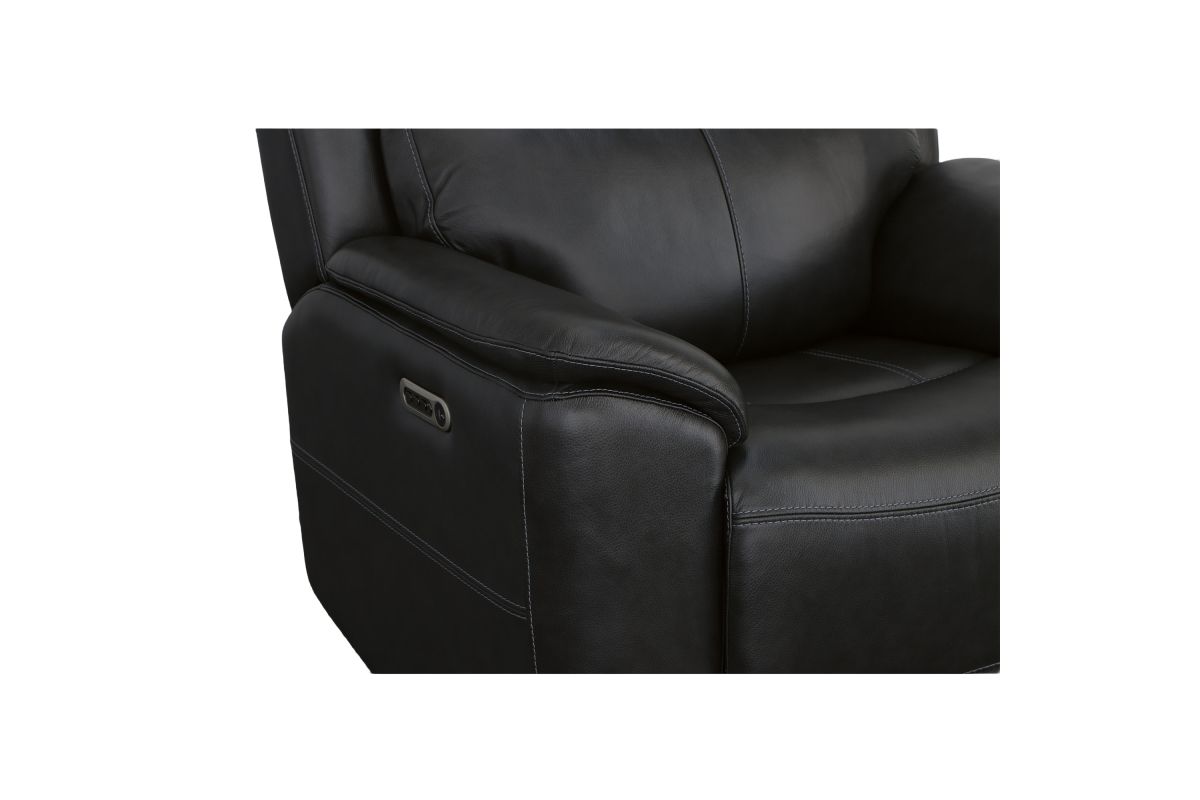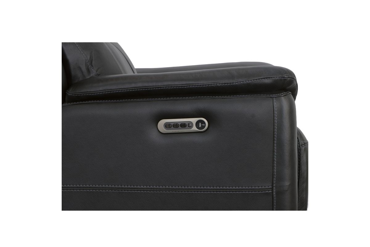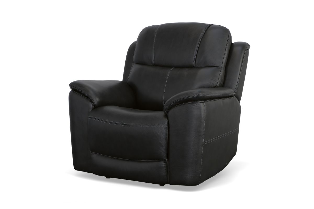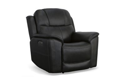 Superior ergonomics combine with the plush comfort of the Crew leather power recliner. Featuring triple power functionality that allows for independent adjustment of the headrest, lumbar support and recline, this recliner also features Zero Gravity which reduces pressure and tension on the body. Enjoy reliable comfort all day, every day, with pad-over armrests, a waterfall chaise footrest, a thin layered headrest, and divided back cushion. Built-in USB ports conveniently keep mobile devices charged and ready to stream your favorite shows. With Flexsteel's patented Blue Steel Spring™ at the heart of the seat, and high-quality raven black leather, the Crew power recliner brings exceptional beauty and durability to your home.