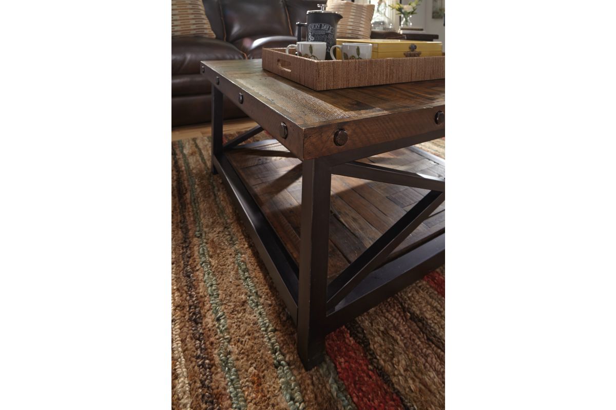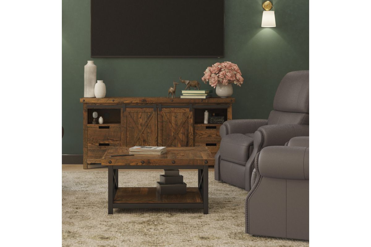 Transform your living room into a casual, modern rustic haven with the Carpenter square coffee table. A roomy top keeps cocktails and snacks conveniently close at hand, while an open lower shelf provides additional space for books or décor. Made with acacia wood, this coffee table features a well-worn look that is highlighted by a dark brown finish. Other design details include wood planks that are distressed for a reclaimed look, hand-worked metal frames and exposed bolt heads.