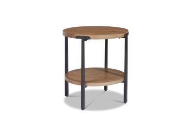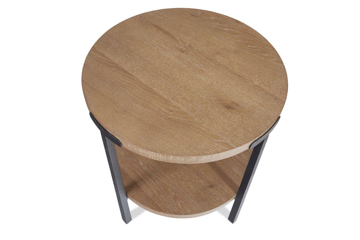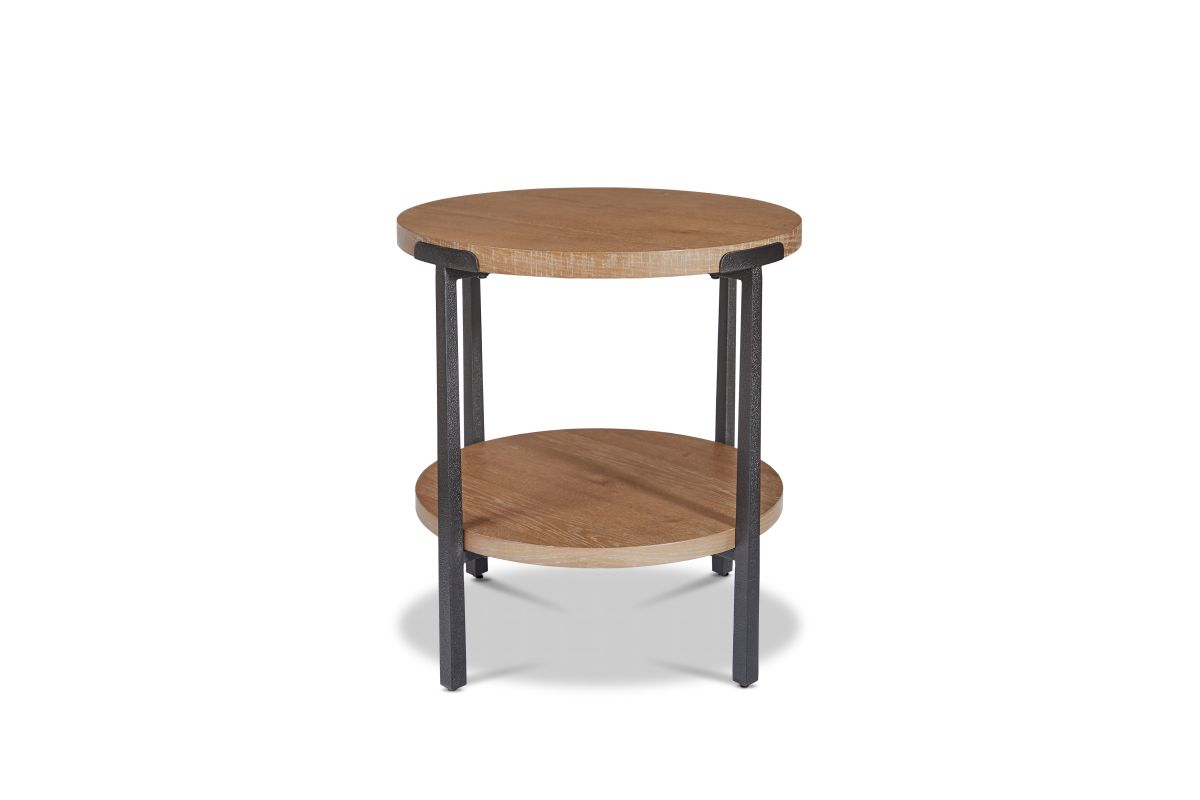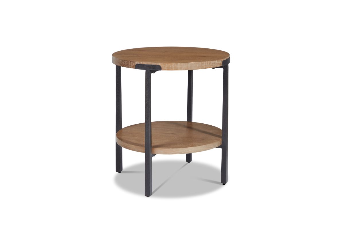 Sophistication meets rustic, industrial charm with the Millwork round end table. Seamlessly blending high-contrast materials and finishes in perfect harmony, this table makes a captivating statement in any living space. A textured steel frame is highlighted by warm copper undertones, while a distinctive wood top and lower shelf exude character with natural knots, subtle saw marks and a white cerused finish that accentuates the rich umber wood grain. Assembly required.