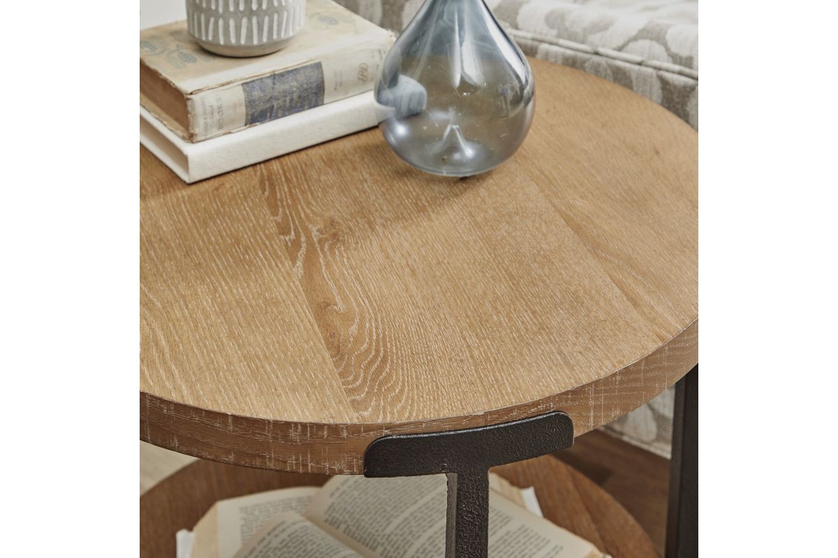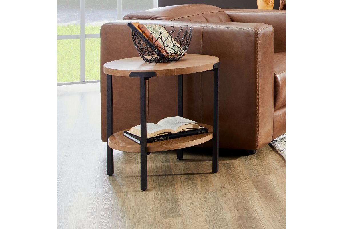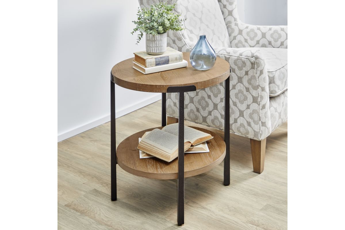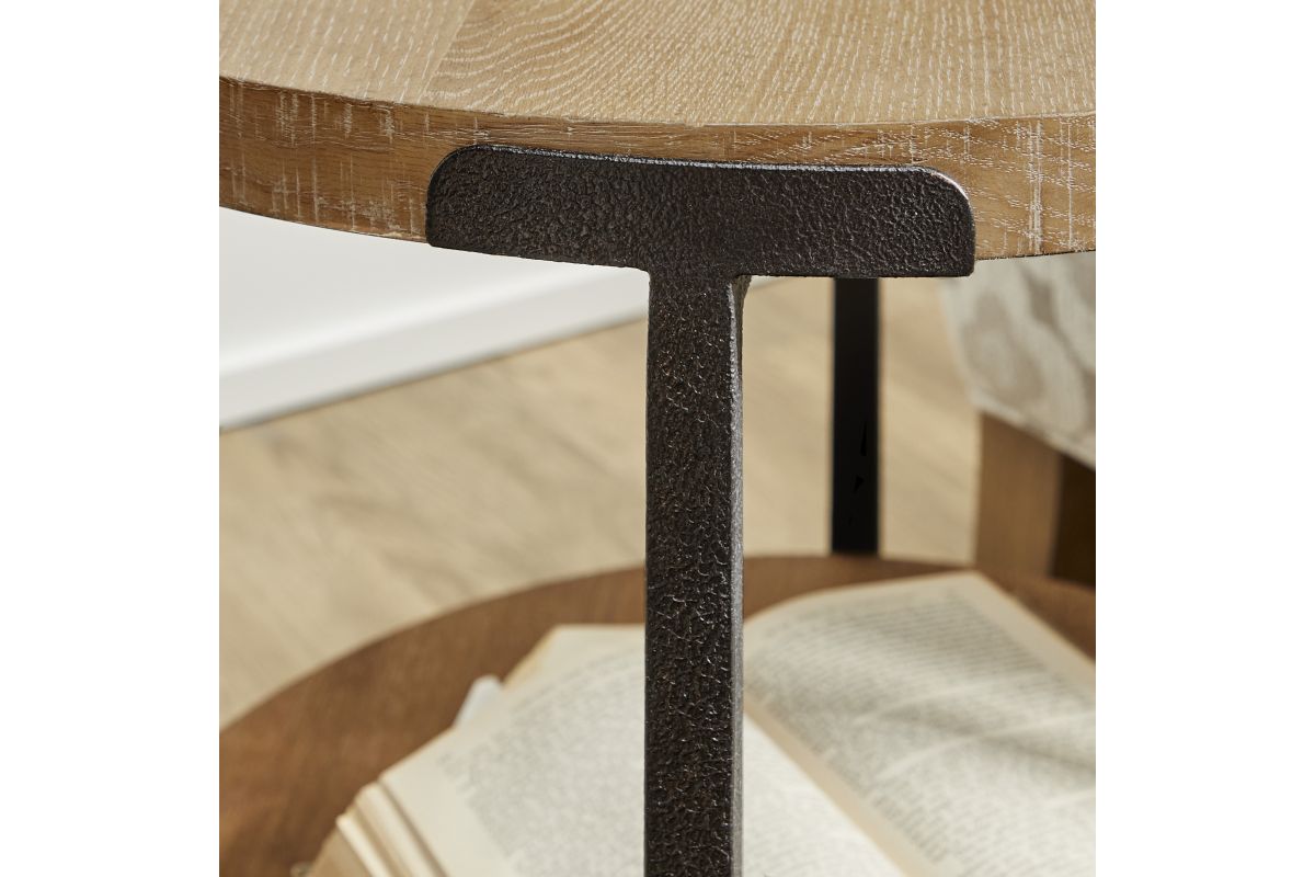Sophistication meets rustic, industrial charm with the Millwork round end table. Seamlessly blending high-contrast materials and finishes in perfect harmony, this table makes a captivating statement in any living space. A textured steel frame is highlighted by warm copper undertones, while a distinctive wood top and lower shelf exude character with natural knots, subtle saw marks and a white cerused finish that accentuates the rich umber wood grain. Assembly required.