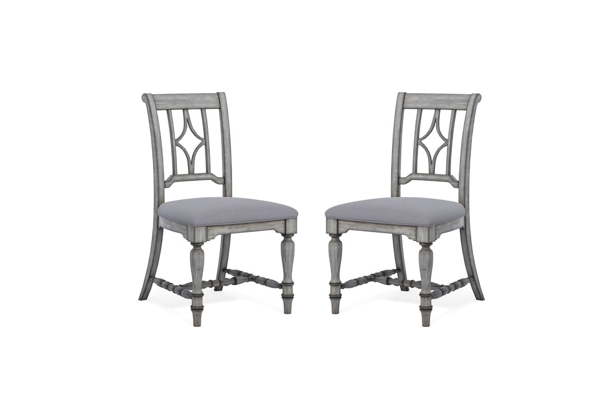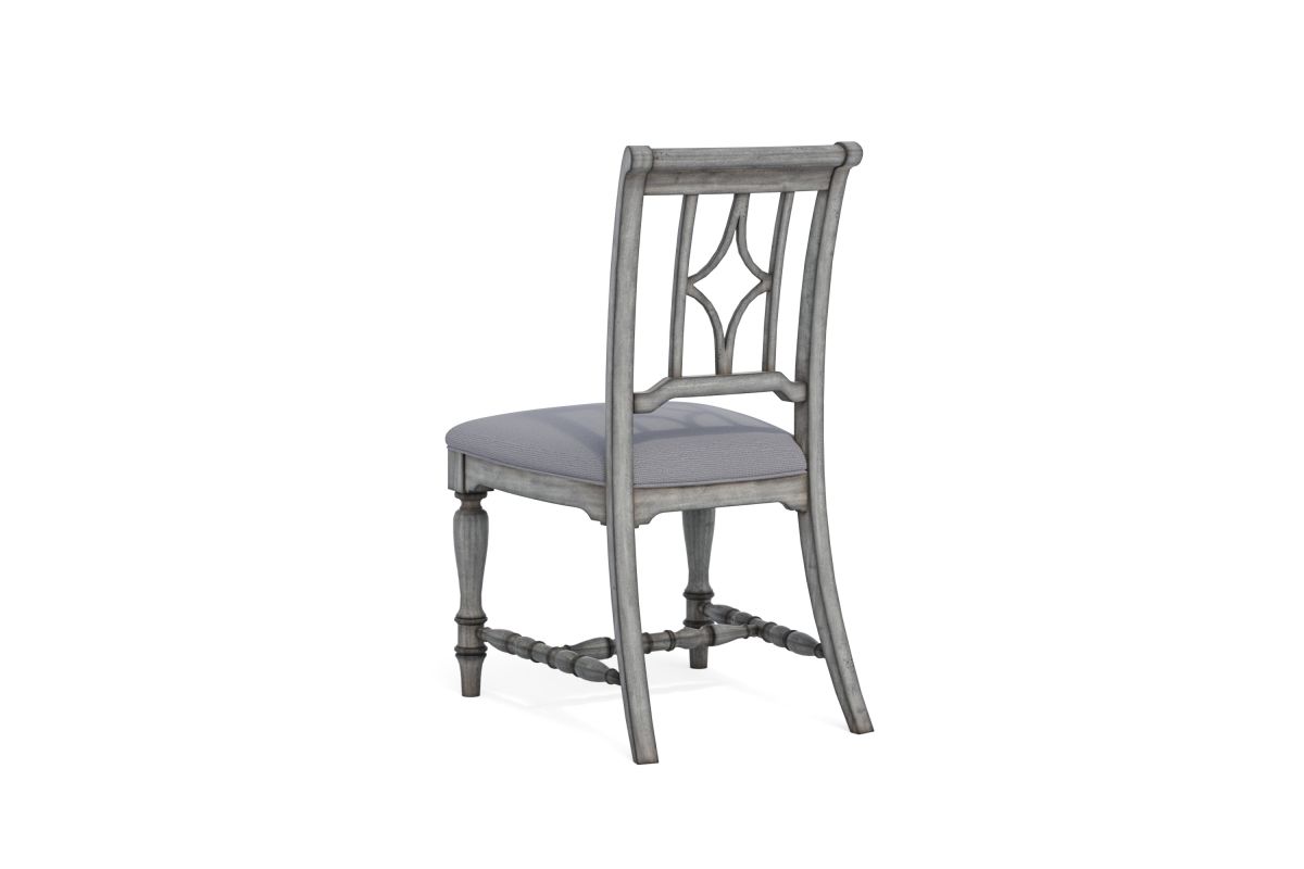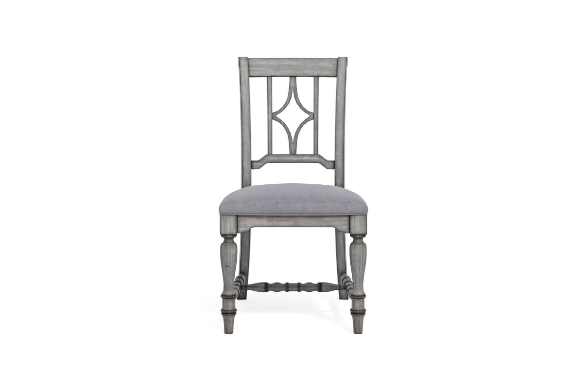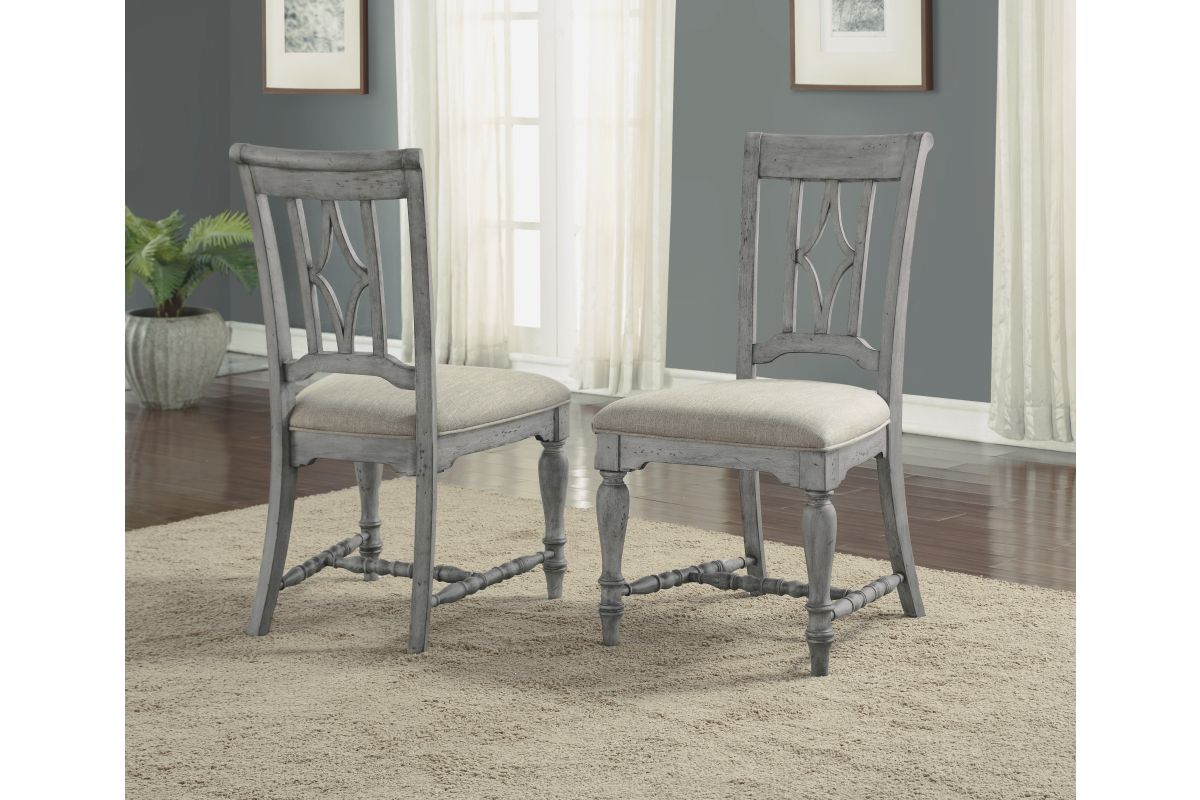 Designed to complement our Plymouth dining tables with a coordinating cottage look, this charming dining chair features an appealing open back design with a diamond-shaped detail, intricately carved trestles and turned legs for added vintage character. Available in a weathered graywash finish, each chair is upholstered in a durable and cleanable coordinating fabric, providing comfort for long periods of sitting. Chairs are sold as a set of two.