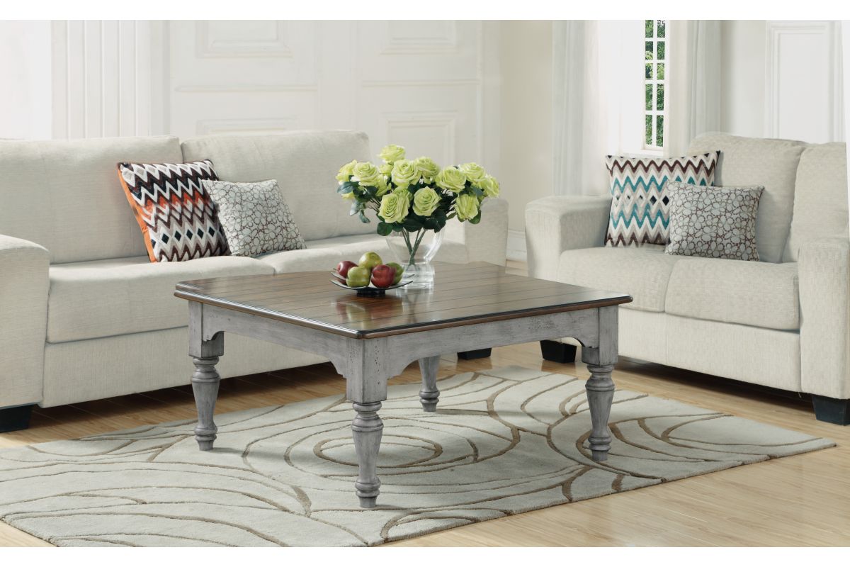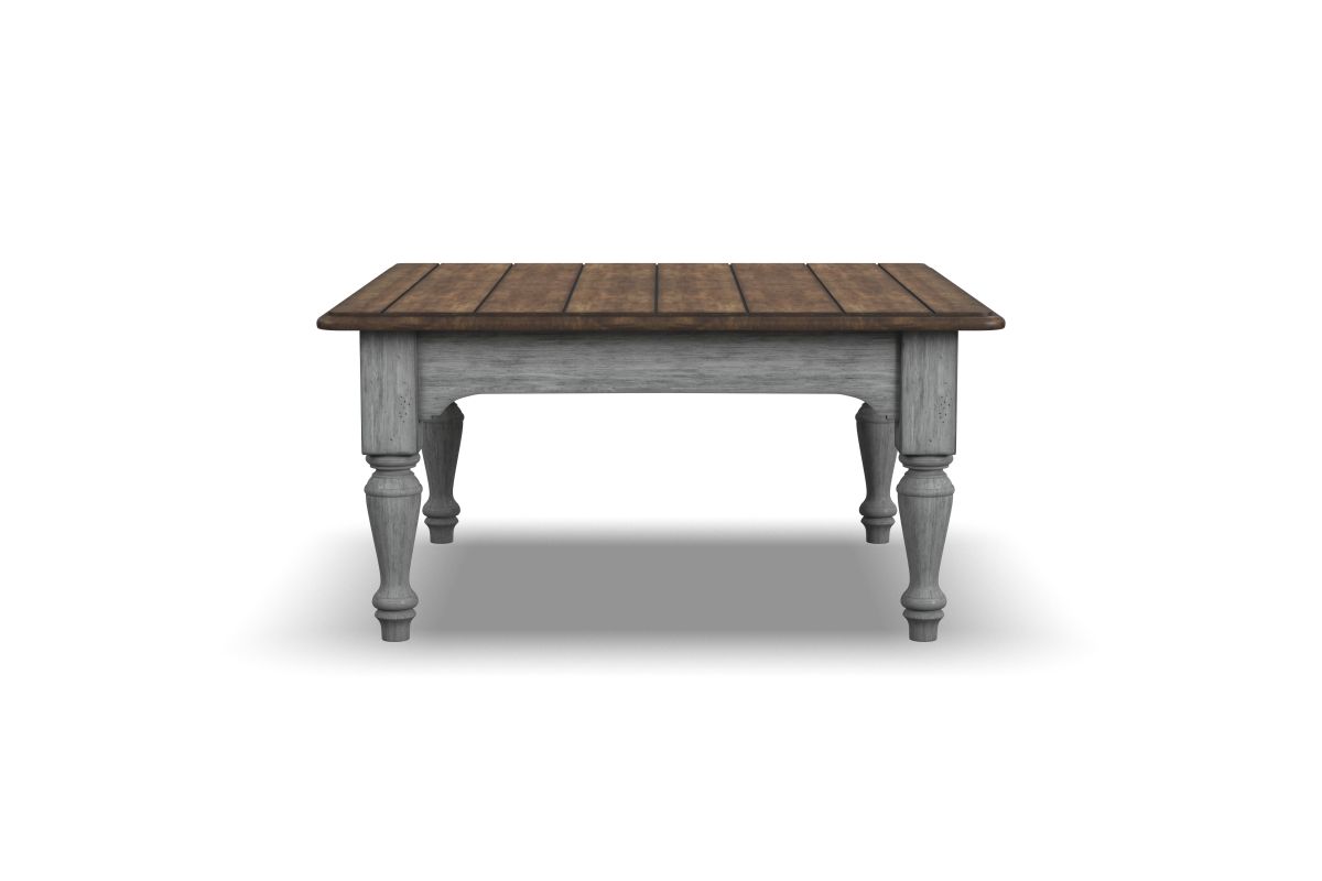 Relax with the family or entertain guests in cottage-inspired style with the Plymouth square coffee table. An ample planked tabletop surface offers the ideal place for drinks or magazines, while a weathered graywash finish and turned legs create a charming vintage look.