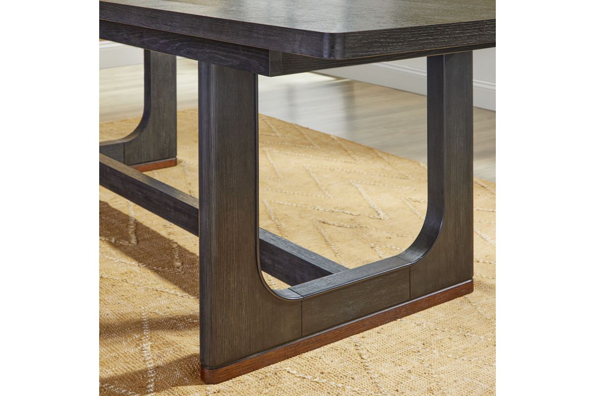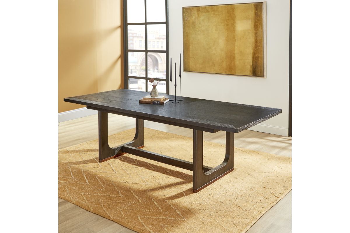 The perfect centerpiece for your next dinner party, this gorgeous dining table brings the ultimate in transitional style. The deep ebony finish fits seamlessly with the rich brown base accents for an on-trend color combination. Meticulously crafted from rubberwood solids and oak veneers, this piece is built to be everlasting. Complete with an 18” inch butterfly leaf that extends the table to a vast 100”, you’ll have ample space to host up to eight guests. The graceful namesake waterfall edges give this table true elegance.