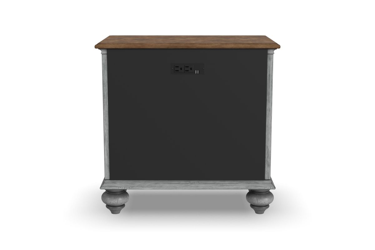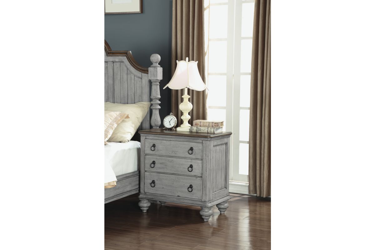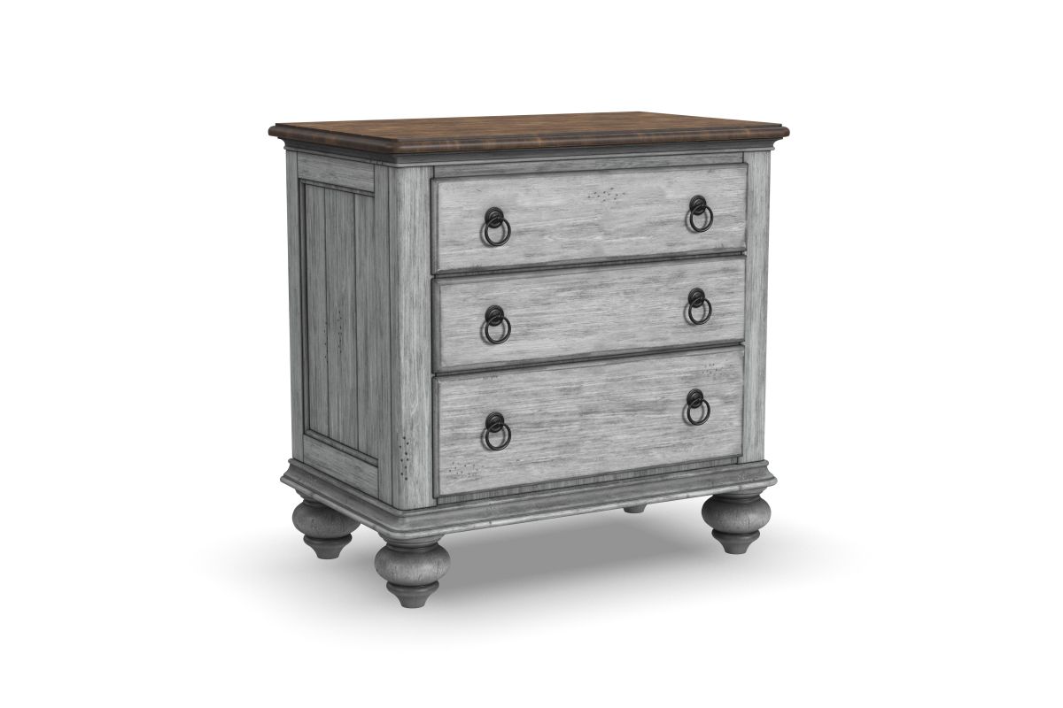 Vintage cottage style meets modern convenience with the Plymouth nightstand. Outfitted with three roomy drawers on premium ball-bearing glides to store all your bedside essentials, this nightstand also features integrated power to keep unsightly cords concealed and USB ports to charge your devices. A distressed graywash finish is contrasted with antique gunmetal pulls, while paneled accents and turned bun feet add to the unique vintage charm.