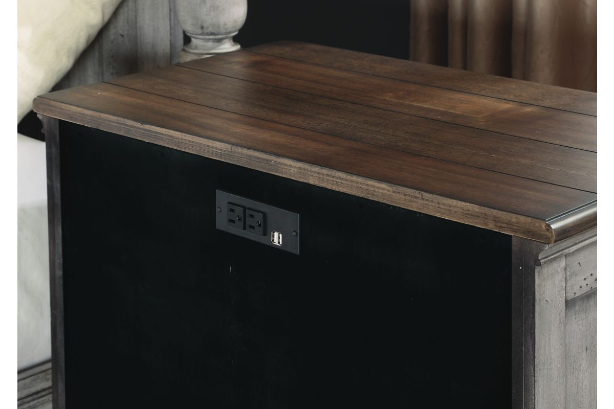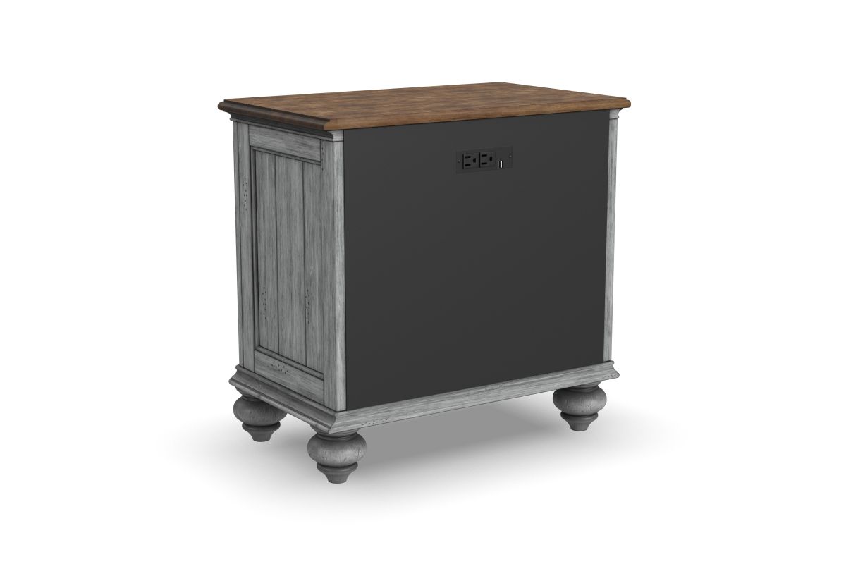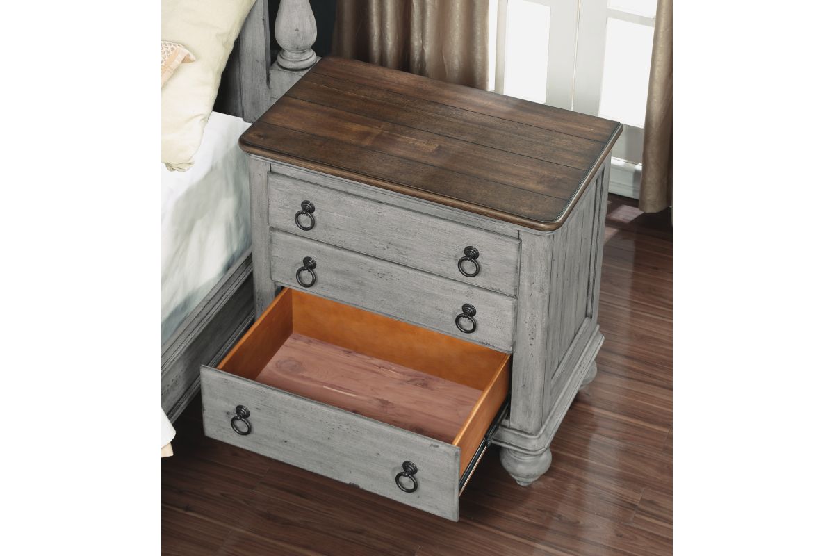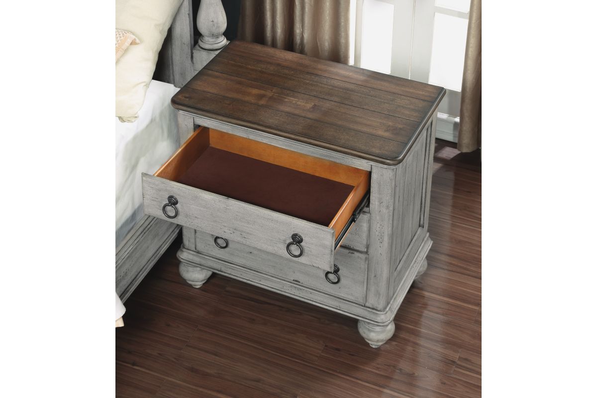 Vintage cottage style meets modern convenience with the Plymouth nightstand. Outfitted with three roomy drawers on premium ball-bearing glides to store all your bedside essentials, this nightstand also features integrated power to keep unsightly cords concealed and USB ports to charge your devices. A distressed graywash finish is contrasted with antique gunmetal pulls, while paneled accents and turned bun feet add to the unique vintage charm.