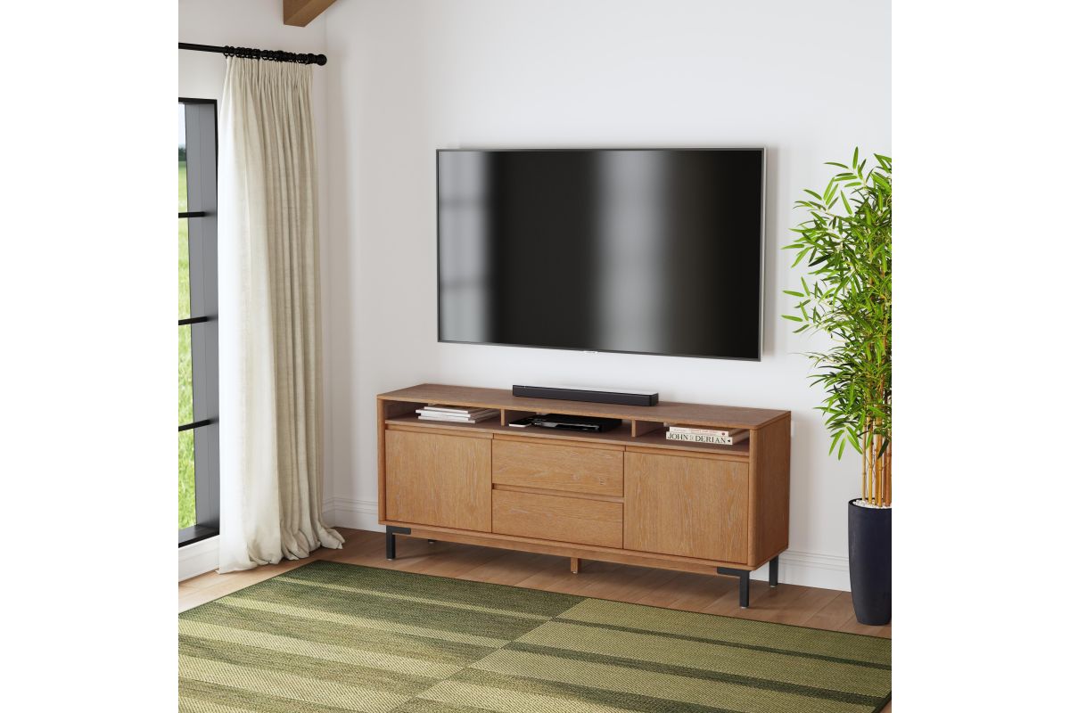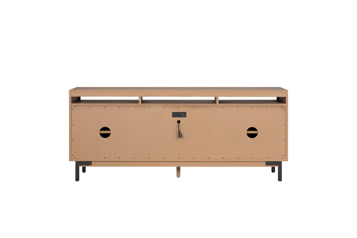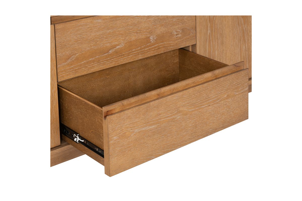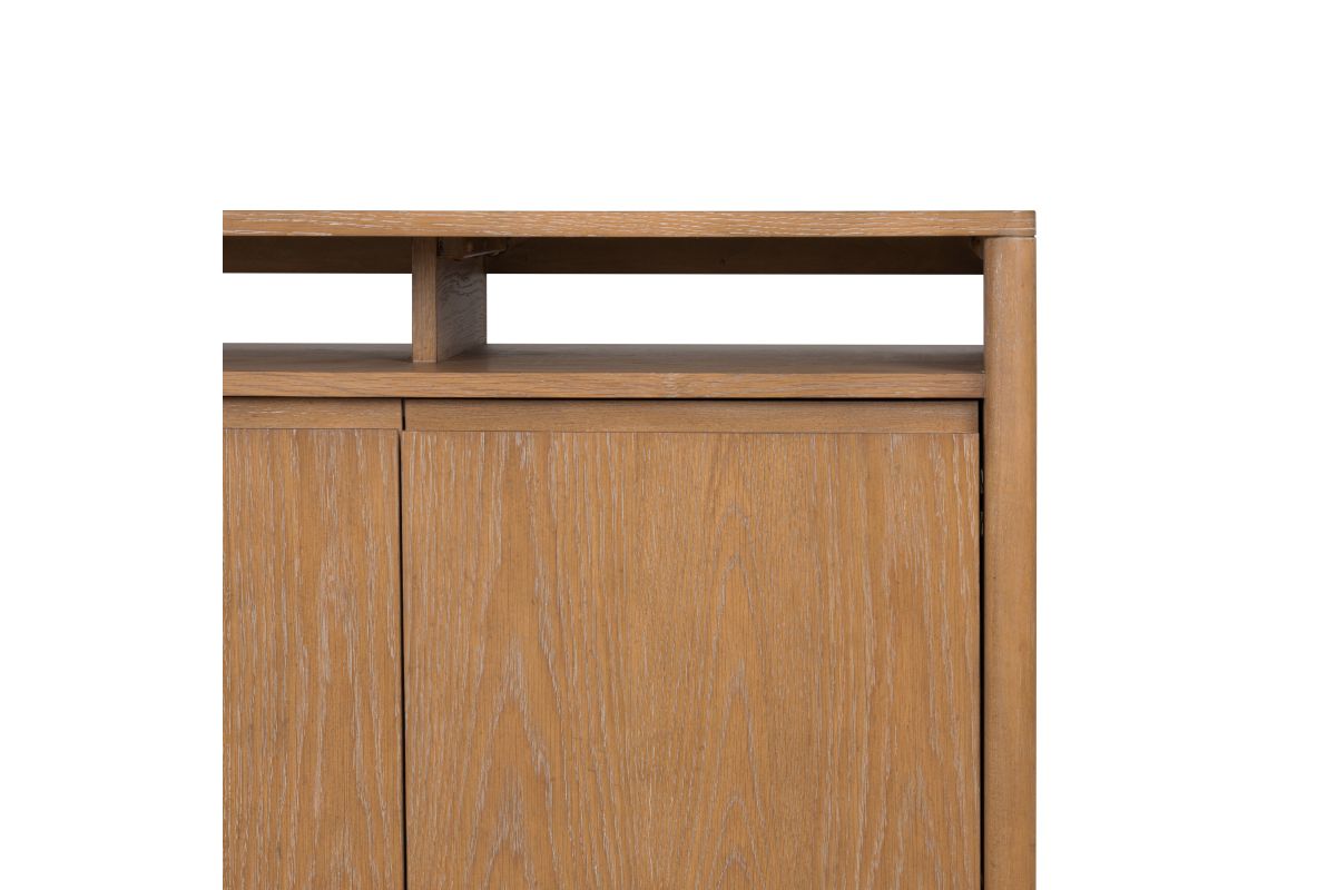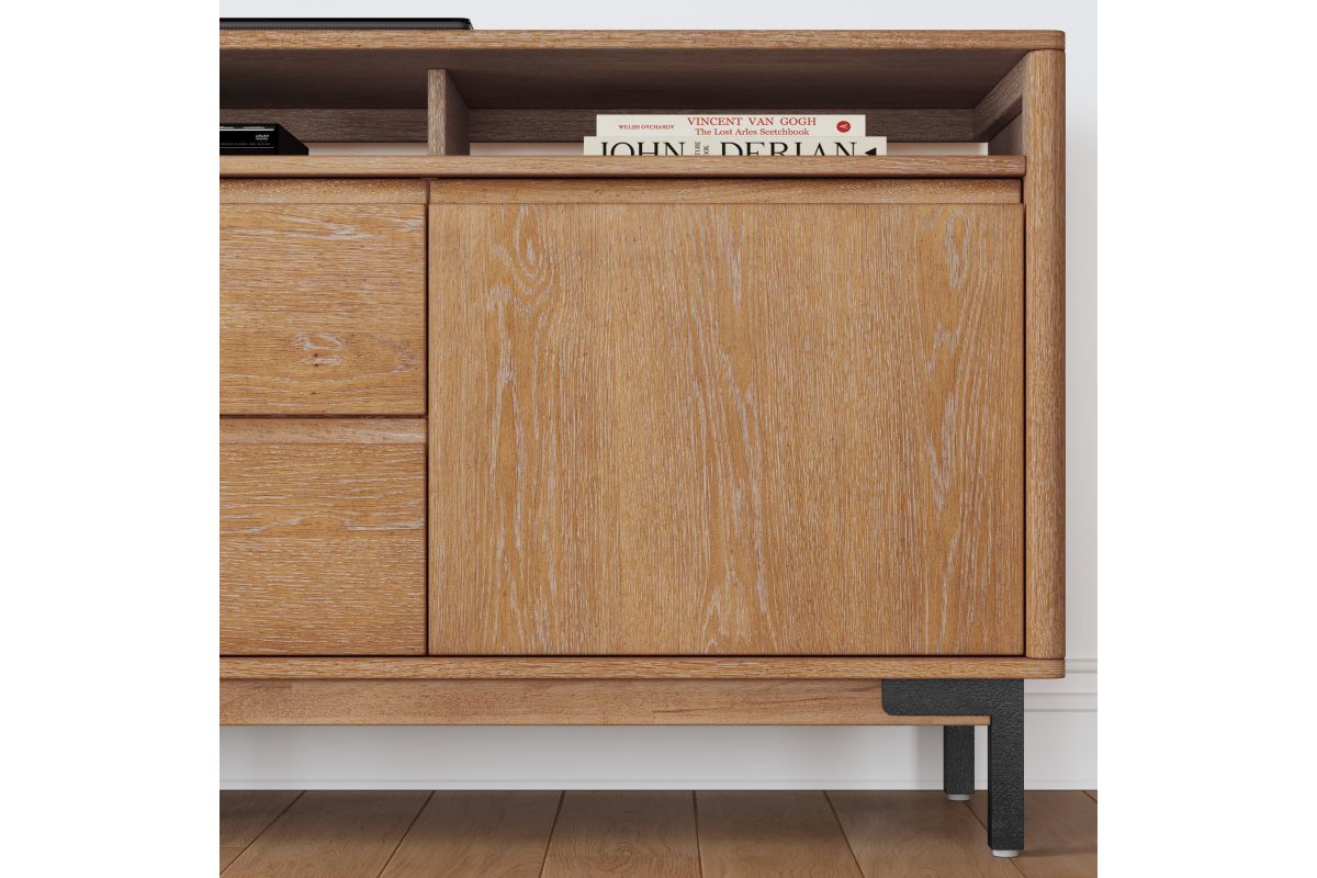 Sophistication meets rustic, industrial charm with the Millwork entertainment center. Seamlessly blending high-contrast materials and finishes in perfect harmony, this piece makes a captivating statement in any living space. A textured steel frame is highlighted by warm copper undertones, while a distinctive 76” wood top exudes character with natural knots, subtle saw marks and a white cerused finish that accentuates the rich umber wood grain. Above the drawers and cabinets, open shelving offers both form and function, perfect for displaying curated décor, housing media components, or keeping everyday essentials within reach while maintaining an airy, balanced silhouette.