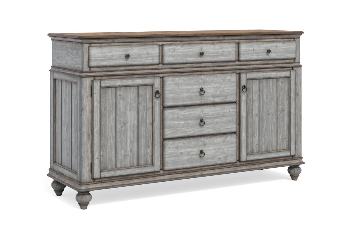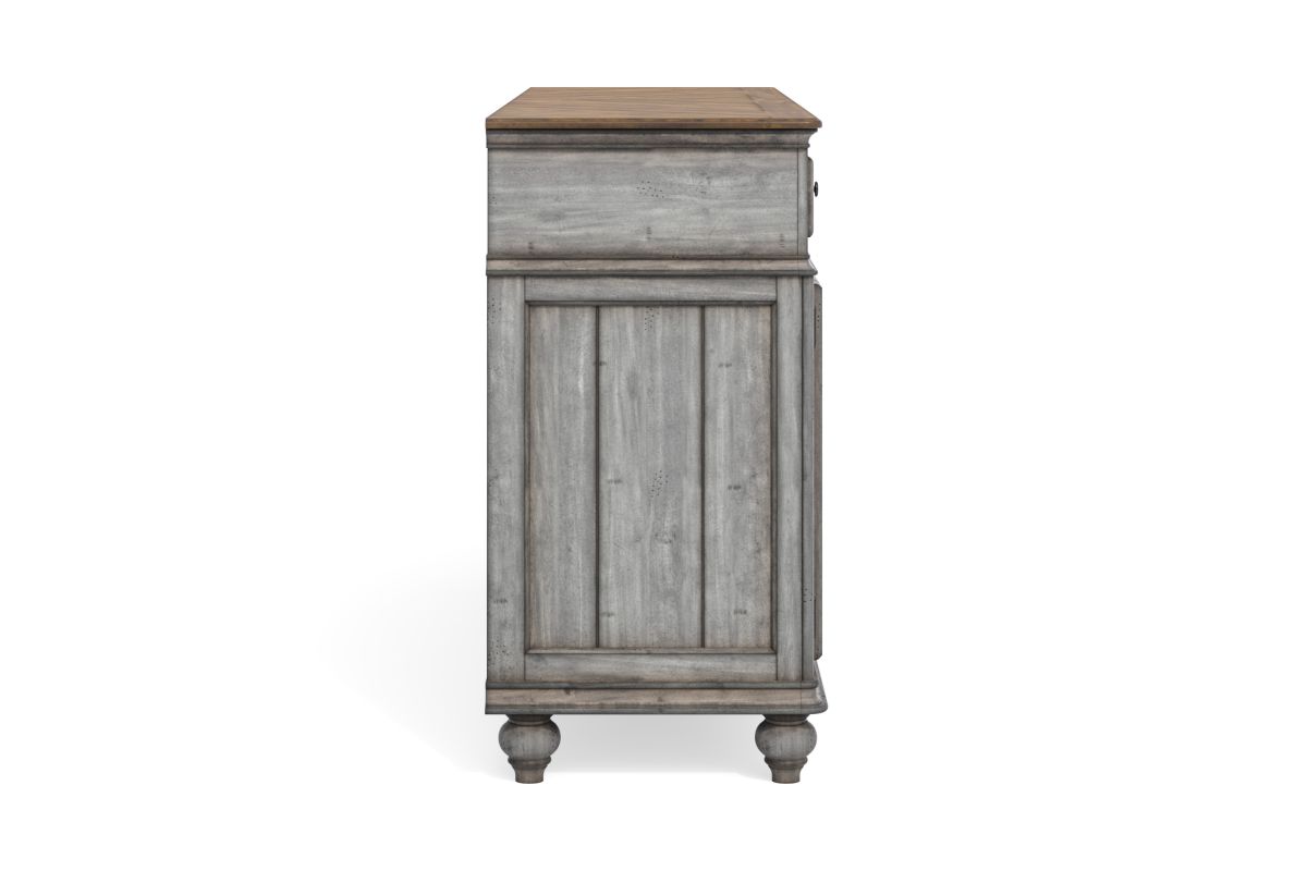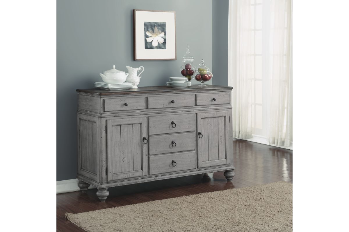 Entertain in relaxed cottage style with everything you need to host dinner guests with this Plymouth buffet. A weathered graywash finish is accented by a medium brown top and gunmetal pulls, while paneled details and turned bun feet add to the cozy vintage character. This buffet features two cabinet spaces with adjustable shelves and a removable wine rack that can store up to 16 bottles. Pair that with six spacious drawers—complete with felt-lined top drawers and a removable silverware tray—and you have ample storage for serving pieces and other dining essentials. Each drawer features ball-bearing glides for smooth access and support for heavy dining ware.