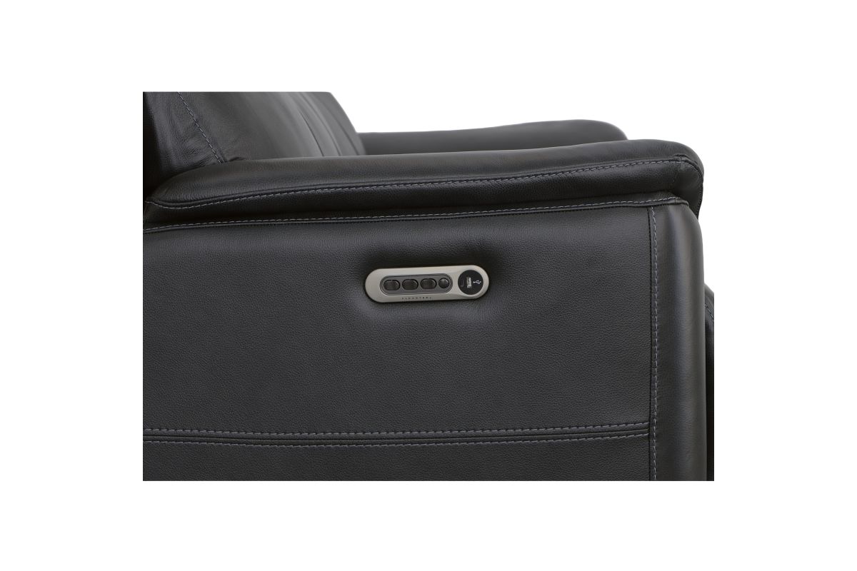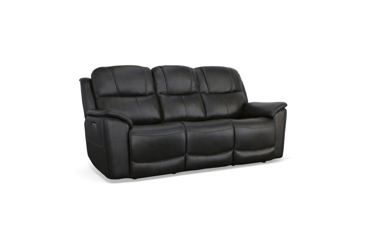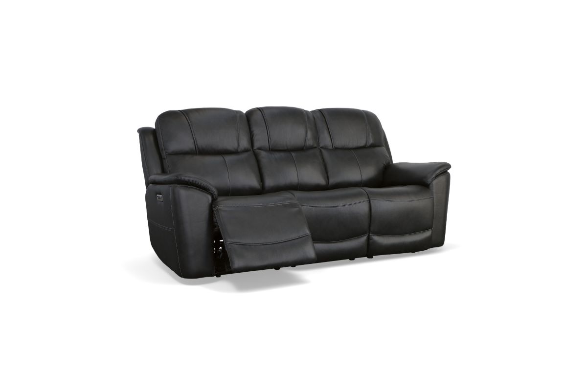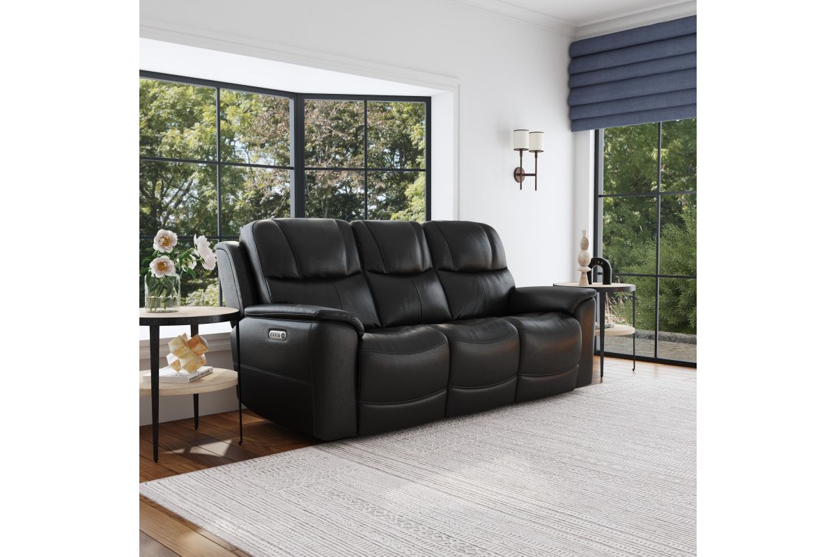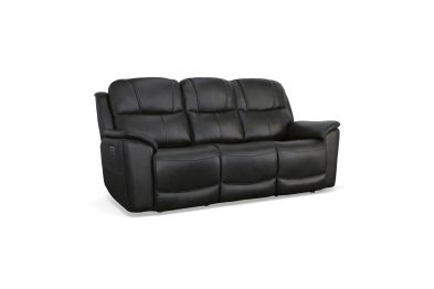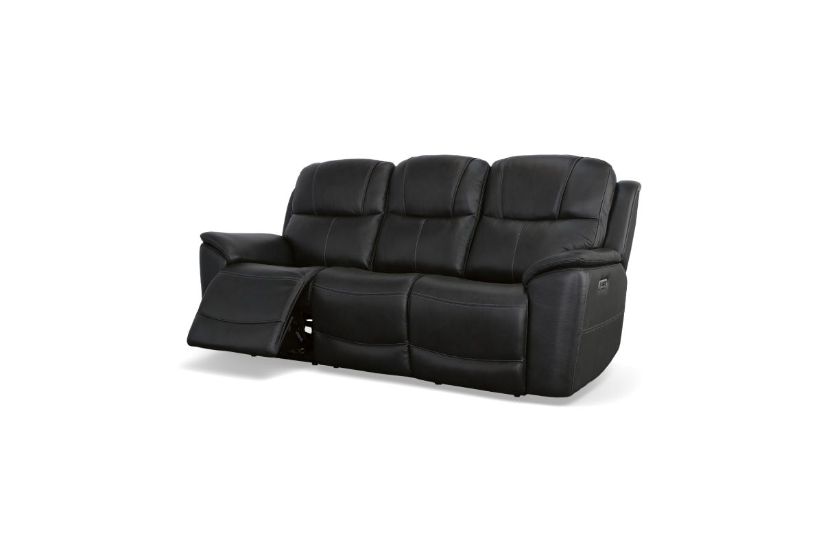 Superior ergonomics combine with the plush comfort of the Crew leather power reclining sofa. Featuring triple power functionality on the two outside seats that allows for independent adjustment of the headrests, lumbar supports and recline, this sofa also features Zero Gravity which reduces pressure and tension on the body. Enjoy reliable comfort all day, every day, with pad-over armrests, waterfall chaise footrests, thin layered headrests, and divided back cushions. Integrated power controls with built-in USB ports let you achieve your ideal relaxation position at the push of a button while conveniently charging your mobile devices. With Flexsteel's patented Blue Steel Spring™ at the heart of each seat, and high-quality raven black leather, the Crew power reclining sofa brings exceptional beauty and durability to your home.