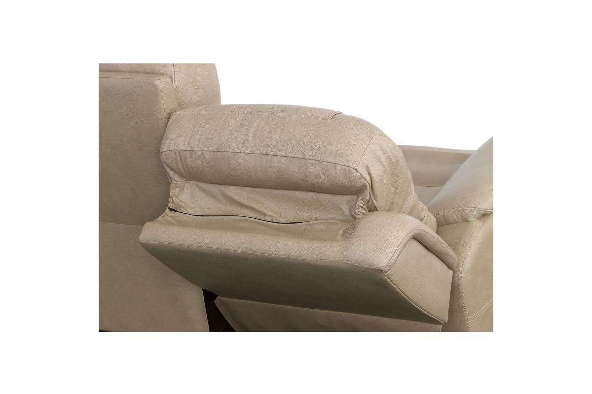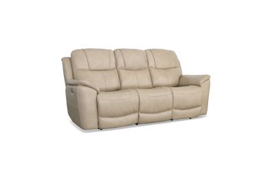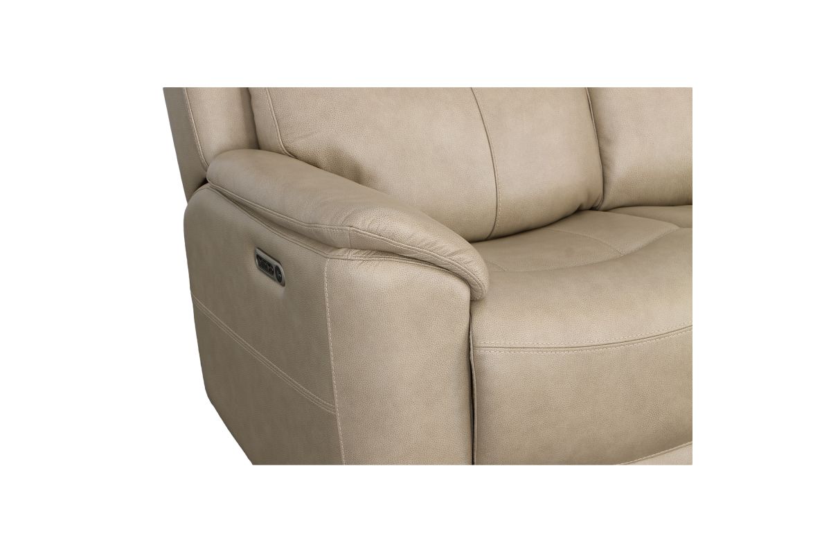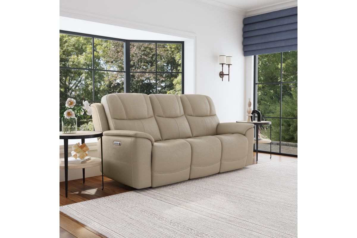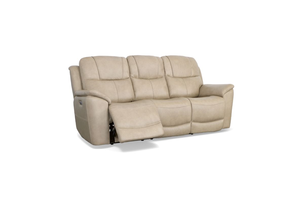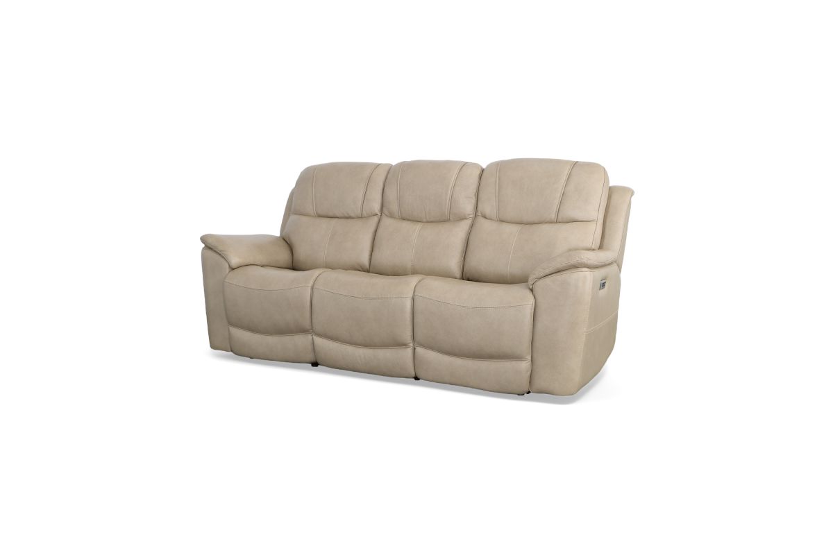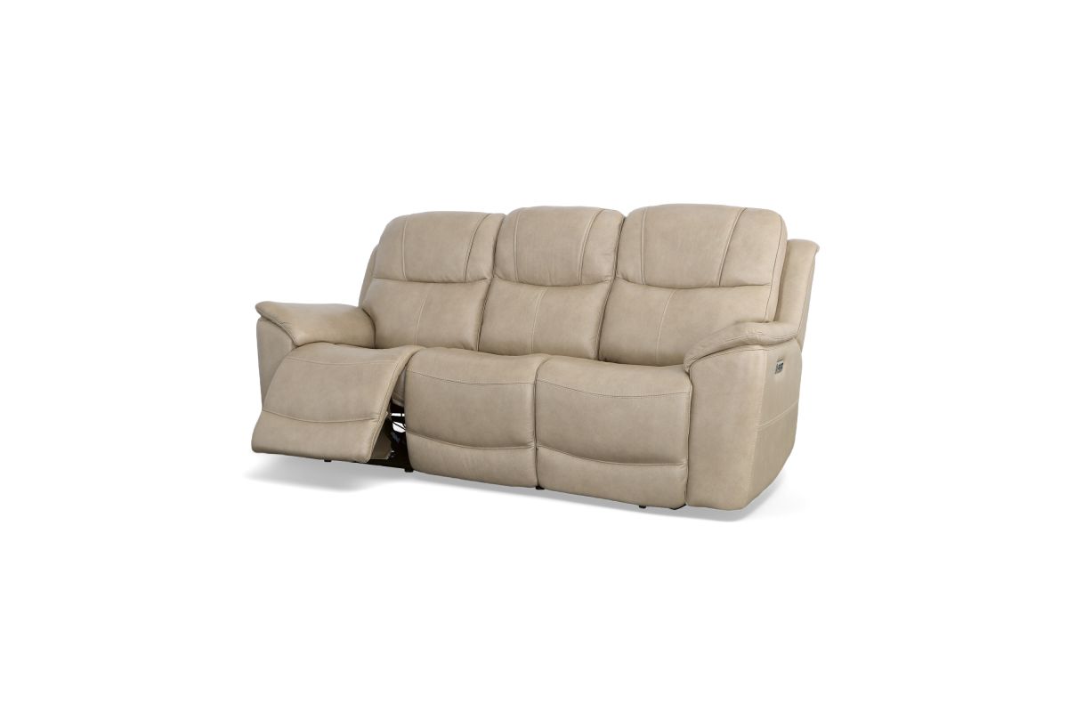 Superior ergonomics combine with the plush comfort of the Crew leather power reclining sofa. Featuring triple power functionality on the two outside seats that allows for independent adjustment of the headrests, lumbar supports and recline, this sofa also features Zero Gravity which reduces pressure and tension on the body. Enjoy reliable comfort all day, every day, with pad-over armrests, waterfall chaise footrests, thin layered headrests, and divided back cushions. Integrated power controls with built-in USB ports let you achieve your ideal relaxation position at the push of a button while conveniently charging your mobile devices. With Flexsteel's patented Blue Steel Spring™ at the heart of each seat, and high-quality light tan leather, the Crew power reclining sofa brings exceptional beauty and durability to your home.