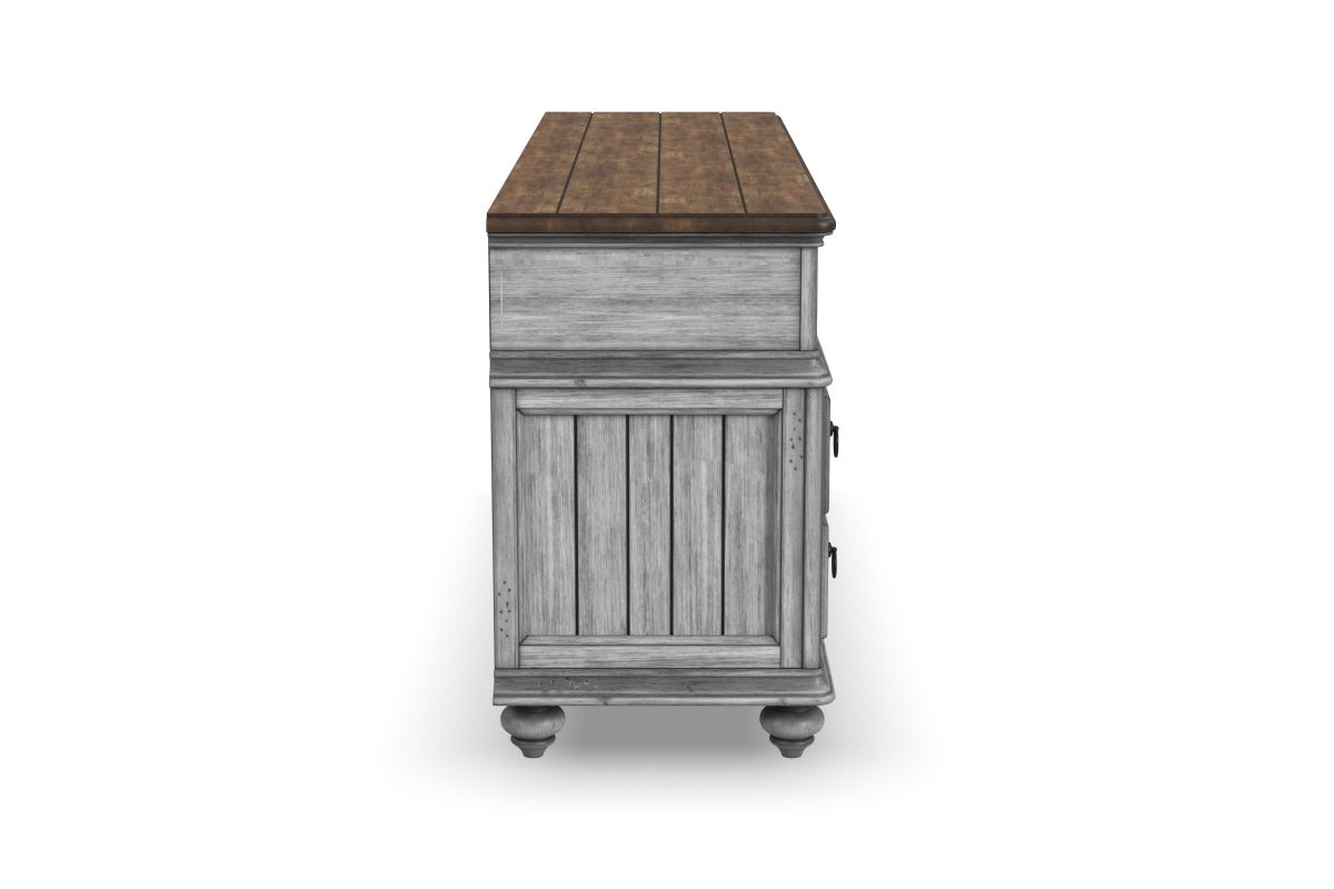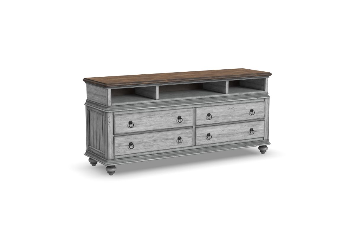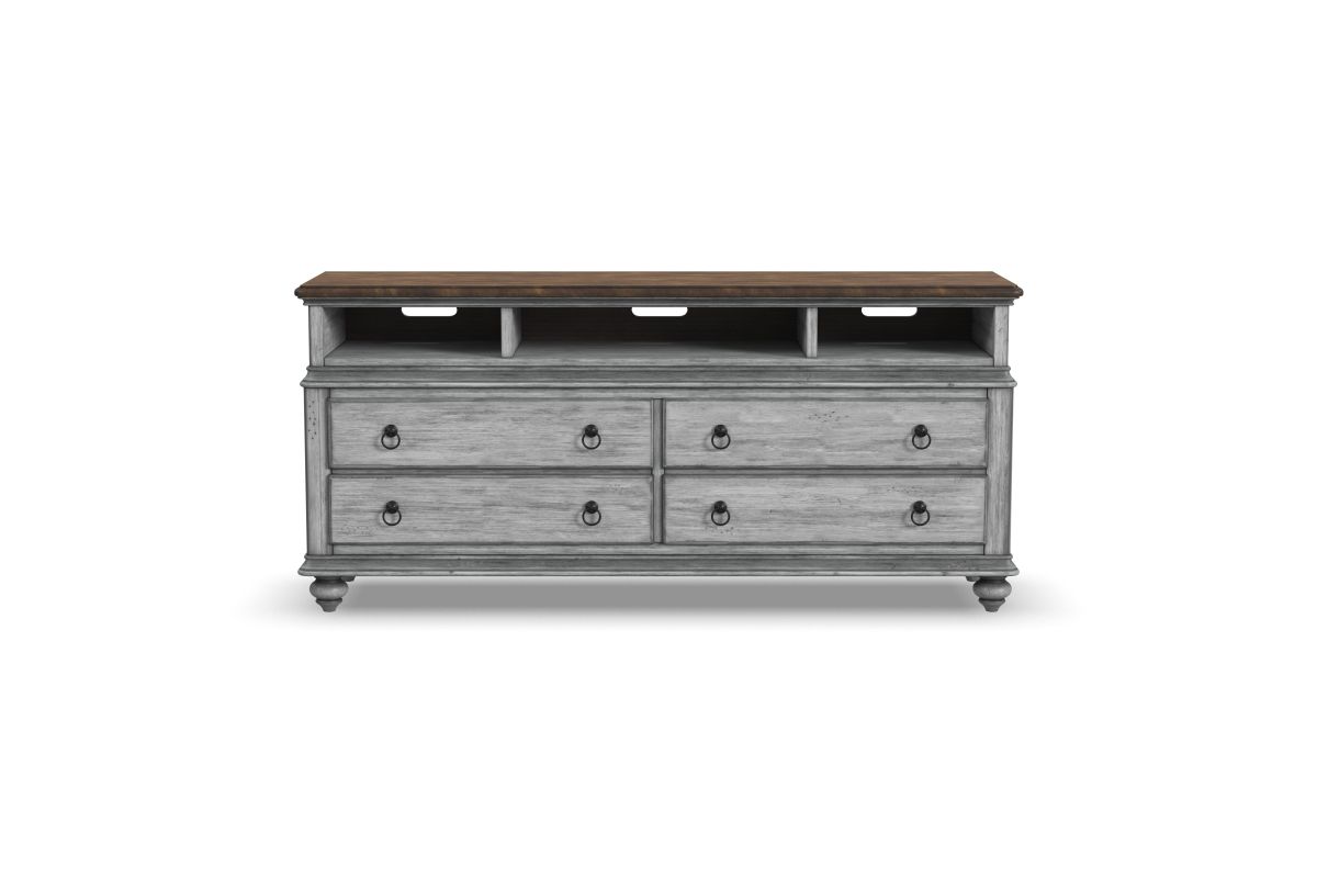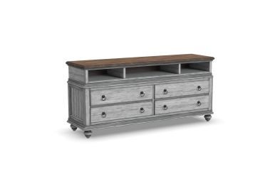 Add cottage-inspired charm to the spaces where you watch your favorite shows with the Plymouth entertainment base. Featuring four drawers with premium ball-bearing glides and three open compartments with cable access, this spacious entertainment base provides ample room for storing electronics, media and gaming accessories. A planked top creates the ideal surface for your TV, while two built-in electrical outlets and USB ports add convenience for keeping devices powered. With a weathered graywash finish, antique gunmetal pulls and turned bun feet, this base brings a warm vintage look to living spaces and family rooms.