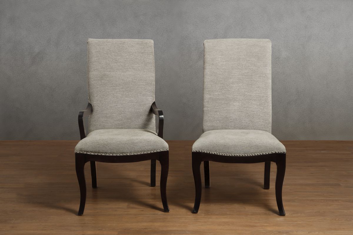 Sophisticated soft contemporary design is achieved in your dining room with the addition of the Savion Collection. An espresso finish highlights the unique veneer pattern. Dramatic flair is lent to the design by the arm chairs with a neutral tone fabric cover.