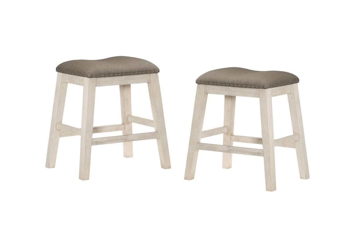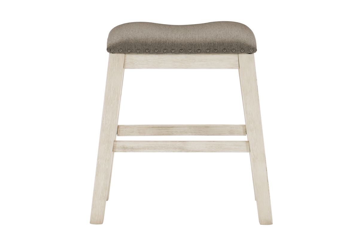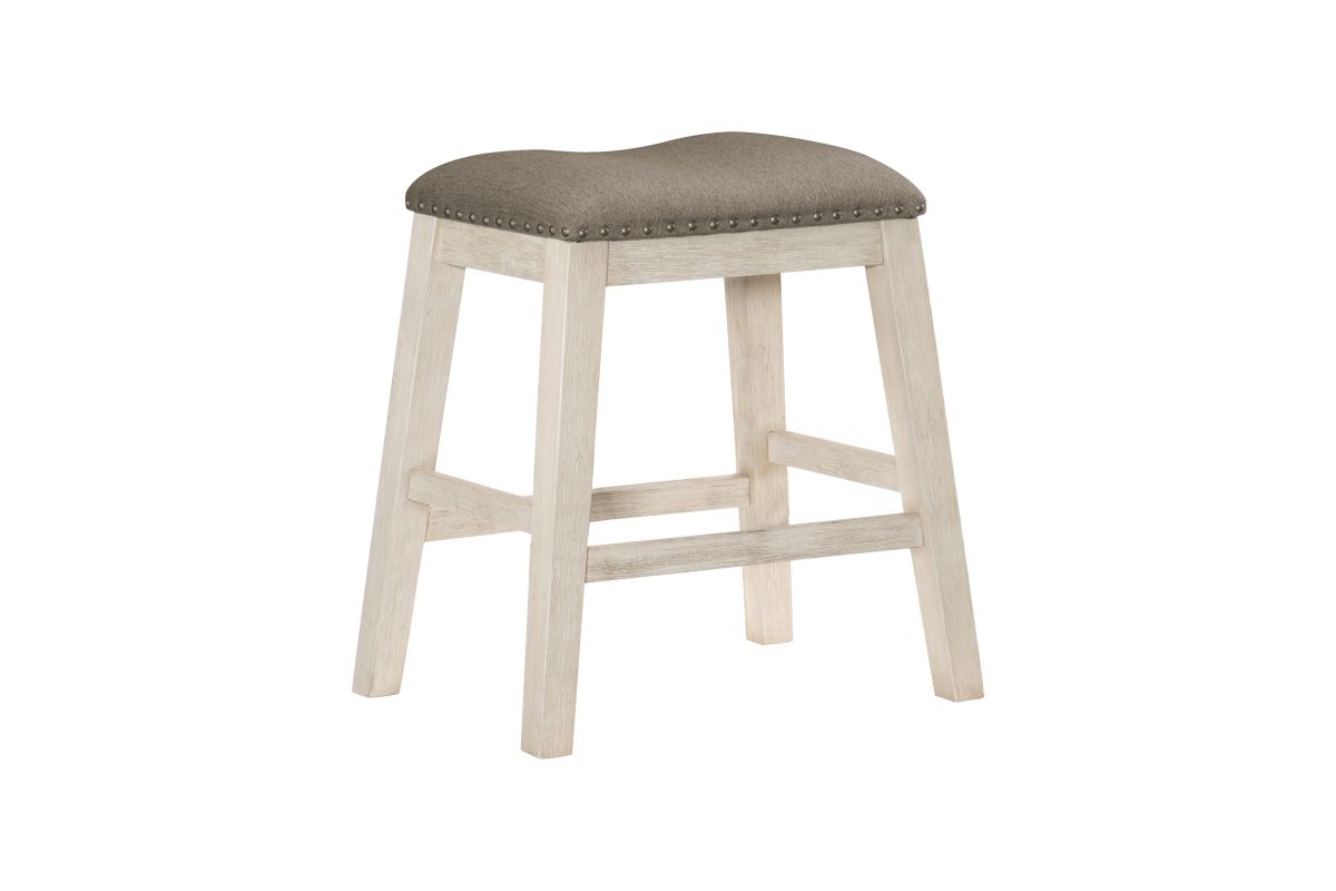 The design of the Timbre Collection will be the perfect seating addition to your casual dining space. The counter height barstool’s legs feature wire-brushed acacia veneer that is highlighted by a whitewash finish. Topping the stool is the brown fabric seat with nailhead accent. Coordinating dining table is also available.