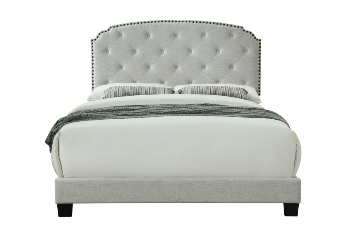 Elevate your bedroom with timeless charm and graceful sophistication with the Olivia Upholstered Bed in a Box. Dressed in a soft, light gray linen-like fabric, the Olivia bed features a beautifully scalloped headboard silhouette, accentuated by deep diamond button tufting and elegant nailhead trim outlining its curved frame.