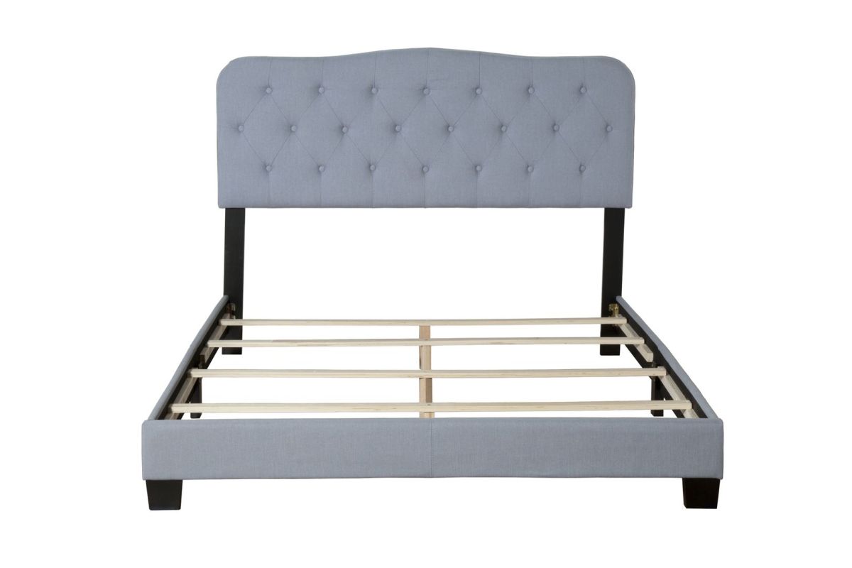 Classic charm meets soft sophistication in the Ariana Upholstered Bed in a Box. Featuring a gently curved silhouette and diamond button tufting, this bed is wrapped in a tranquil sky-blue fabric that adds a serene and elegant touch to any bedroom.