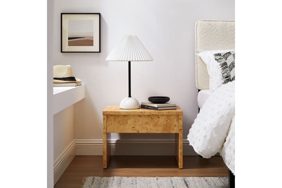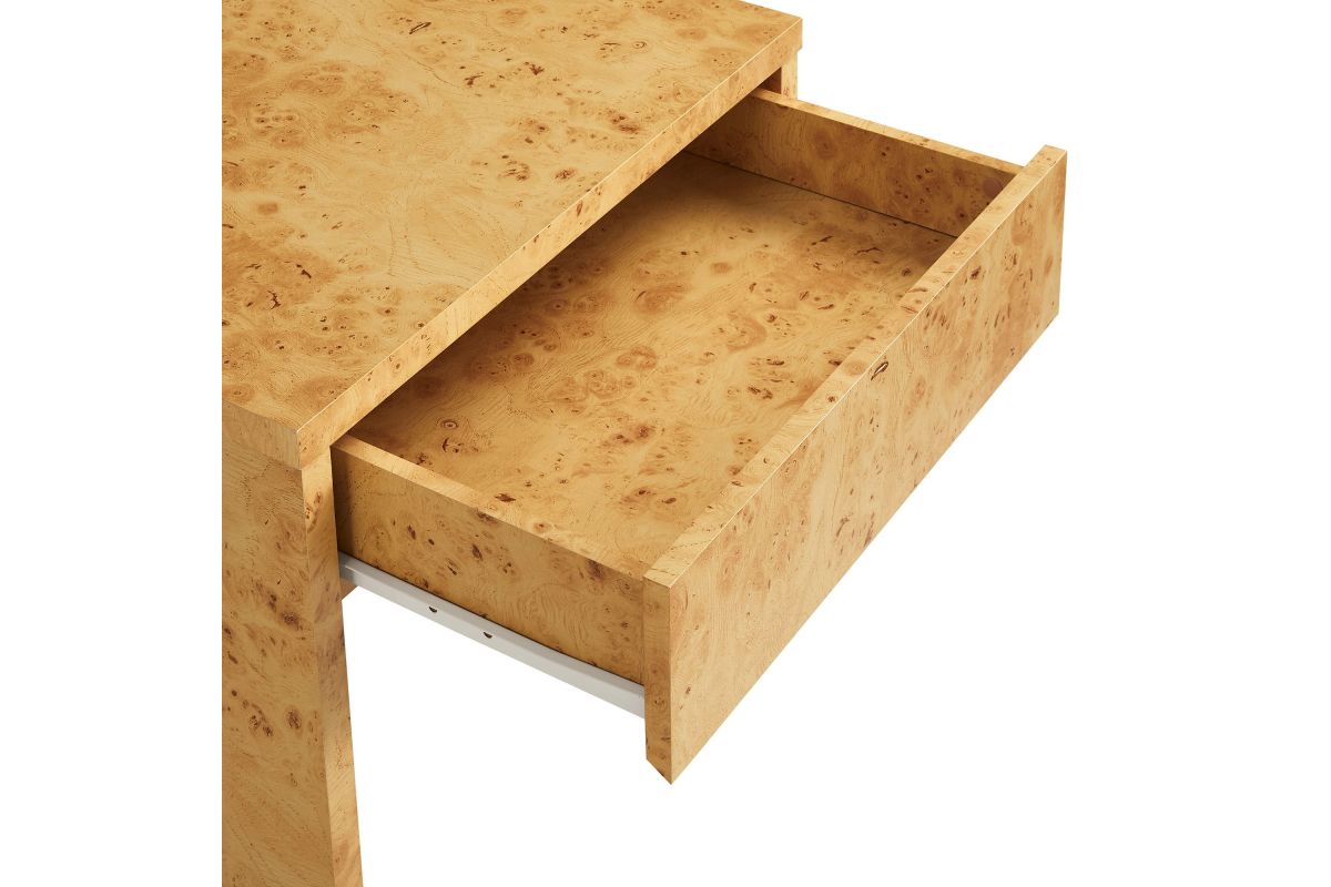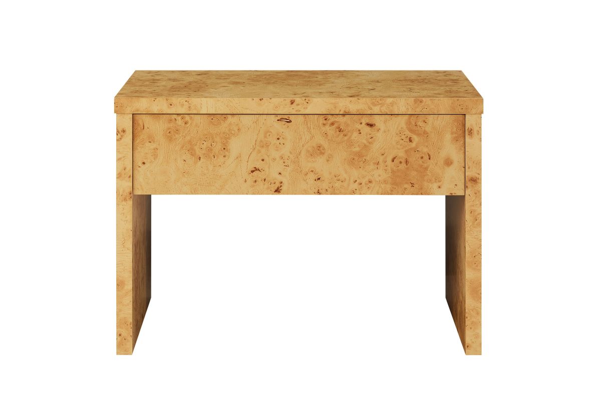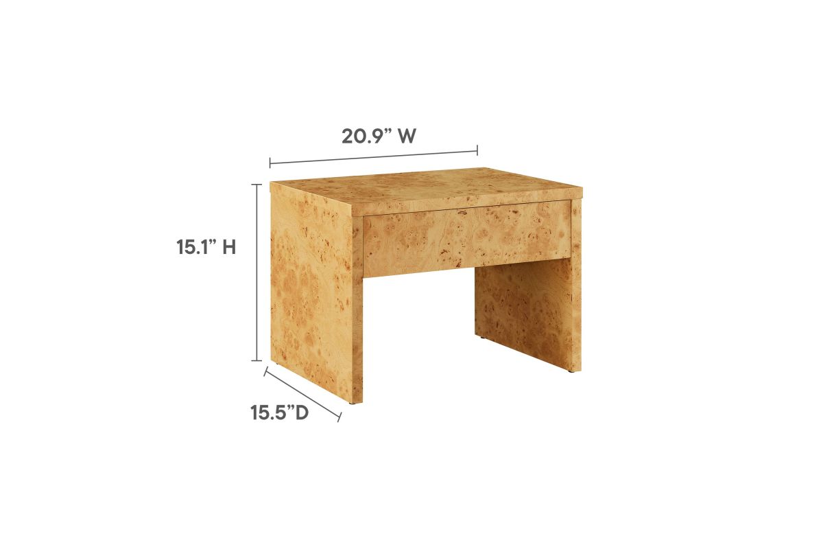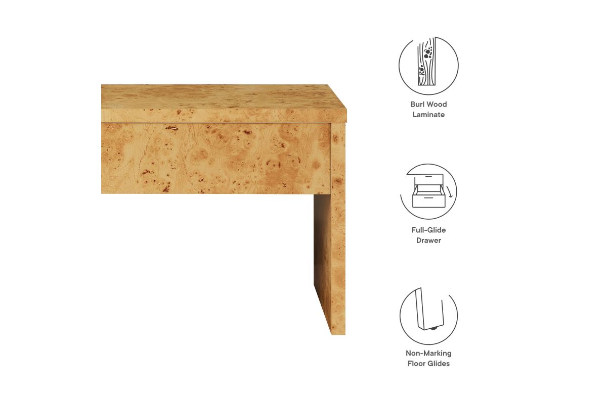 Discover the simplicity and allure of the Hudson 1-Drawer Nightstand. Featuring a minimalist design, this modern nightstand blends seamlessly into any contemporary setting. Crafted and adorned with a burl wood paper laminate, this small nightstand exudes sophistication and durability. The full-glide drawer provides ample storage, making it a practical addition to any bedroom or living room. Designed with non-marking floor glides to protect your surfaces, the Hudson Modern Nightstand With Drawer offers both style and functionality. Whether used as a bedside table, a versatile side table, or a stylish burl end table, Hudson enhances any room with its mid-century modern elegance and sleek design. Assembly required.