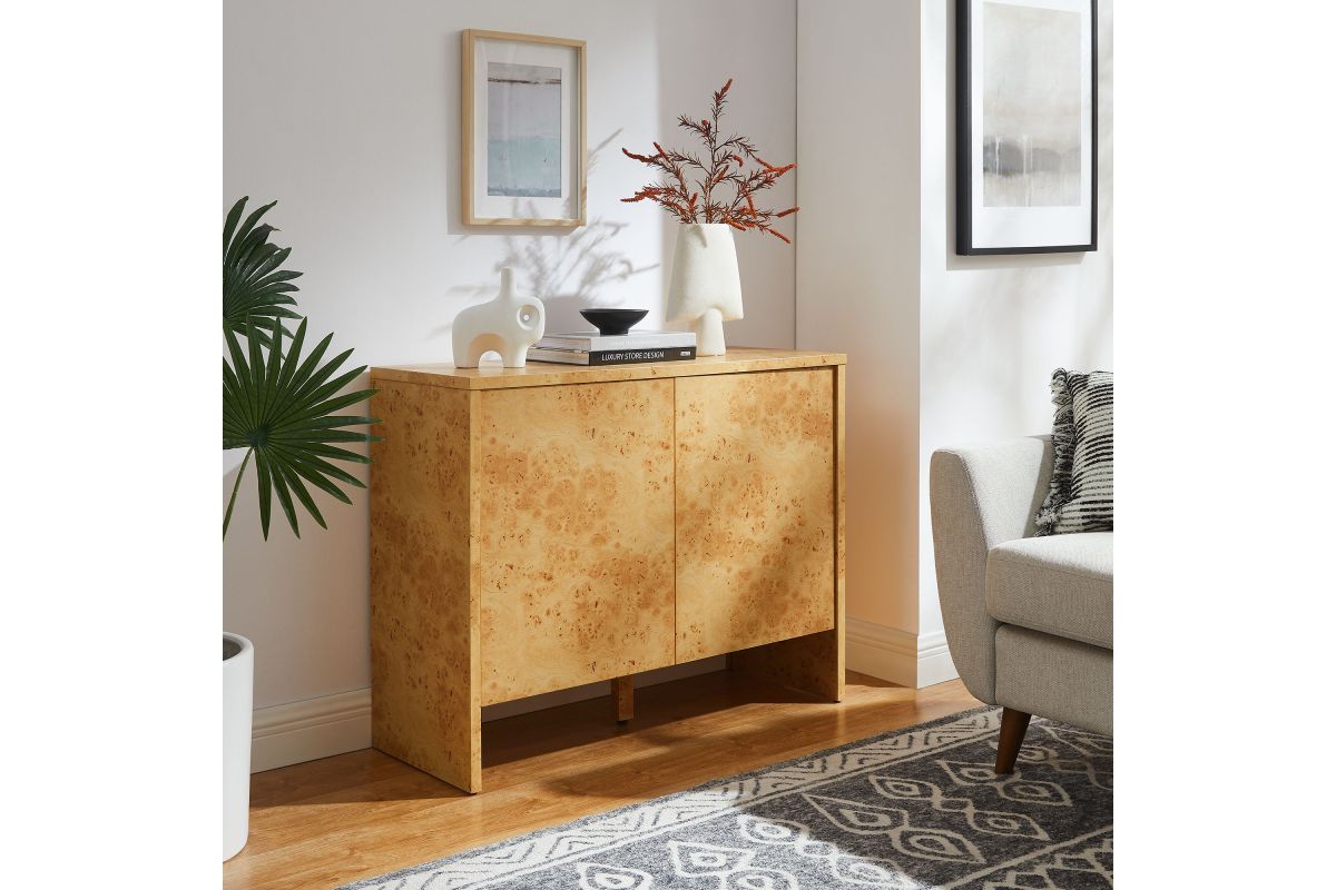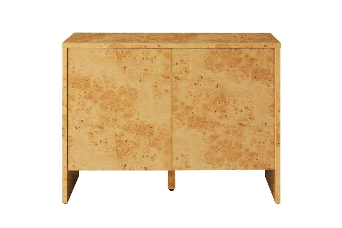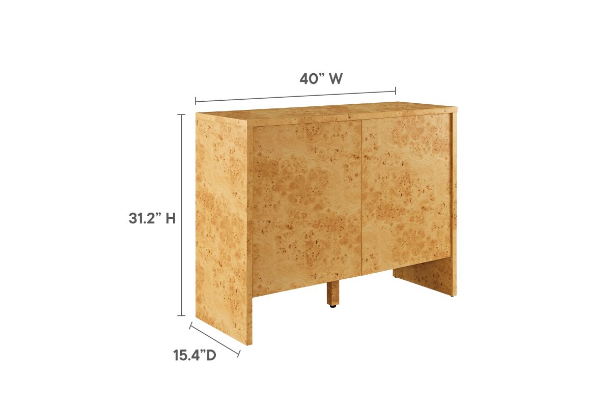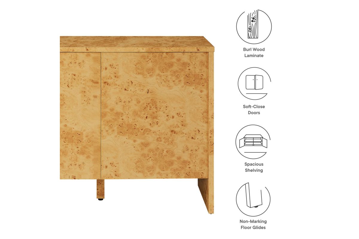 Discover the simplicity and allure of the Hudson 40 Inch Sideboard. Featuring a minimalist design, this modern storage cabinet blends seamlessly into any contemporary setting. Crafted and adorned with a burl wood paper laminate, this 40-inch cabinet exudes sophistication and durability. Featuring two soft-close doors, the spacious shelving area inside makes it a practical addition to any kitchen, dining area, or entryway. Designed with non-marking floor glides to protect your surfaces, the Hudson Sideboard with 2 Doors offers both style and enhanced functionality. Whether used as a kitchen sideboard, media cabinet, or an office credenza, the Hudson Burl Wood Buffet enhances any room with its contemporary elegance and sleek design. Assembly required.
