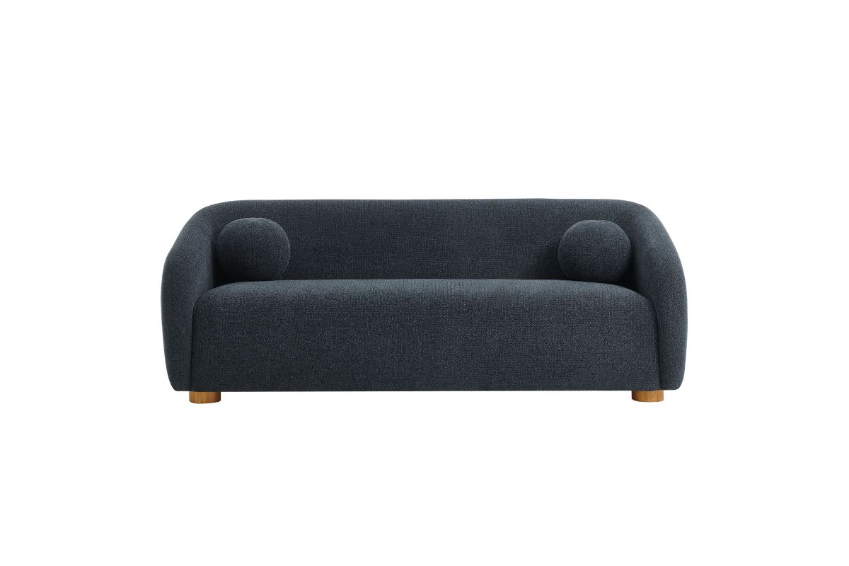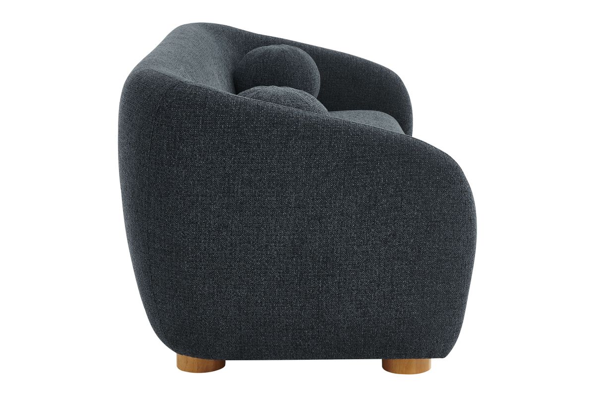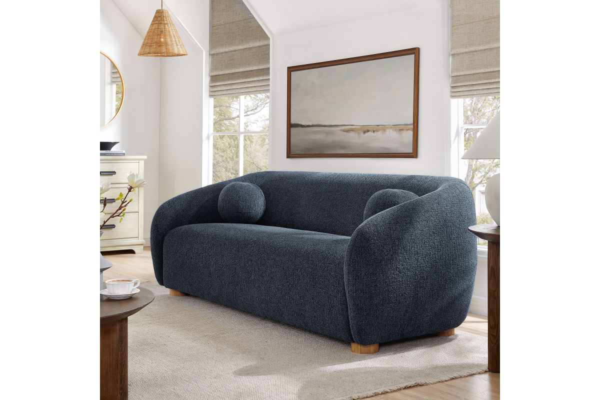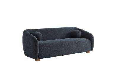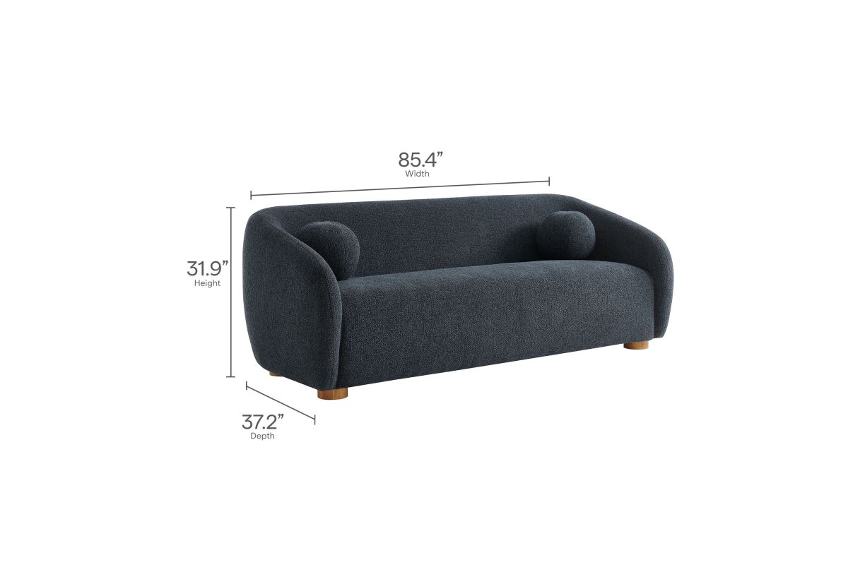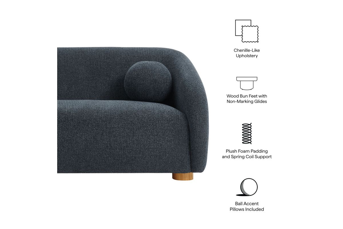 Transform your living space with the Holland 85” Curved Sofa, where tailored elegance meets modern comfort. Upholstered in a textured chenille-like fabric with boucle-inspired depth, this fabric sofa adds a sophisticated, cozy appeal to any room. Better for you and the environment, the upholstery fabric is also OEKO-TEX® STANDARD 100 Certified. The unique curved silhouette, sloping armrests, and soft, rounded edges create a minimalist look that feels both contemporary and inviting. Holland’s bench seat is generously padded with dense foam and supported by spring coil construction, offering extra deep seating for a cloud-like lounging experience. Resting on wood bun feet with non-marking floor glides, this modern curved sofa includes two matching ball accent pillows for added style and comfort. Perfect for living rooms, apartments, or offices, the Holland Boucle Sofa is a statement piece that blends form and function effortlessly. Simple assembly required. Weight Capacity: 800 lbs.