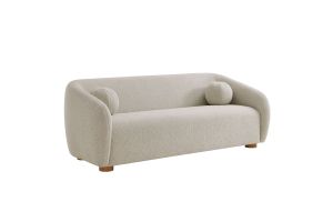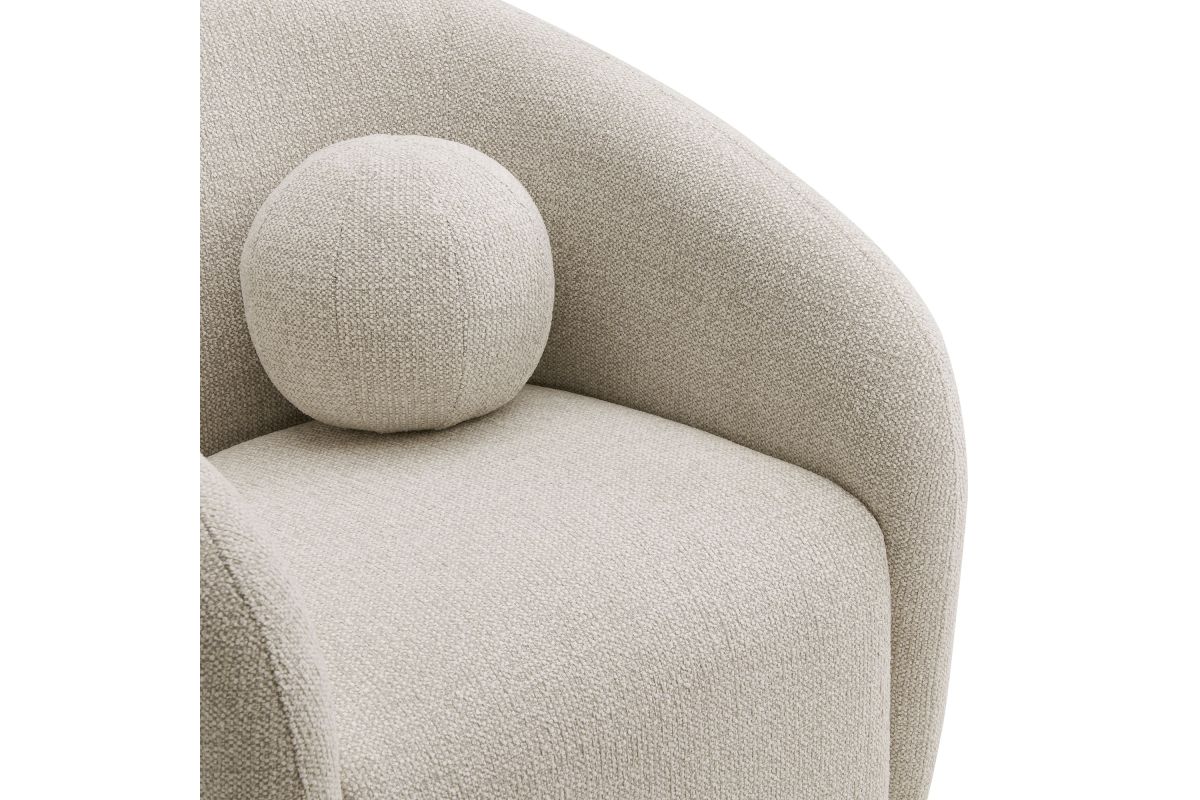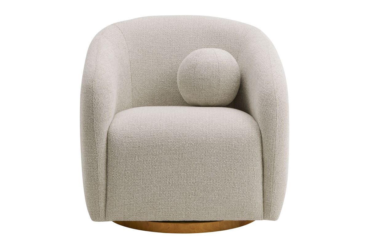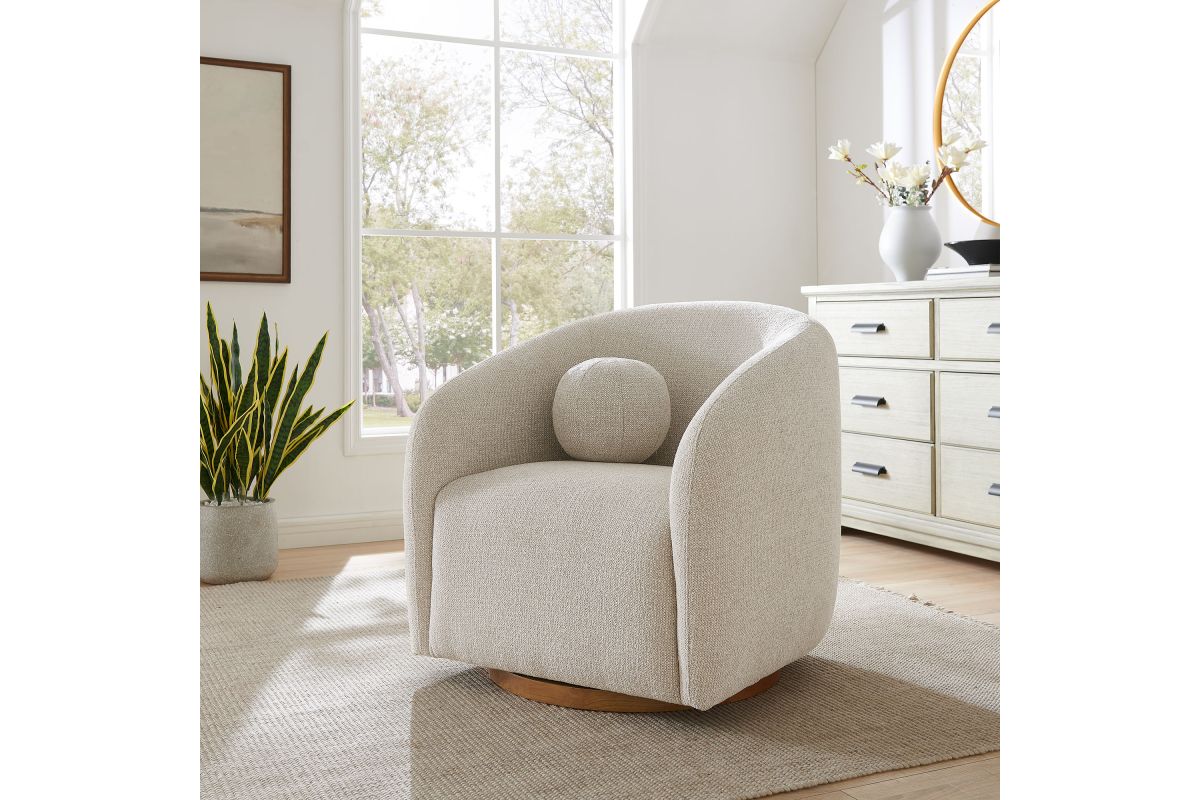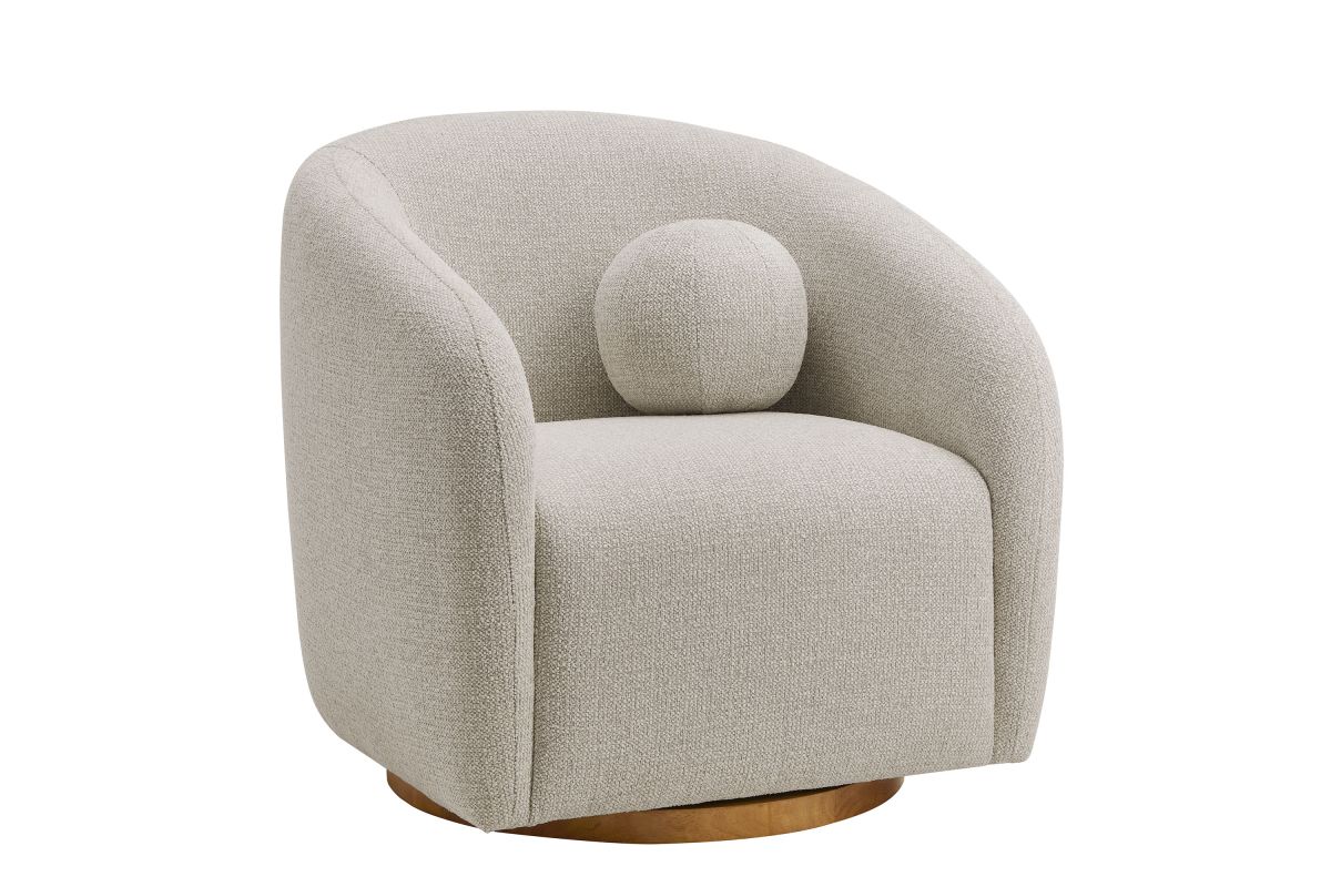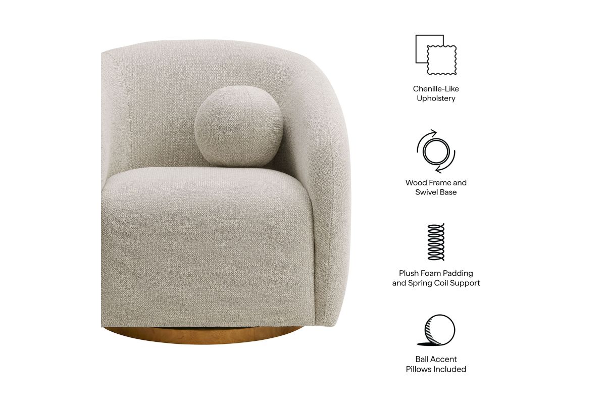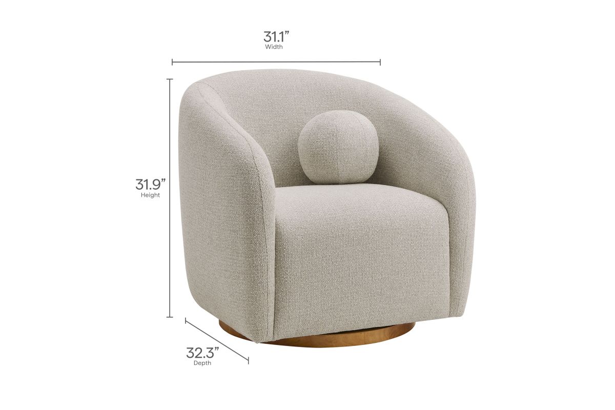 Transform your living space with the Holland Curved Swivel Armchair, where tailored elegance meets modern comfort. Upholstered in a textured chenille-like fabric with boucle-inspired depth, this accent armchair adds a sophisticated, cozy appeal to any room. Better for you and the environment, the upholstery fabric is also OEKO-TEX® STANDARD 100 Certified. The unique curved silhouette, sloping armrests, and soft, rounded edges create a minimalist look that feels both contemporary and inviting. Holland’s generous foam padding, spring coil support, and smooth swivel base offer plush, cloud-like seating with effortless mobility. Resting on a sturdy wood base with non-marking floor glides, this modern curved chair includes one matching ball accent pillow for added style and comfort. Perfect for living rooms, apartments, or offices, the Holland Barrel Swivel Armchair is a statement piece that blends form and function effortlessly. Arrives fully assembled. Weight Capacity: 800 lbs.