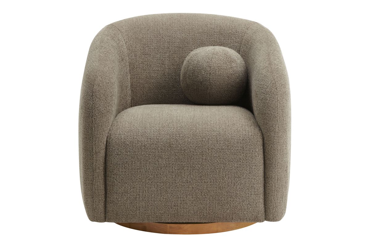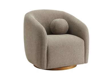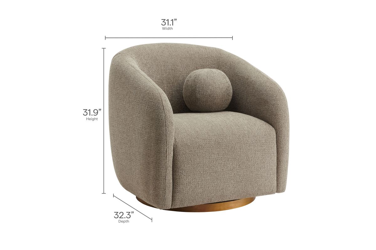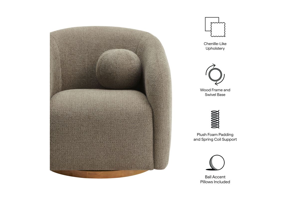 Transform your living space with the Holland Curved Swivel Armchair, where tailored elegance meets modern comfort. Upholstered in a textured chenille-like fabric with boucle-inspired depth, this accent armchair adds a sophisticated, cozy appeal to any room. Better for you and the environment, the upholstery fabric is also OEKO-TEX® STANDARD 100 Certified. The unique curved silhouette, sloping armrests, and soft, rounded edges create a minimalist look that feels both contemporary and inviting. Holland’s generous foam padding, spring coil support, and smooth swivel base offer plush, cloud-like seating with effortless mobility. Resting on a sturdy wood base with non-marking floor glides, this modern curved chair includes one matching ball accent pillow for added style and comfort. Perfect for living rooms, apartments, or offices, the Holland Barrel Swivel Armchair is a statement piece that blends form and function effortlessly. Arrives fully assembled. Weight Capacity: 800 lbs.