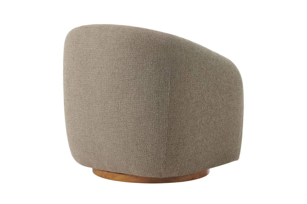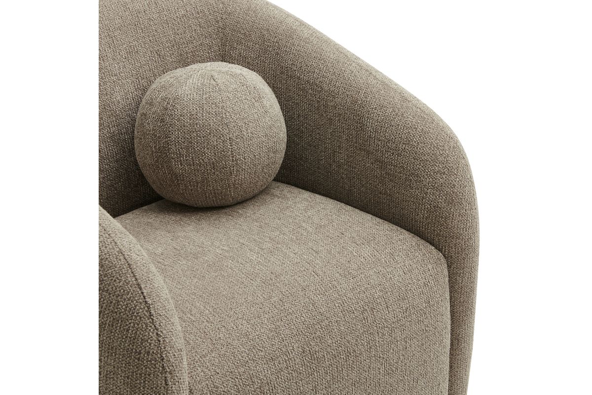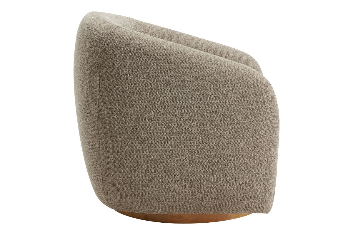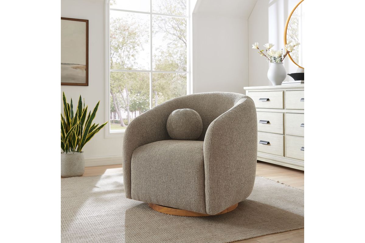 Transform your living space with the Holland Curved Swivel Armchair, where tailored elegance meets modern comfort. Upholstered in a textured chenille-like fabric with boucle-inspired depth, this accent armchair adds a sophisticated, cozy appeal to any room. Better for you and the environment, the upholstery fabric is also OEKO-TEX® STANDARD 100 Certified. The unique curved silhouette, sloping armrests, and soft, rounded edges create a minimalist look that feels both contemporary and inviting. Holland’s generous foam padding, spring coil support, and smooth swivel base offer plush, cloud-like seating with effortless mobility. Resting on a sturdy wood base with non-marking floor glides, this modern curved chair includes one matching ball accent pillow for added style and comfort. Perfect for living rooms, apartments, or offices, the Holland Barrel Swivel Armchair is a statement piece that blends form and function effortlessly. Arrives fully assembled. Weight Capacity: 800 lbs.