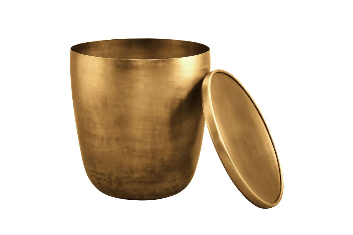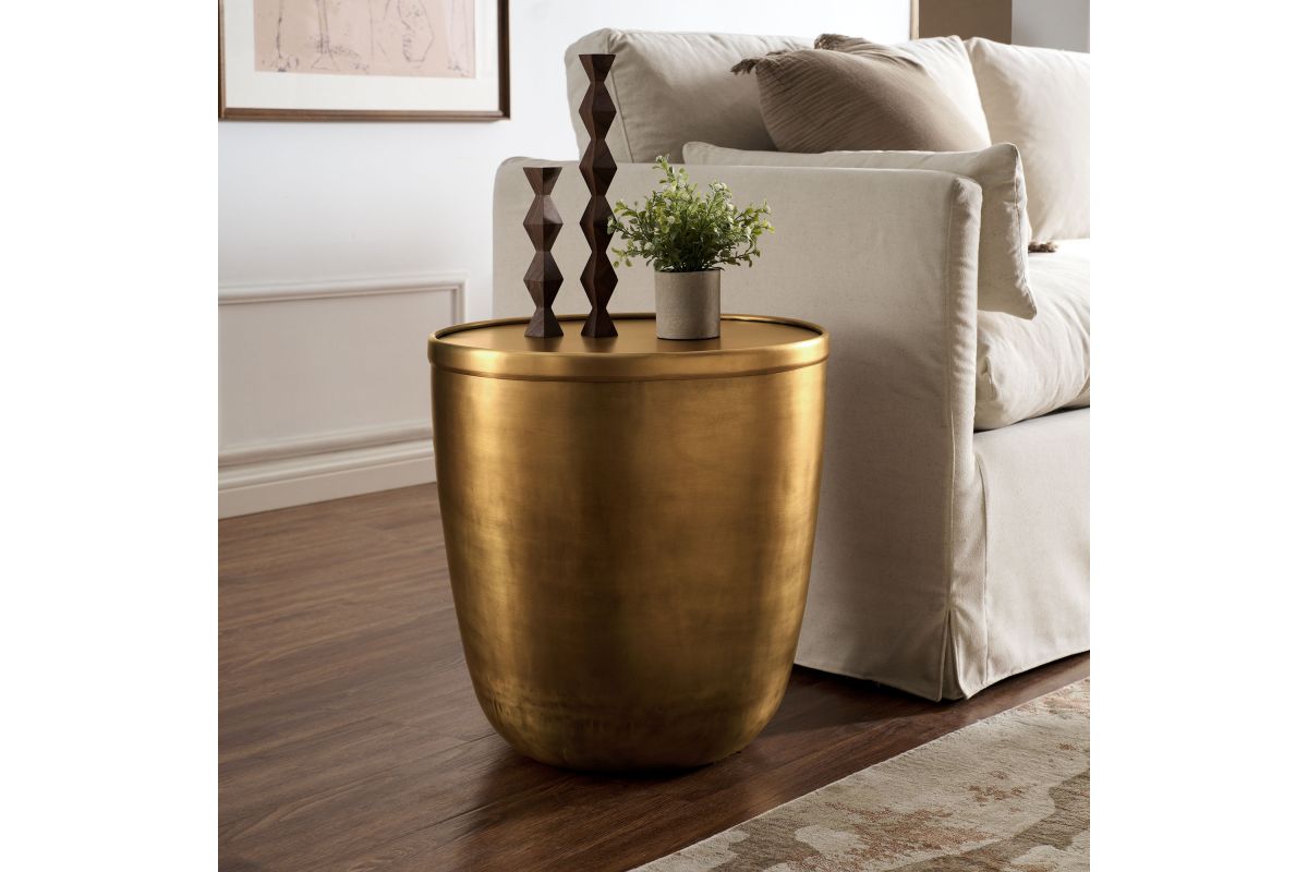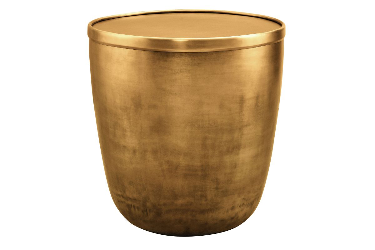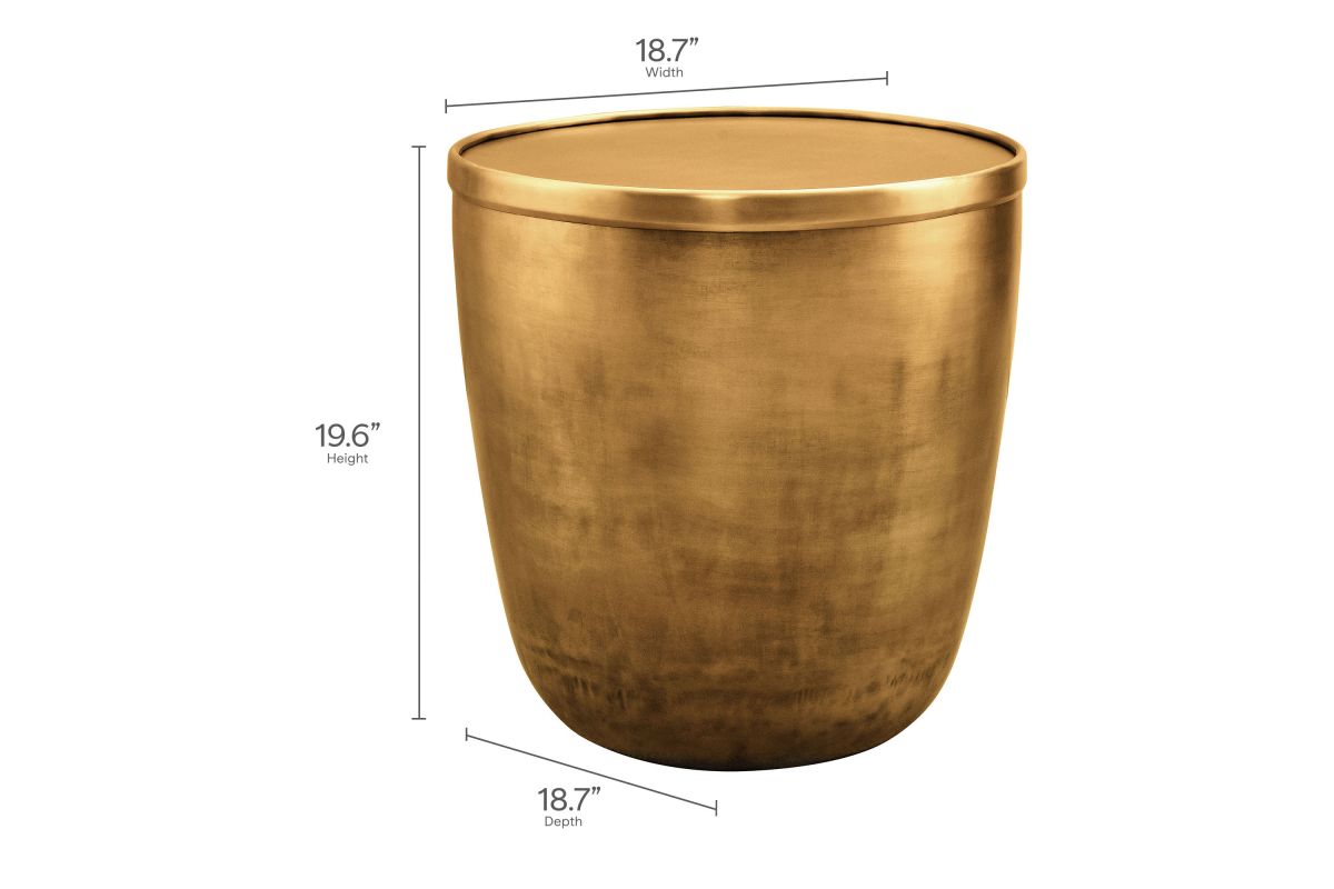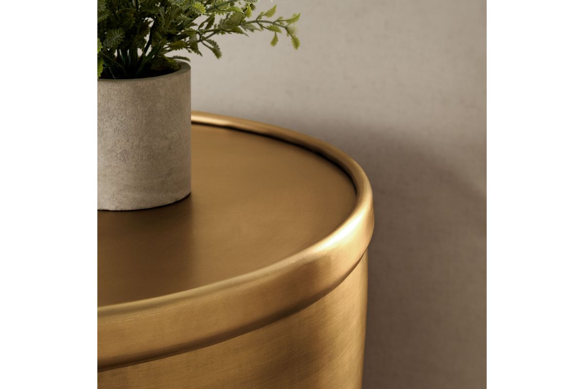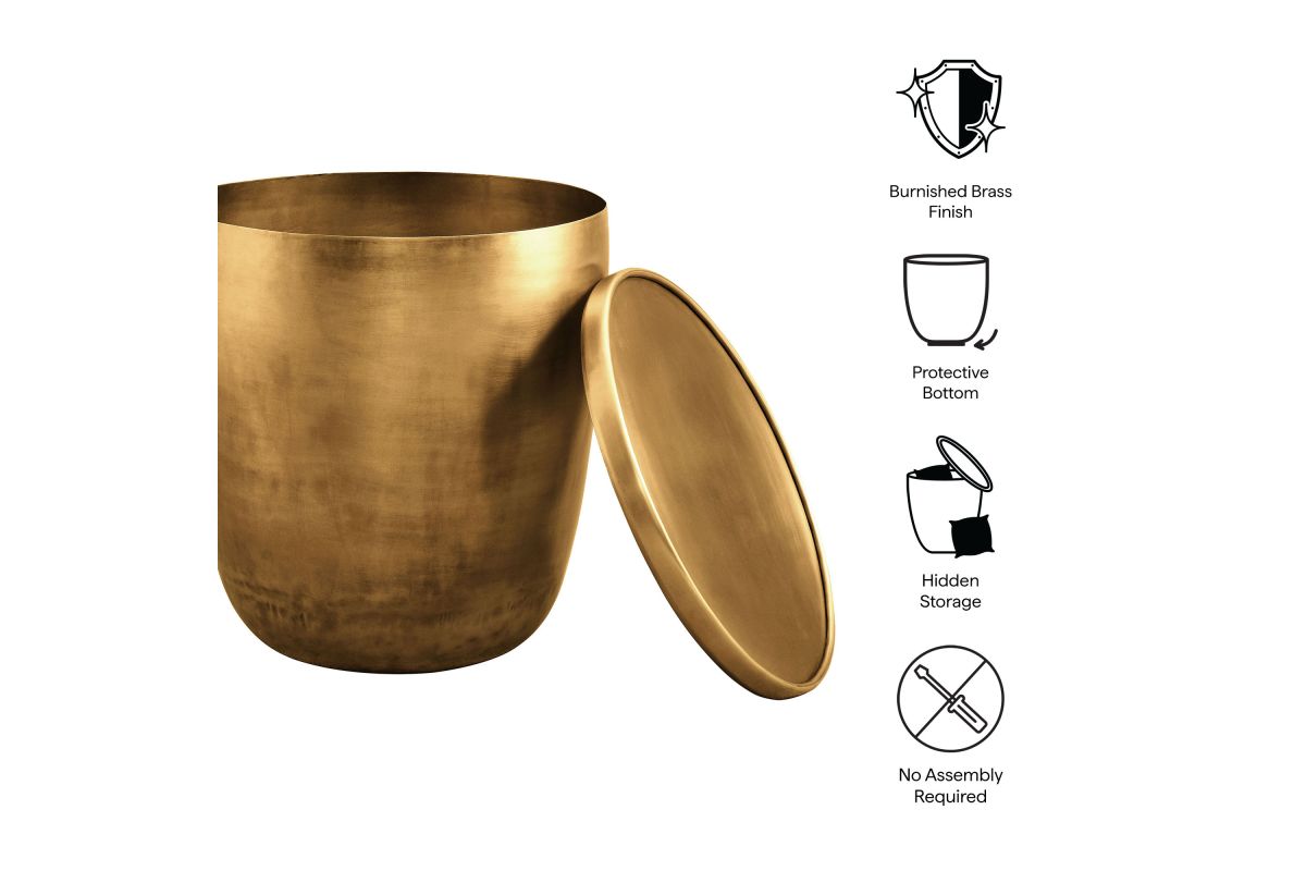 Add a touch of modern convenience to your home with the Viora Storage Accent Side Table. Featuring a stunning burnished brass finish, this metal accent table offers a stylish look with practical functionality. The sleek cylindrical design is complemented by a removable lid for storage, providing a hidden compartment for keeping essentials tucked away. Perfect for use as a small living room end table, it can easily double as a stylish plant stand or metal drum table in your bedroom. Designed with durability in mind, the Viora Small Round End Table features a protective bottom that shields your floors from scratches. Ideal for elevating your space with both style and utility, this metal storage accent table fits perfectly into contemporary or industrial-themed interiors. Weight Capacity: 73 lbs.