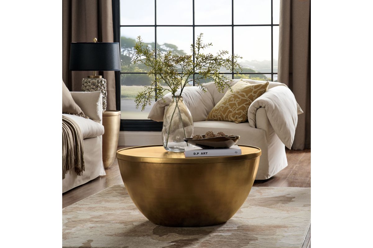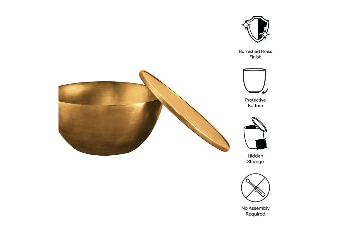 Add a touch of modern convenience to your home with the Viora 32 Inch Round Coffee Table. Featuring a stunning burnished brass finish, this metal drum coffee table combines stylish design with practical storage. The sleek, cylindrical shape is complemented by a removable lid, offering a hidden compartment perfect for storing books, remote controls, or blankets. Ideal as a statement piece in your living room, this chic circle coffee table also doubles as a practical solution for organizing everyday essentials. Designed with durability in mind, the Viora Living Room Center Table features a protective bottom that shields your floors from scratches. Combining style and utility, this round coffee table with storage fits perfectly into contemporary, industrial, or minimalist interiors. Weight Capacity: 226 lbs.