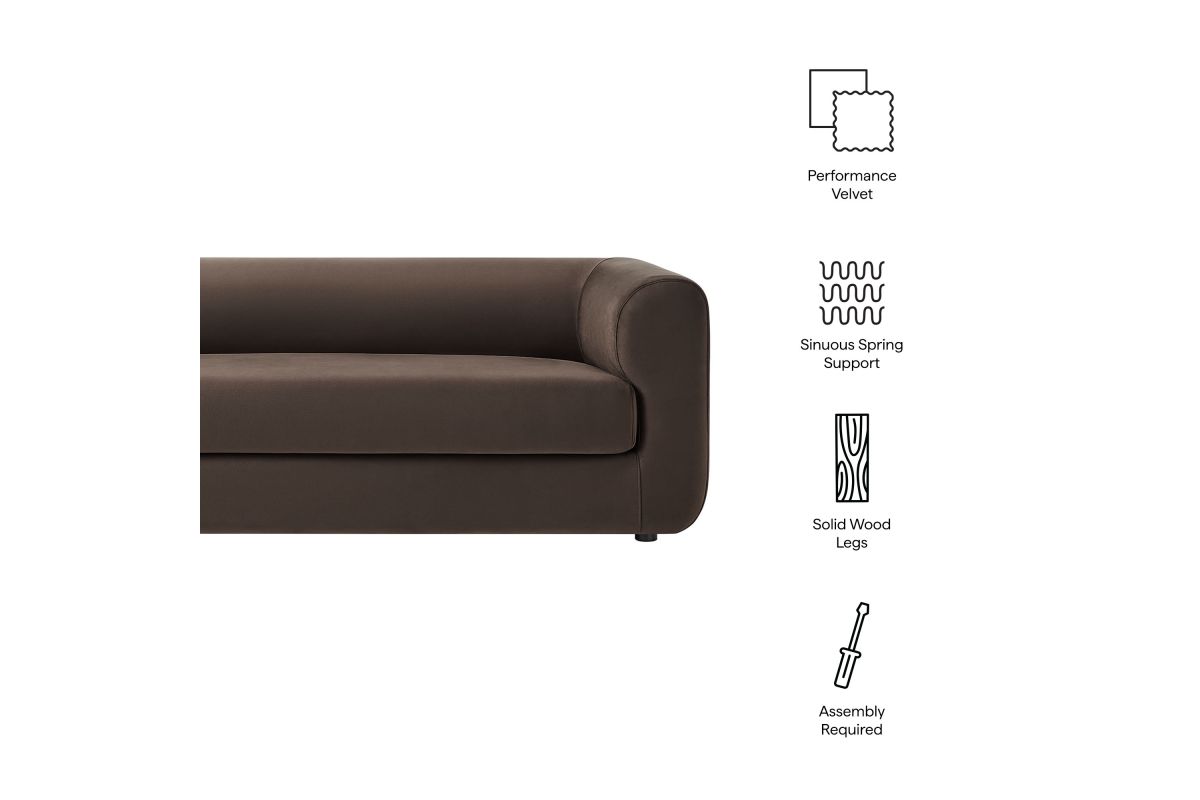 Sleek, sculptural, and effortlessly modern, the Leif Performance Velvet Sofa makes a refined statement with its updated tuxedo silhouette and stain-resistant performance velvet upholstery. Designed for both style and comfort, this 89-inch oversized velvet couch features a roll-arm frame that blends into the supportive backrest at the same height, giving it a structured yet inviting presence. A deep bench seat on this modern sofa offers ample space for lounging, while its foam padding and sinuous spring support provide lasting comfort. The low-profile wood legs give this sofa a chic, floating appearance, making it a standout piece in living rooms, offices, or lounges. Fully assembled and ready to elevate your space. Weight Capacity: 800 lbs.