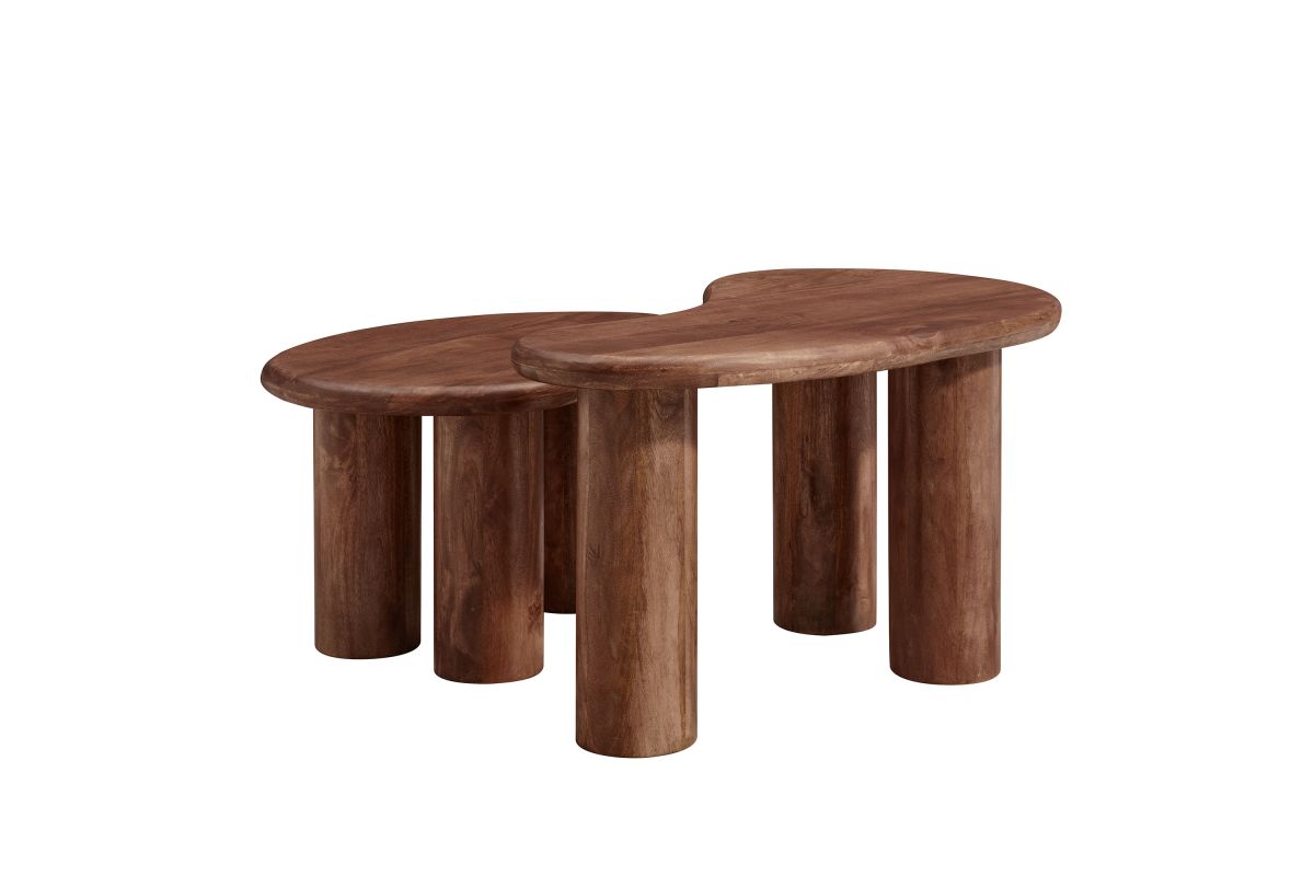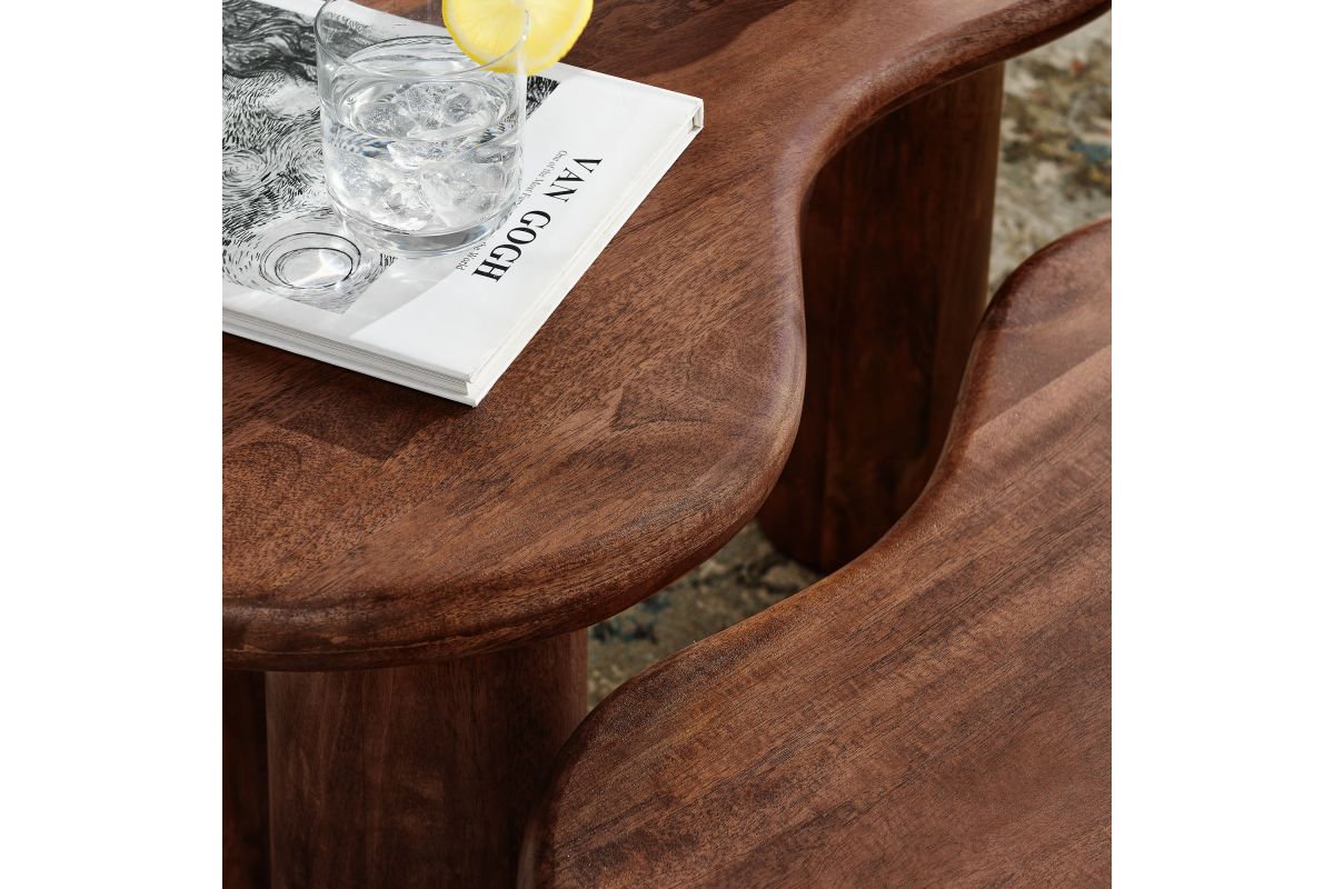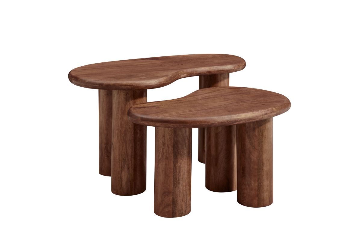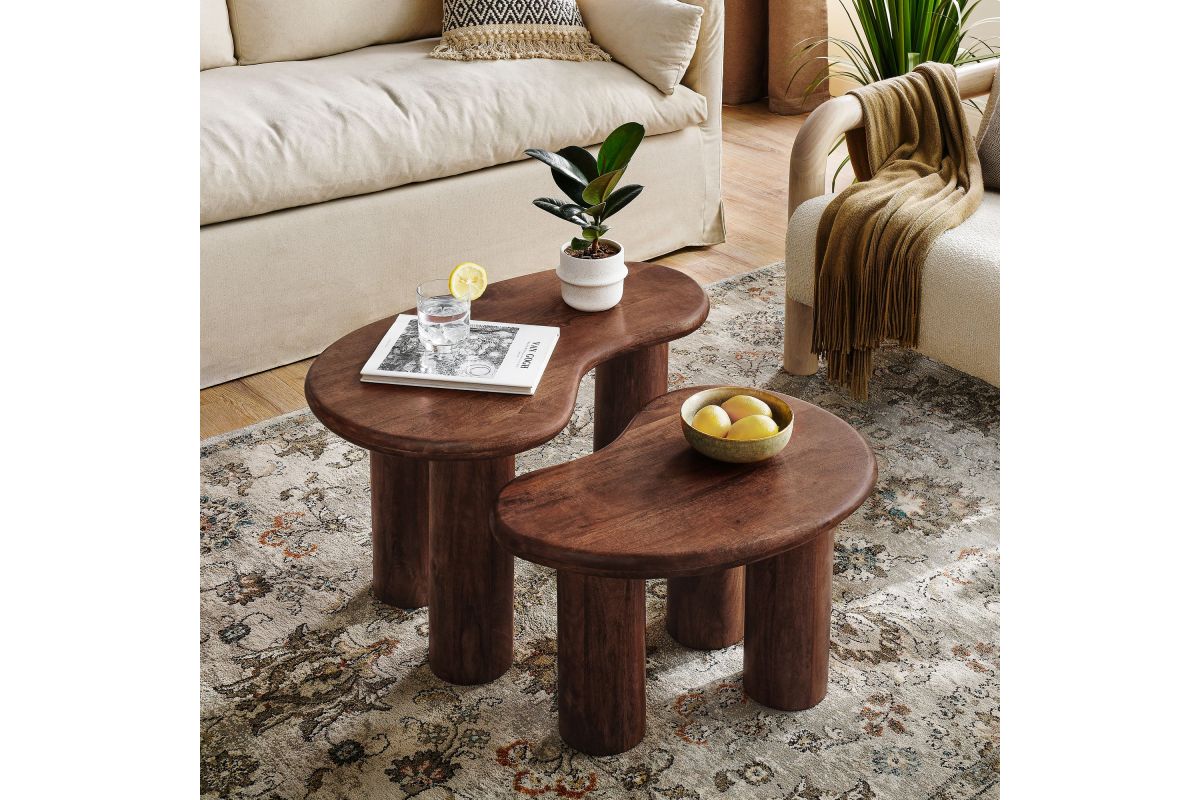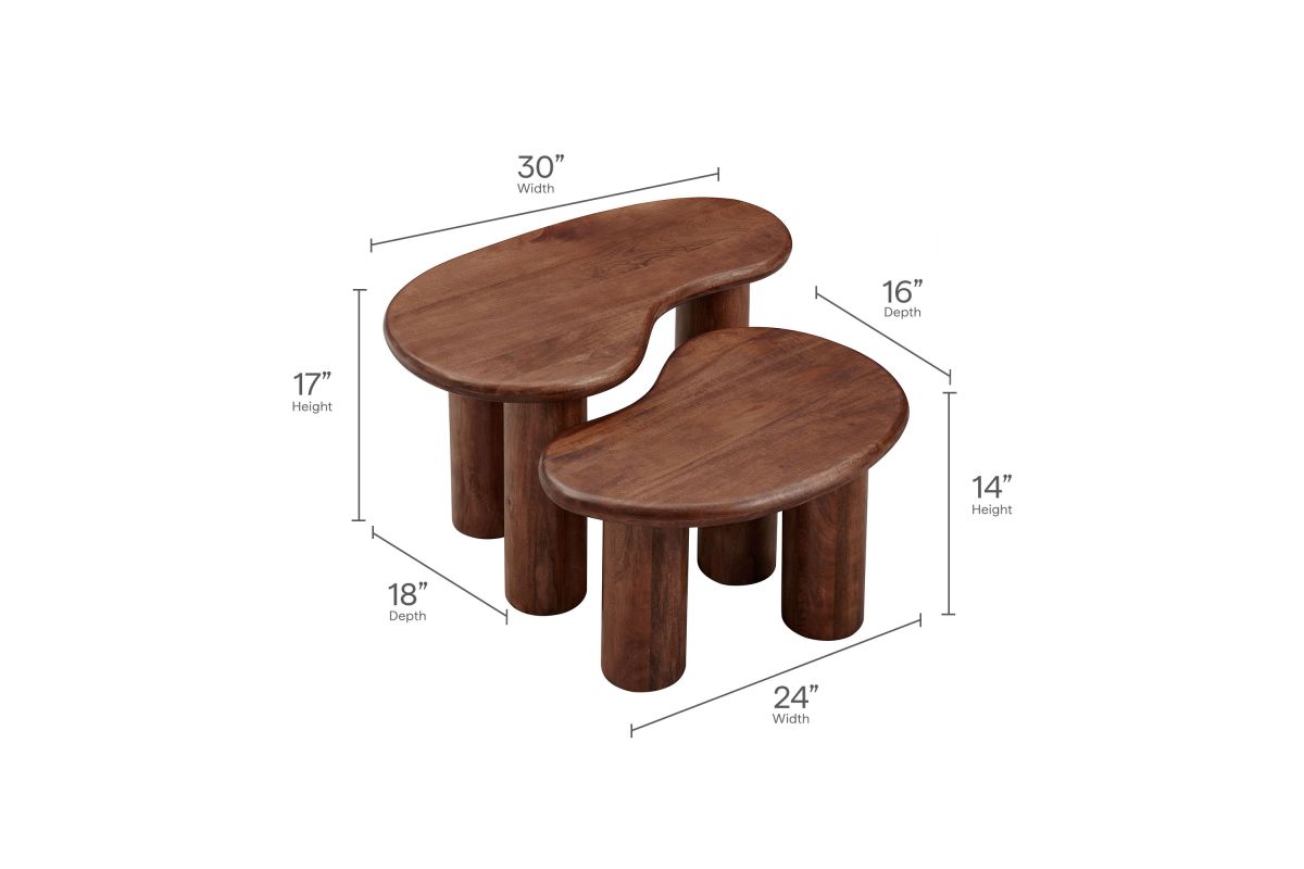 Sculptural, functional, and uniquely modern – the Hackney Nesting Coffee Table Set is a statement piece for your home. Made from solid mango wood, this set features two kidney-shaped tables, with one larger than the other, that can be nested together as a bold coffee table or separated into stylish side or end tables to suit your needs. The convenient nesting design offers flexibility, allowing you to adjust the layout of your space with ease. Each table is supported by three sturdy legs, and non-marking felt pads ensure your floors remain scratch-free. The Hackney Mango Wood Nesting Coffee Table Set of 2 is perfect for those who want a stylish, wood coffee table that fits into any modern living room, whether it's spacious or cozy. Assembly required. Weight Capacity: 200 lbs