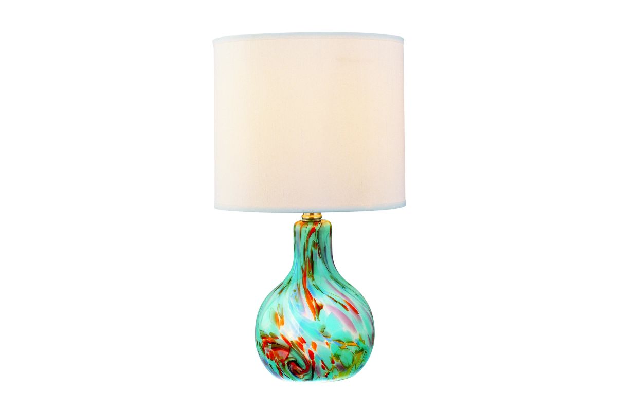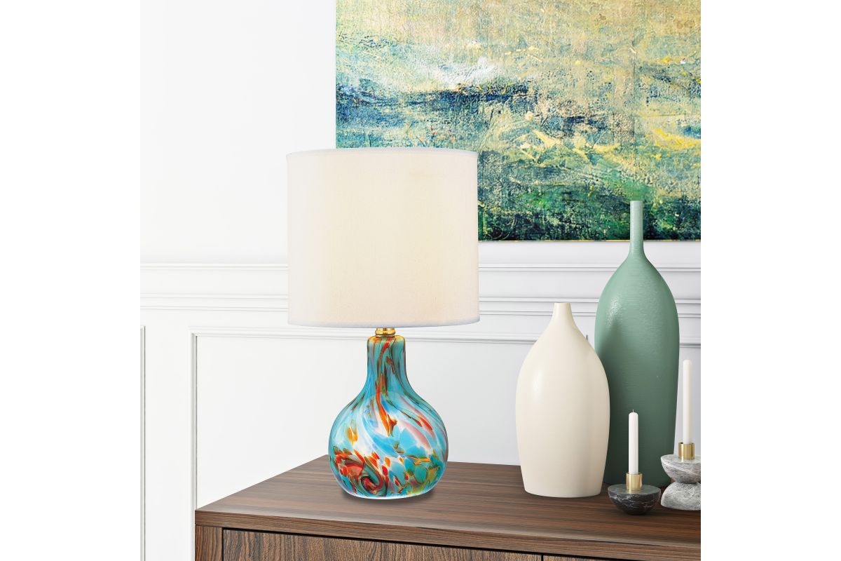 Features a marbleized aqua glass base, offering a soft, translucent glow. Equipped with an off-white fabric drum shade, providing a warm and diffused light. Contemporary with a touch of coastal charm, suitable for modern or transitional interiors Perfect for bedside tables, living room side tables, or as a decorative accent in various settings.