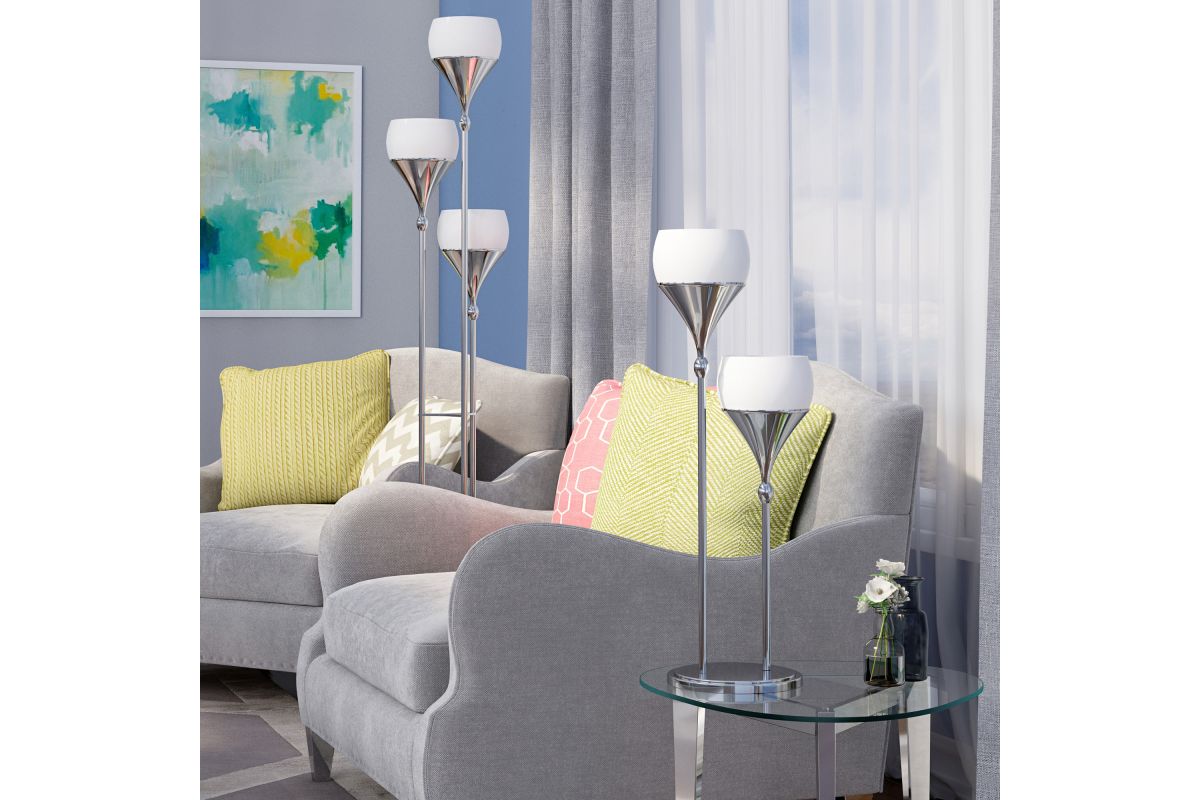 The Celestel Table Lamp features a sleek polished chrome base supporting two frosted glass shades, each housing a 13W CFL bulb. Standing at approximately 30.75 inches tall, this lamp offers a contemporary silhouette suitable for modern interiors. Its upward-facing design provides uplighting, creating a warm and inviting ambiance. Perfect for living rooms, bedrooms, or entryways, the Celestel lamp combines style and functionality, making it a versatile addition to any space.