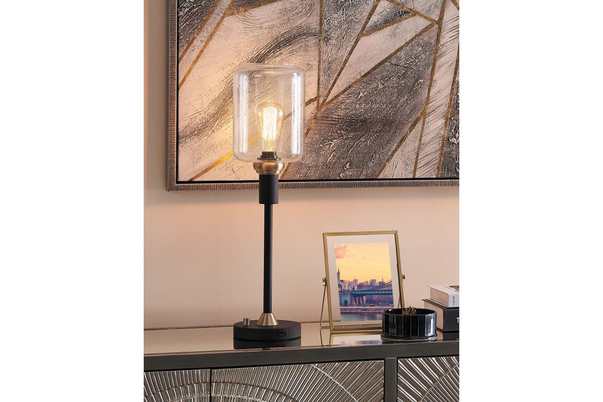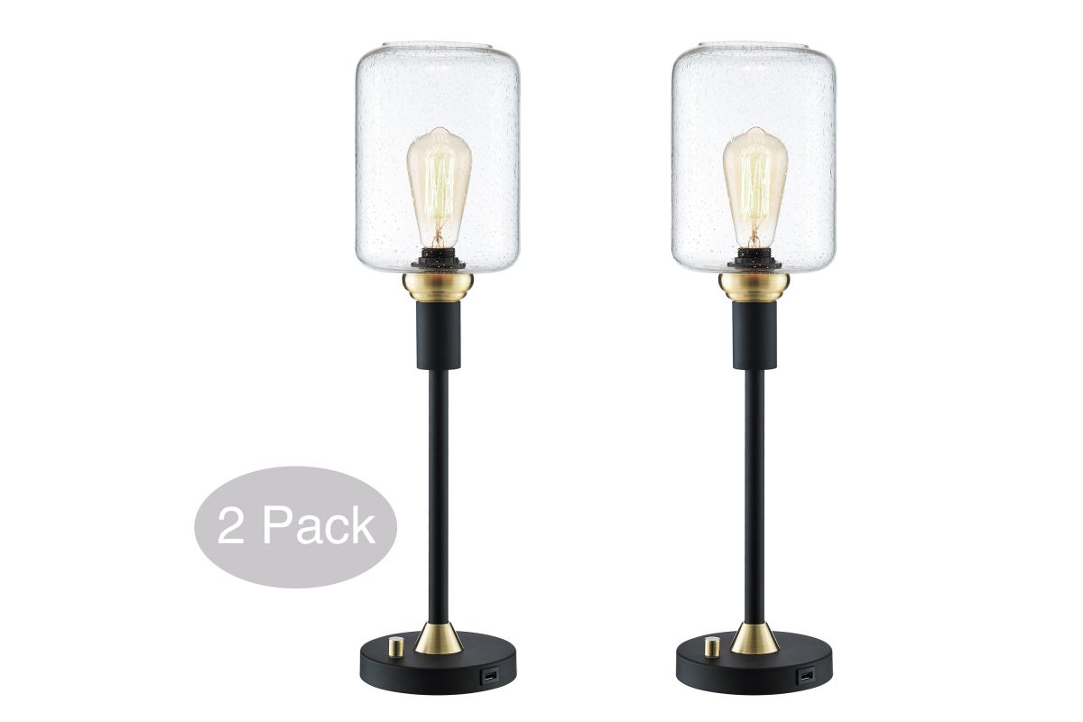 Double the style with this set of two modern industrial table lamps. Each lamp features a clear rectangular glass shade, paired with a black and antique brass base for a striking contrast. The exposed Edison-style bulbs add a vintage touch, while the slender profile makes them ideal for compact spaces like nightstands, desks, or console tables. Whether used together or separately, these lamps bring balanced elegance and a warm, ambient glow to any room.