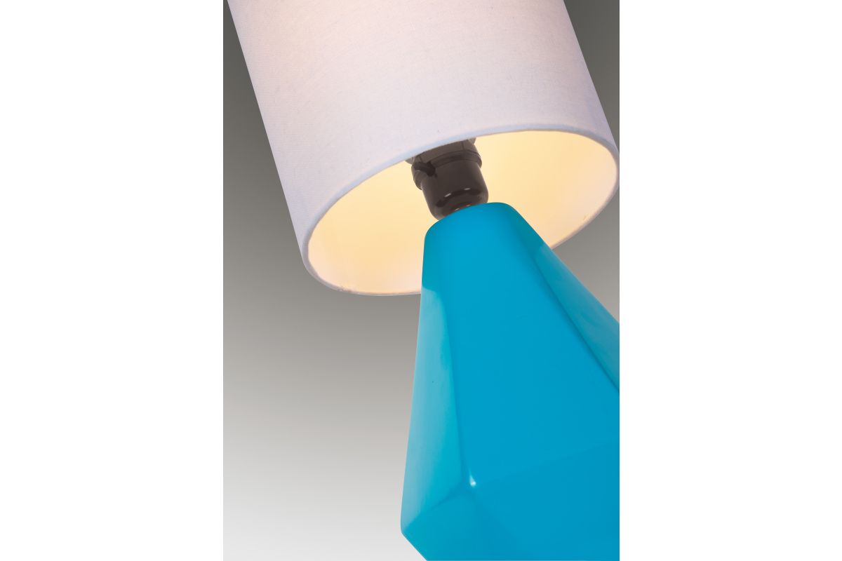 The Lite Source LS-23204BLU Mason Table Lamp features a geometric ceramic base in various finishes, complemented by a white linen drum shade. Standing at 17 inches tall with a 7-inch diameter, this lamp is designed to add a pop of color and modern flair to any space. It accommodates a 60W E27 bulb (not included) and includes an on/off push button switch for convenience. Its compact size makes it ideal for bedside tables, desks, or accent areas, enhancing both functionality and style in your home or office.