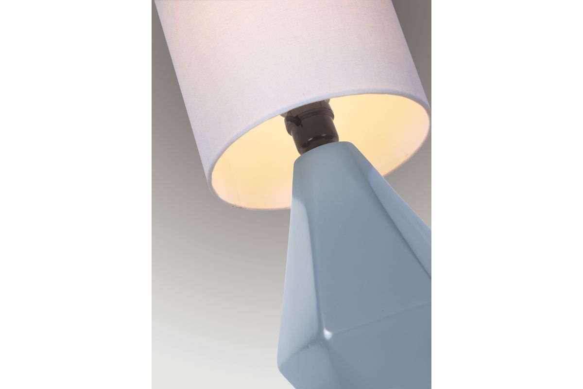 The Lite Source LS-23204BLU Mason Table Lamp features a geometric ceramic base in various finishes, complemented by a white linen drum shade. Standing at 17 inches tall with a 7-inch diameter, this lamp is designed to add a pop of color and modern flair to any space. It accommodates a 60W E27 bulb (not included) and includes an on/off push button switch for convenience. Its compact size makes it ideal for bedside tables, desks, or accent areas, enhancing both functionality and style in your home or office.
