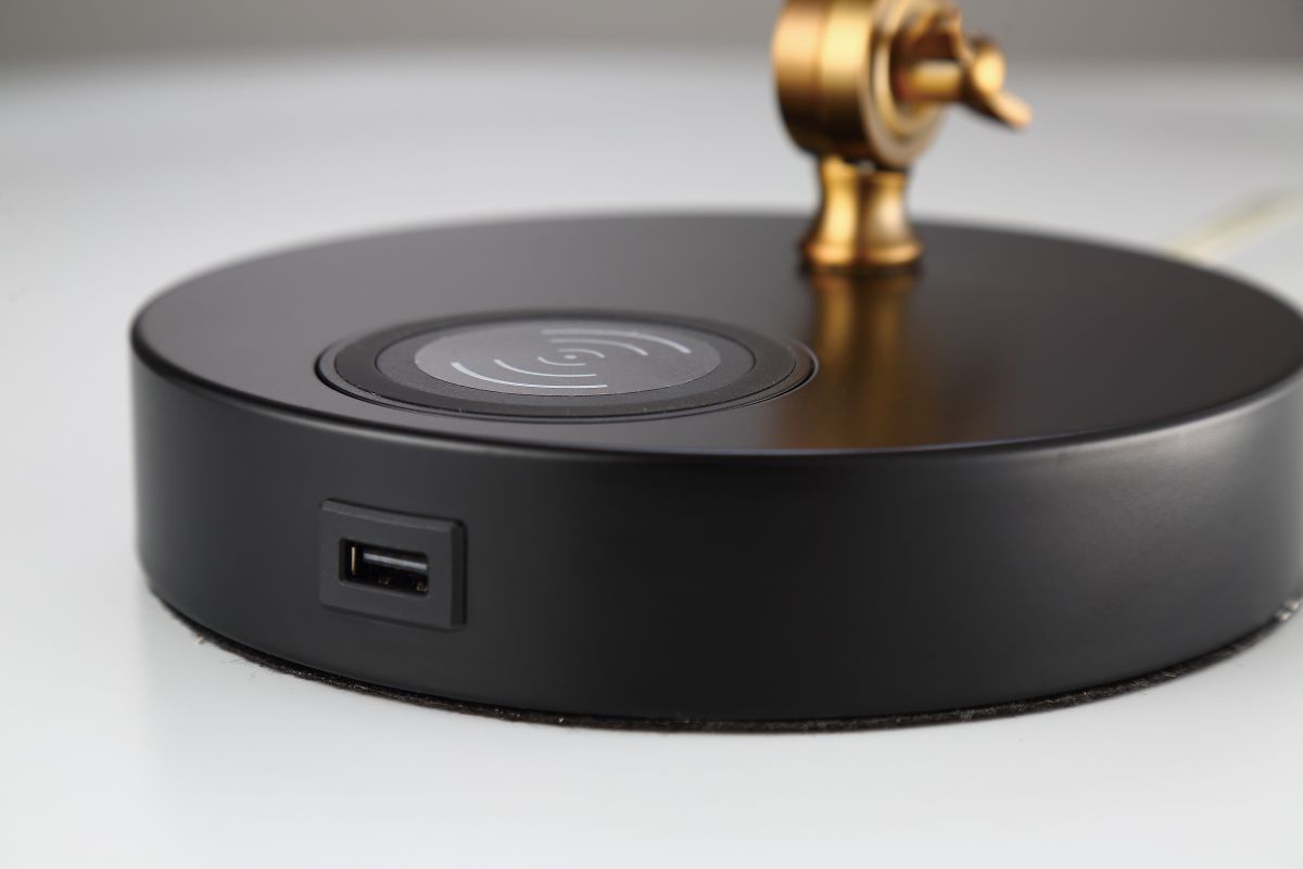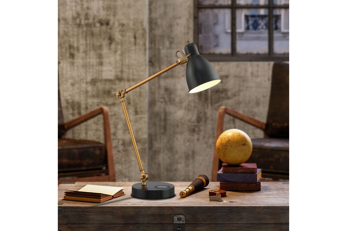 Enhance your workspace with this vintage-inspired adjustable desk lamp, featuring an articulating brass-finished arm and a matte black metal shade. Designed for both form and function, its pivoting joints allow for customizable lighting angles—perfect for reading, studying, or task lighting. The sleek, retro-industrial aesthetic adds a sophisticated edge to any desk, nightstand, or creative corner.