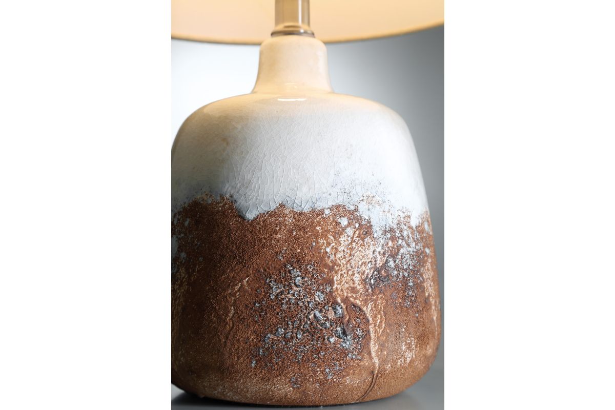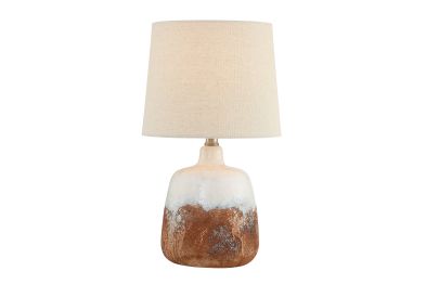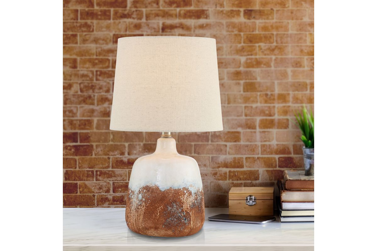 Bring organic elegance into your space with this rustic ombre ceramic table lamp. Featuring a rich blend of terracotta, white, and natural textured finishes, the handcrafted-style base exudes artisanal character. Topped with a classic linen drum shade, it casts a cozy, diffused light perfect for any room.