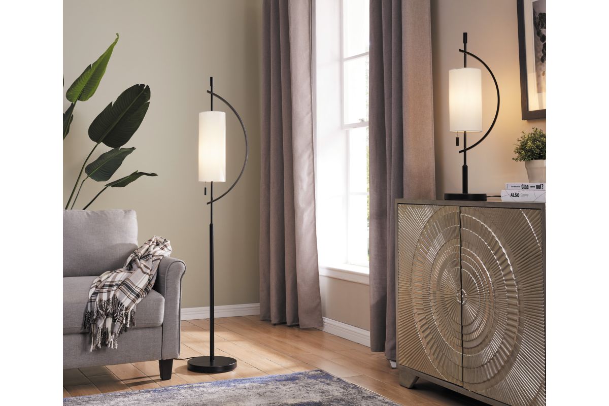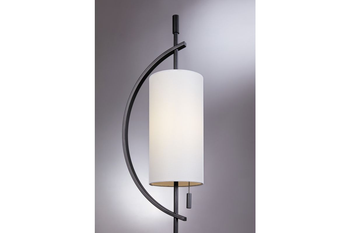 Add artistic sophistication to your space with this modern arc table lamp. Featuring a striking black metal frame that curves gracefully around a cylindrical white fabric shade, this lamp is a statement in balance and form. Its clean lines and unique silhouette make it perfect for contemporary living rooms, bedrooms, or office desks. With ambient lighting and sculptural presence, it blends function with elevated design.
