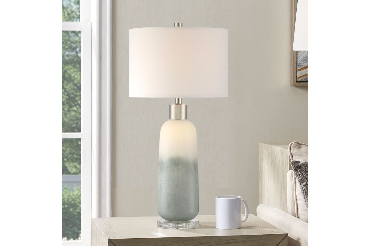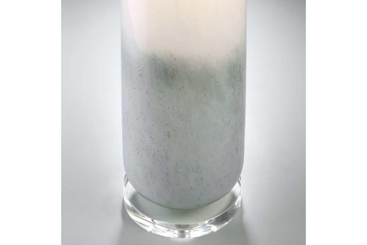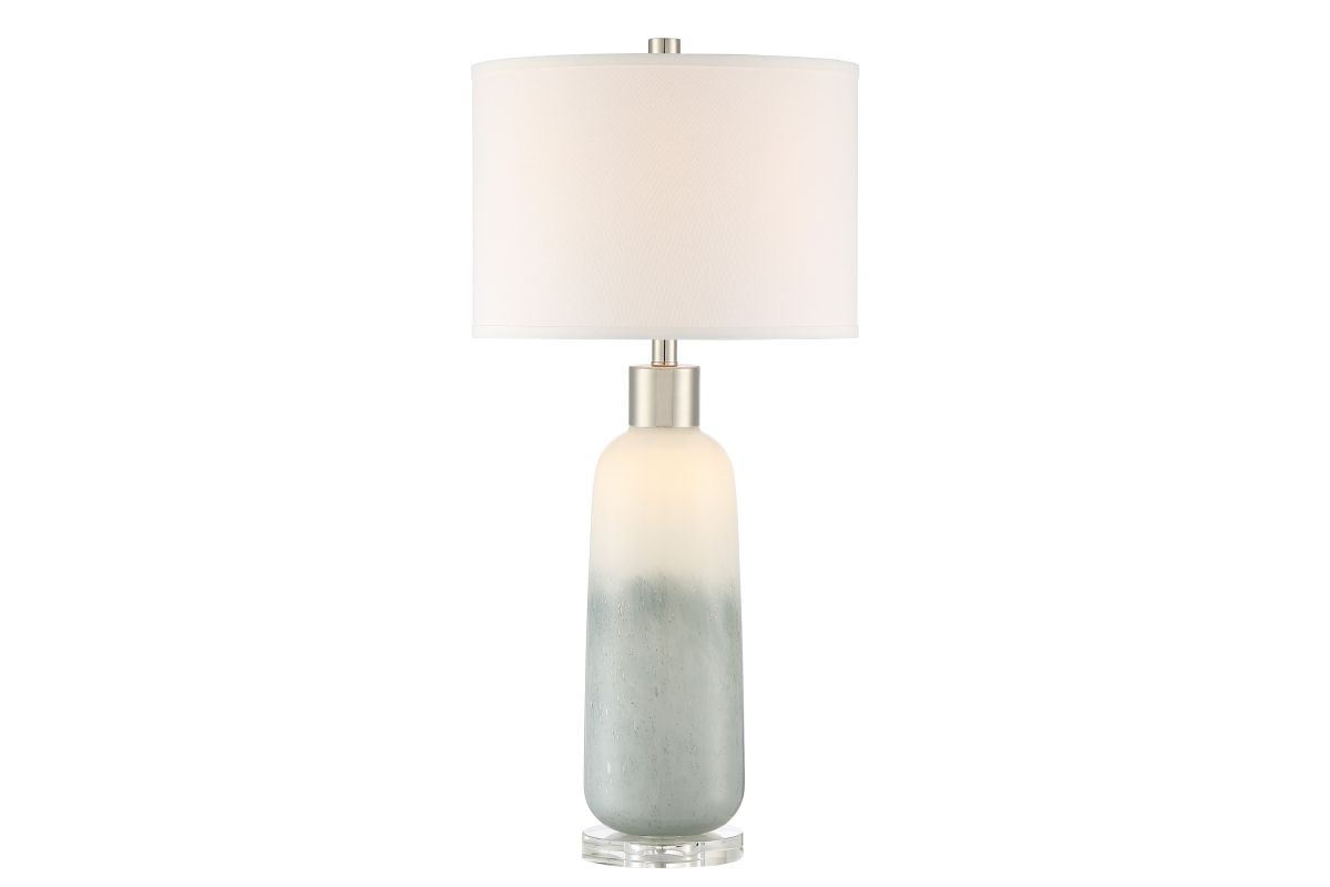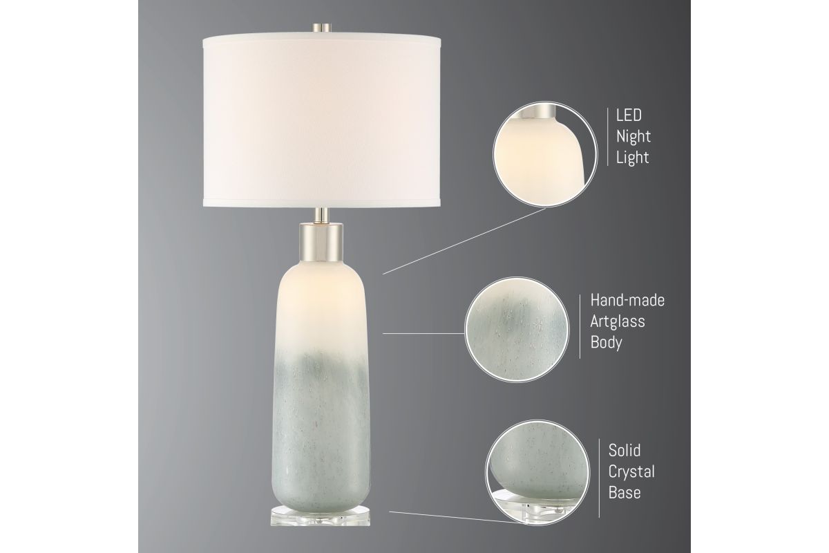 This art glass table lamp comes in a light grayish blue glass column that evokes the feelings of sky and sea. The lamp rests on a base of beautiful solid crystal which adds high-end touch to any decor. This lamp has a built-in LED nightlight feature within the base. 3-way switch allows you to turn on just the top light, nightlight or both ON at the same time. When turn on just the nightlight in the dark, the ambient lighting makes the lamp looks like an art piece. Perfect for a living room or bedroom space.
