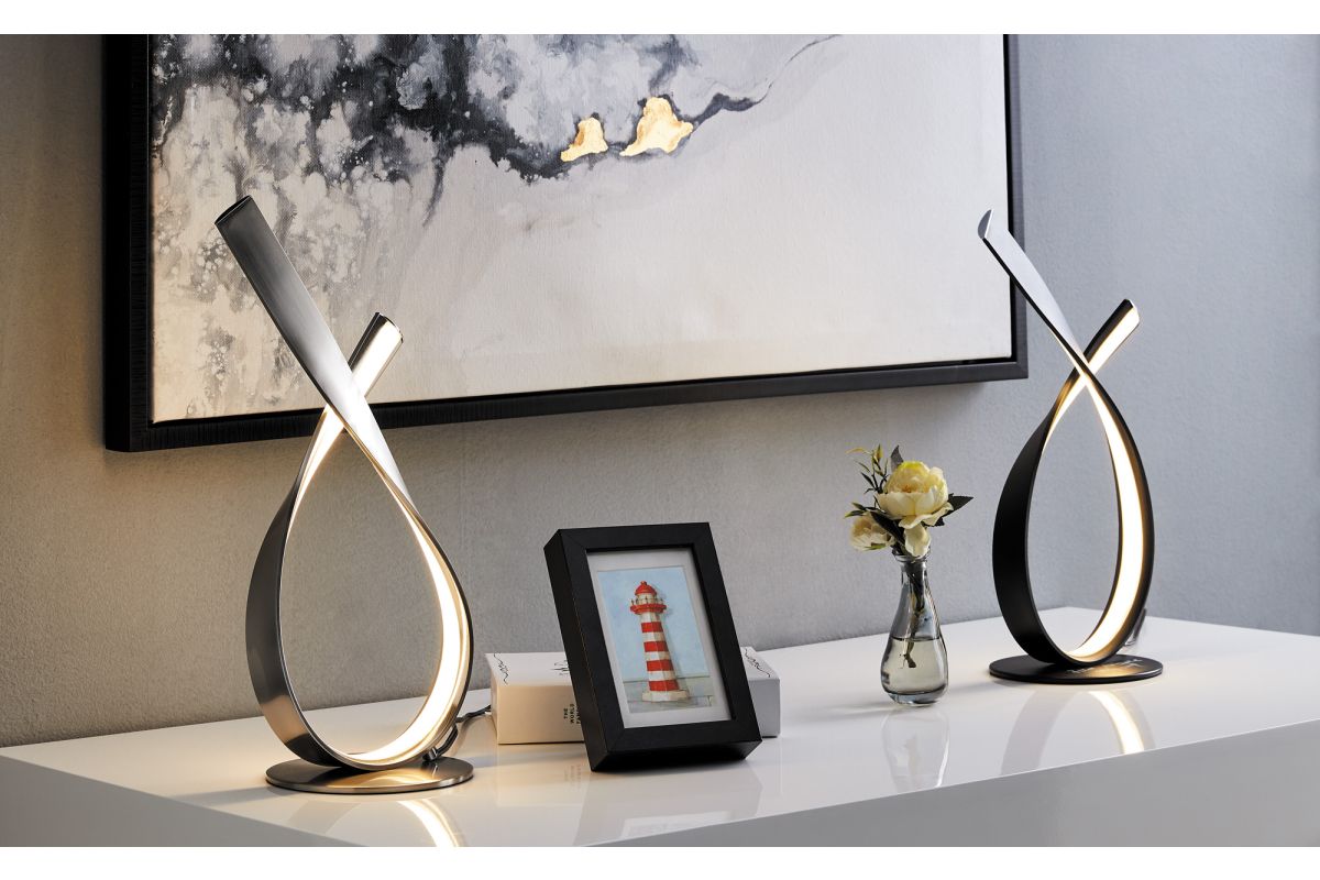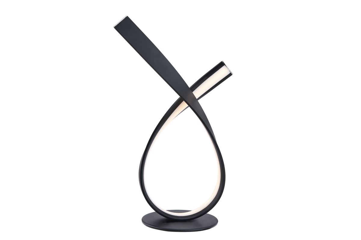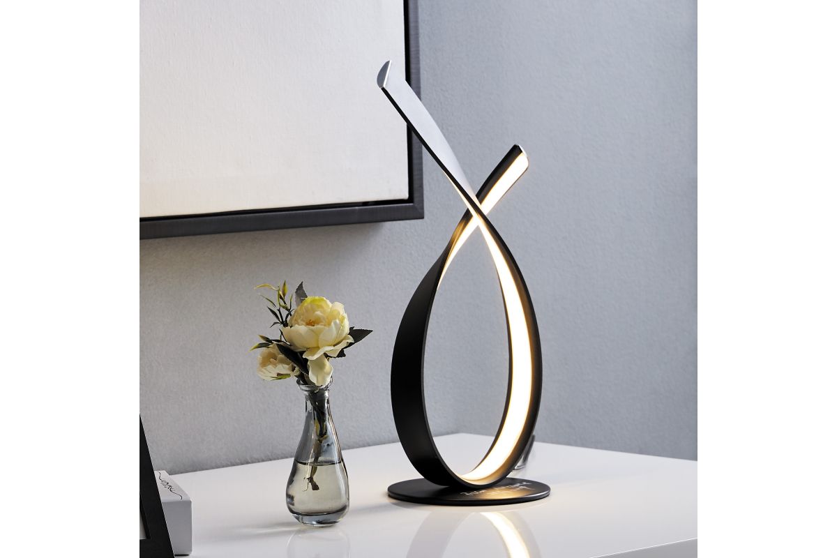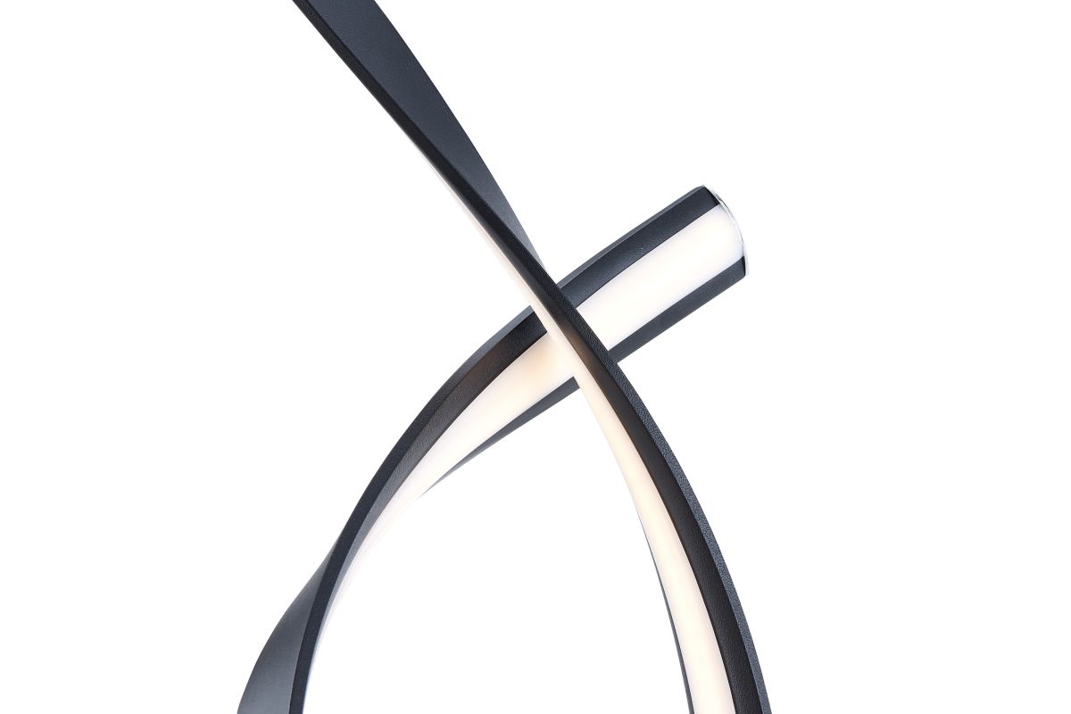 Make a bold statement with this avant-garde LED loop table lamp. Featuring a continuous ribbon of matte black metal and integrated LED light, this modern piece bends in a graceful loop, creating a captivating interplay of form and illumination. Energy-efficient and undeniably eye-catching, it’s the perfect accent for contemporary interiors, minimalist spaces, or any room in need of a functional piece of modern art.
