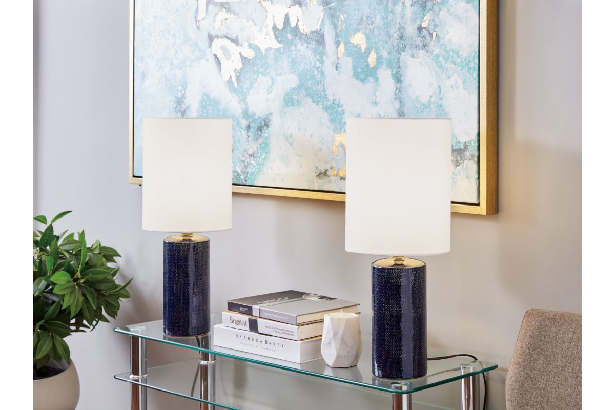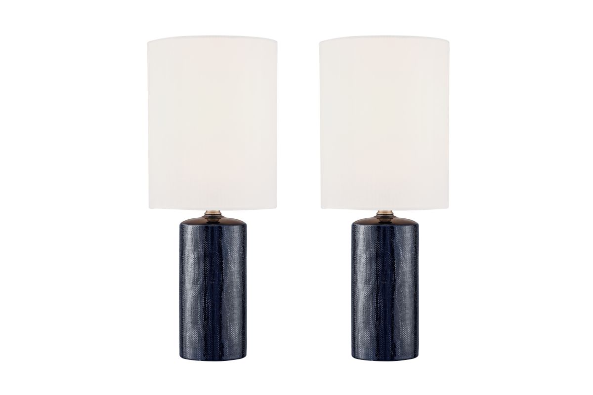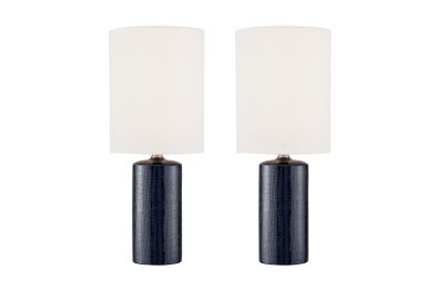 Add a touch of timeless charm with this set of two ceramic cylinder table lamps. Featuring a deep navy blue glazed base with subtle texturing and a crisp white drum shade, these lamps offer a perfect blend of classic and contemporary design. Ideal for bedrooms, living rooms, or entryways, the neutral palette ensures easy styling across a variety of décor themes. Soft, ambient lighting completes the look for a warm and inviting atmosphere.