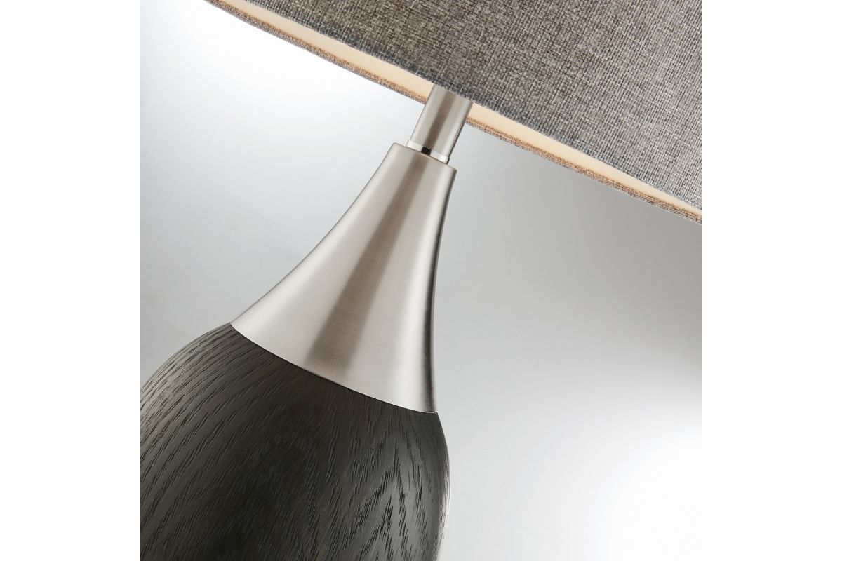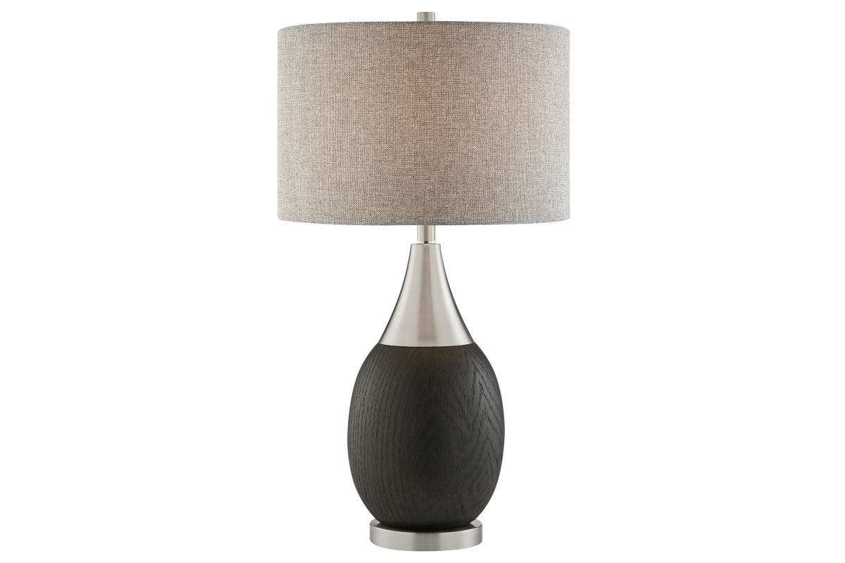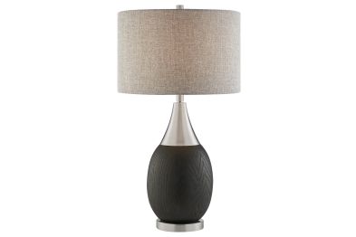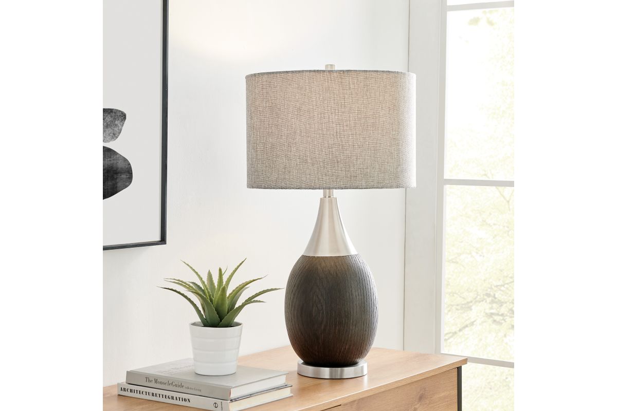 Provide ample lighting for your modern living room space with this wood grain resin and metal table lamp.A wood grain finish and metal accents play off one another. The curvy resin base boasts a rich wood grain finish that is offset by a sleek metal base and accents. A gray linen drum shade completes this modern design.