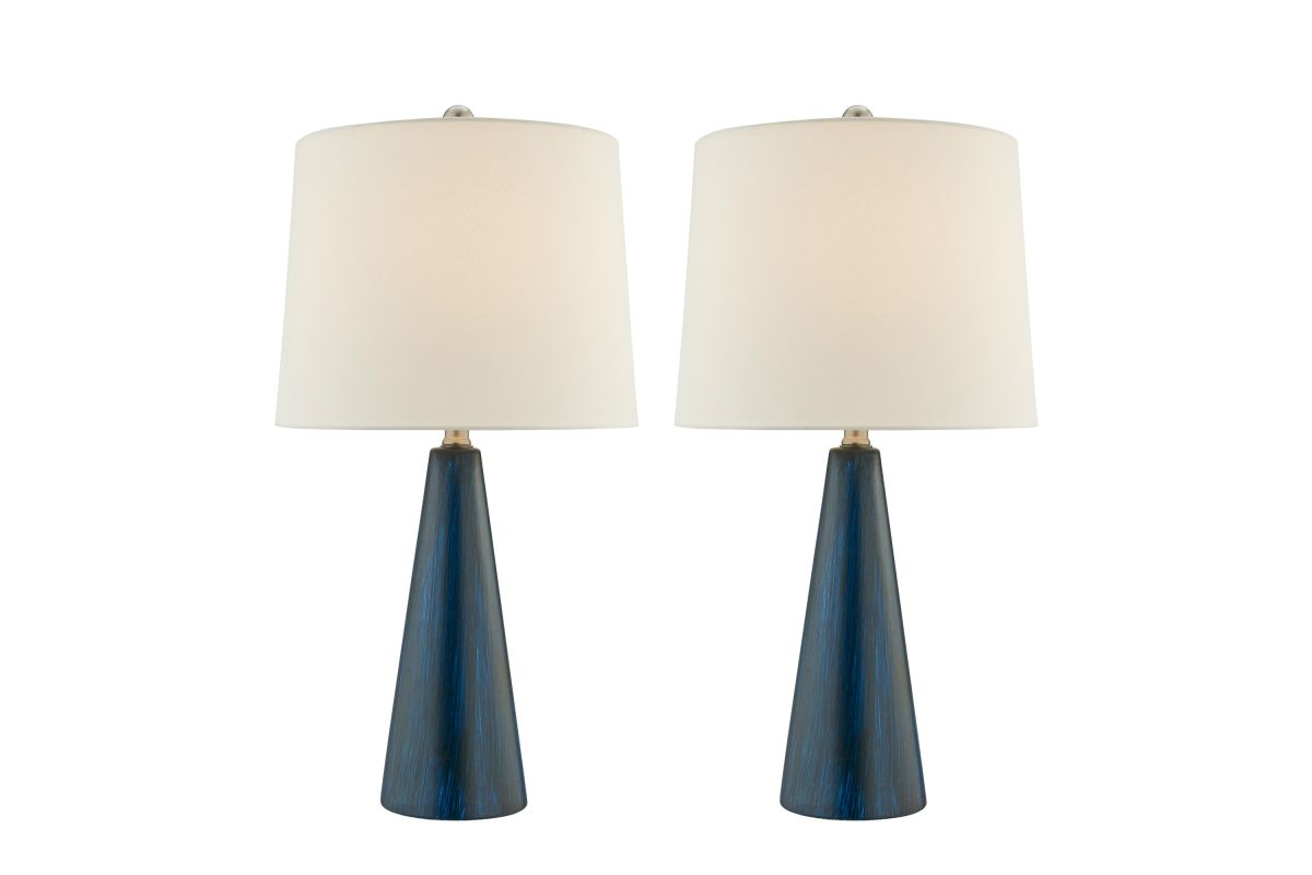 This set of two blue ceramic table lamps offers a refreshing look for modern or coastal style decorating. Each lamp features a hand-crafted water-flow design that offers a natural elegant look. The design is topped by a white fabric tapered drum shade. An ideal look for a contemporary or coastal style room.