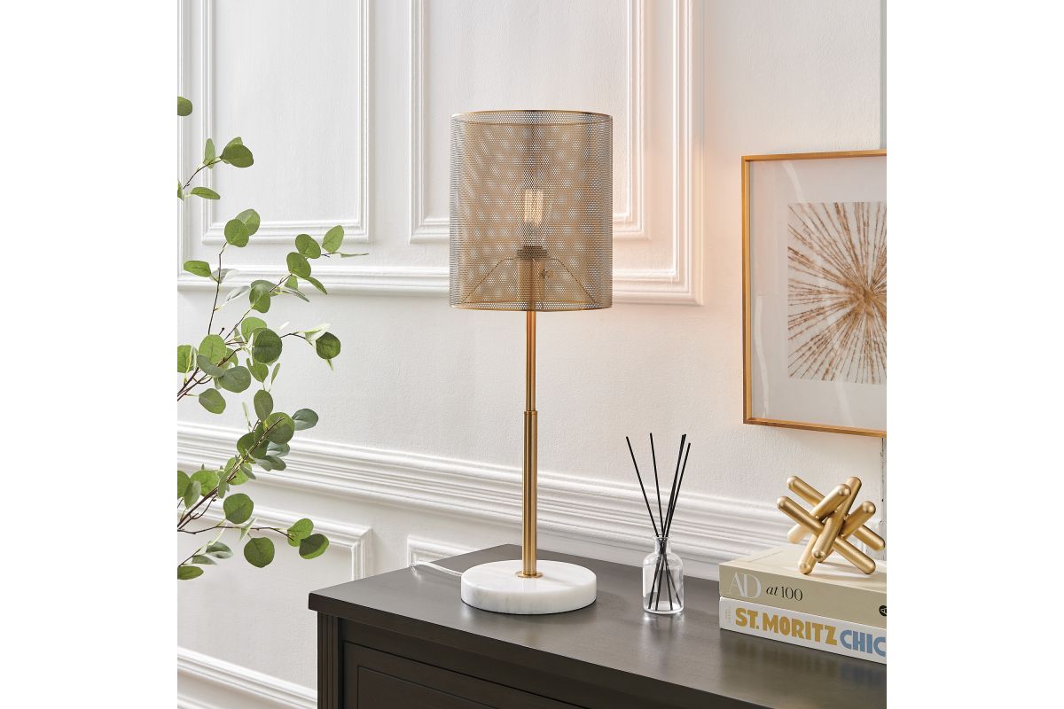 This table lamp in a lustrous gold finish evokes timeless elegance and sophistication. The mesh drum metal shade boasts a vintage-inspired design, accentuated by the striking Edison bulb, adding a touch of mid-century charm to any space. The sturdy white marble base provides a stable foundation, making it a perfect lighting solution for any décor. This lamp is a stunning statement piece that effortlessly blends form and function, illuminating your home with a warm, inviting glow while elevating your decor to new heights.