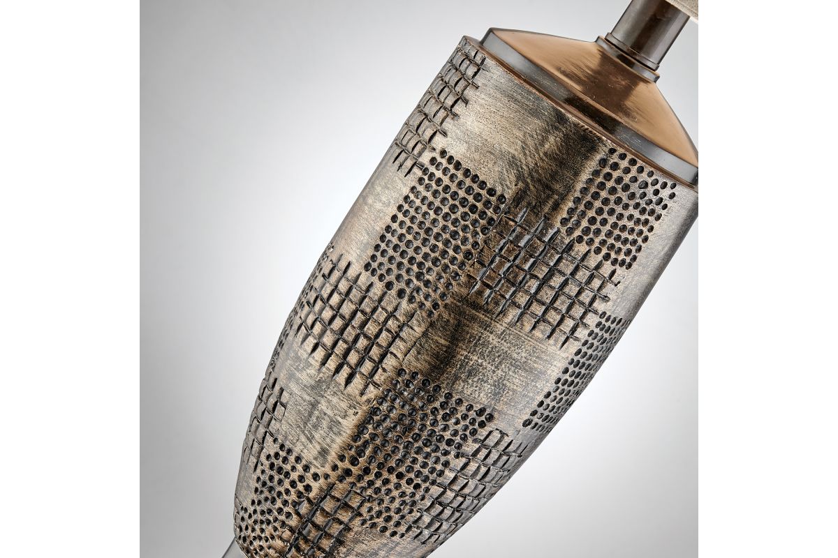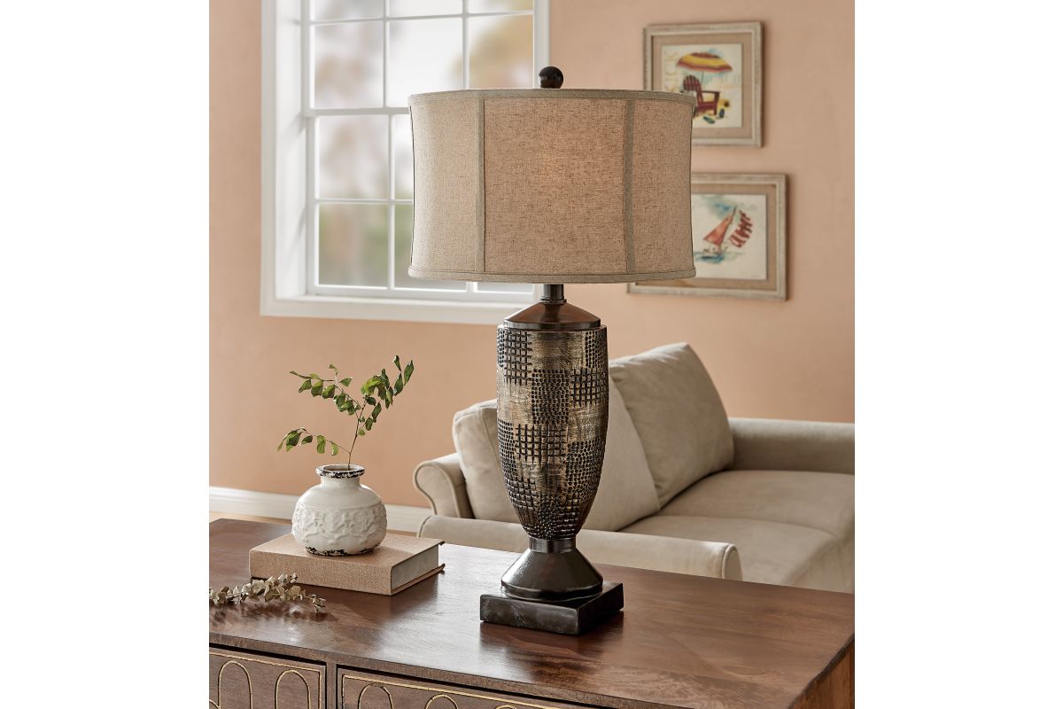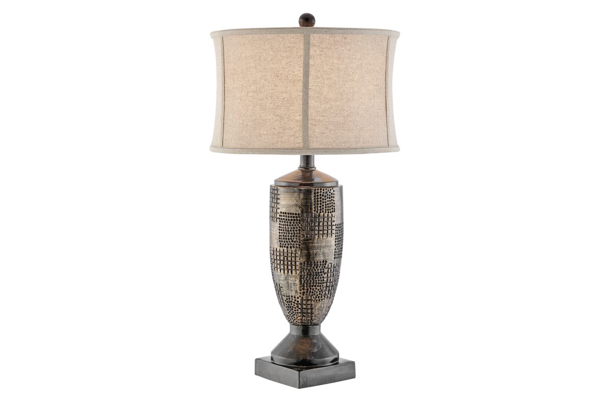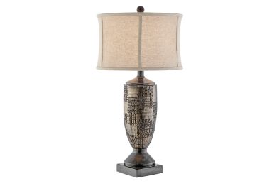Introducing our stunning transitional-style table lamp that exudes timeless elegance and charm.Crafted with exquisite attention to detail, this lamp features a hammered antique pewter finish made in resin that lends it a touch of rustic sophistication. The bell-shaped linen shade adds warmth to the overall look and creates a cozy ambiance in any room. Whether you're looking to add some character to your living space or upgrade your home decor, this lamp is sure to make a statement.