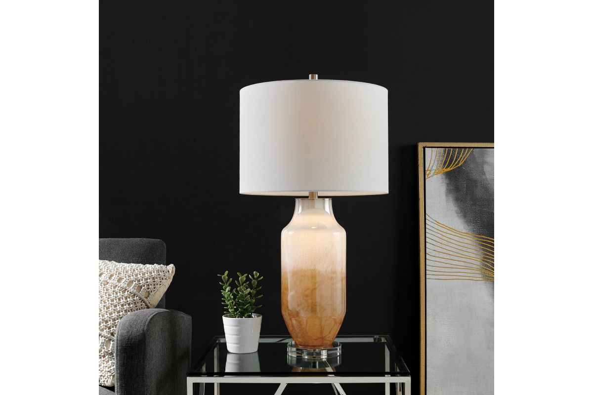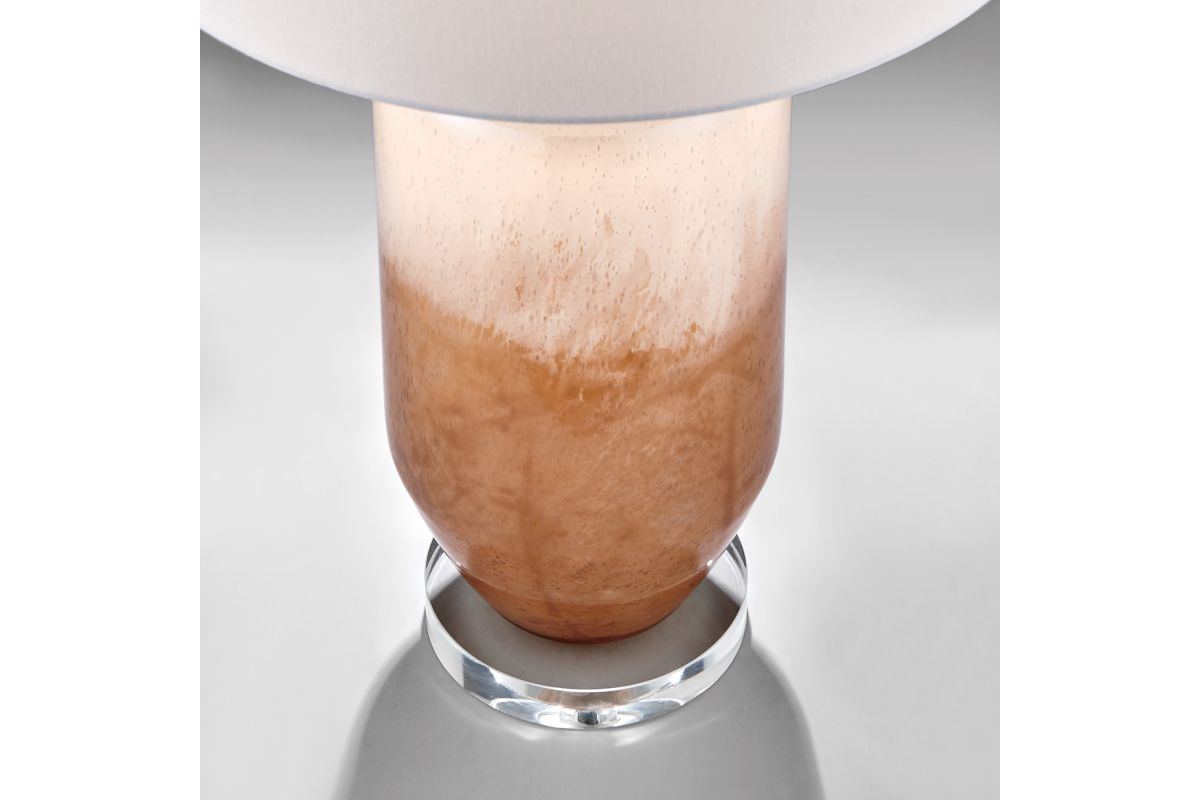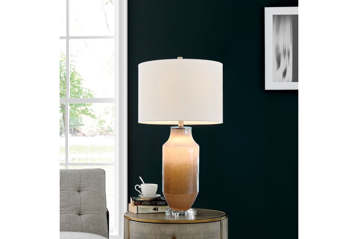 Crafted with expert precision and care, this modern hand-made art glass table lamp is a stunning work of art. Its lustrous amber gradient tone captures the essence of light and shadows, creating a captivating play of colors that enchants both day and night. The LED night light adds a sparkling touch to the exquisite crystal base, while the glass body glows with a warm radiance that imbues the space with a sense of tranquility and beauty. Topped with a white drum shade, this lamp is a masterpiece that will elevate any room to new heights of elegance and sophistication.