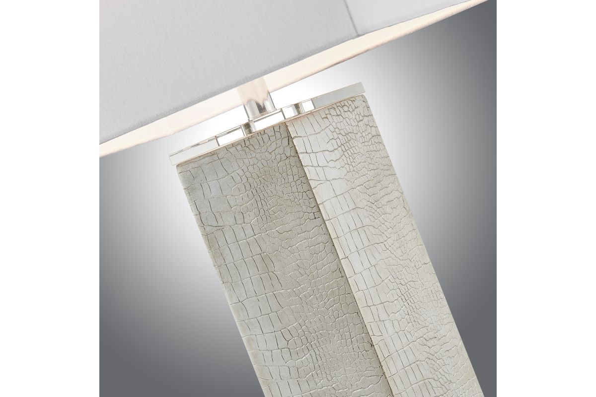 Elevate your contemporary decor with our stunning 30" table lamp. Its exquisite champagne silver finish, adorned with a crocodile skin motif in cast resin construction, adds a touch of modern luxury to your space. The lamp boasts a heavy crystal base and accent piece that sparkles with sophistication, enhancing any room's ambiance. Topped with a crisp white rectangle fabric shade, it emits a soft and elegant glow, creating a captivating focal point in your interior design. Illuminate your space with the chic and glamorous charm of this champagne silver table lamp.